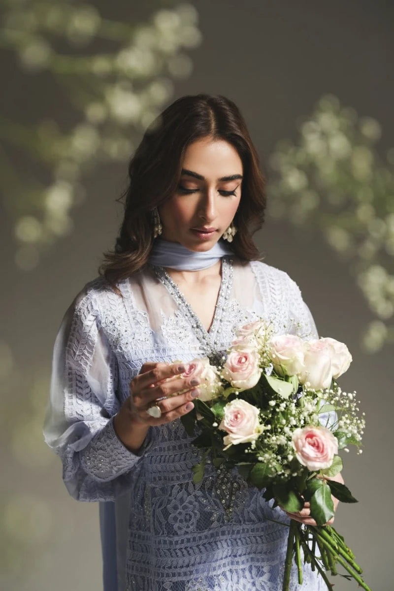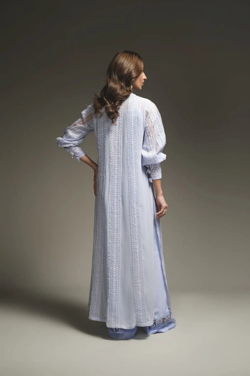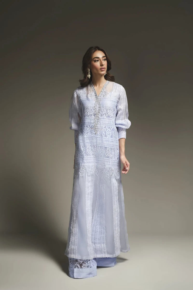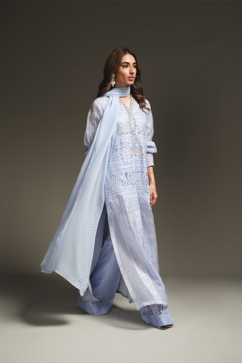 This Windsor blue ensemble showcases a long lacy shirt crafted from pure chiffon and organza, featuring intricate embroidery and delicate lace details enhanced with Swarovski work. The dupatta, made of chiffon, is elegantly adorned with subtle lace along the edges, adding a graceful touch to the look. The matching wide-legged silk trousers are embellished with embroidered trims that perfectly complement the shirt, creating a cohesive and flowing silhouette.