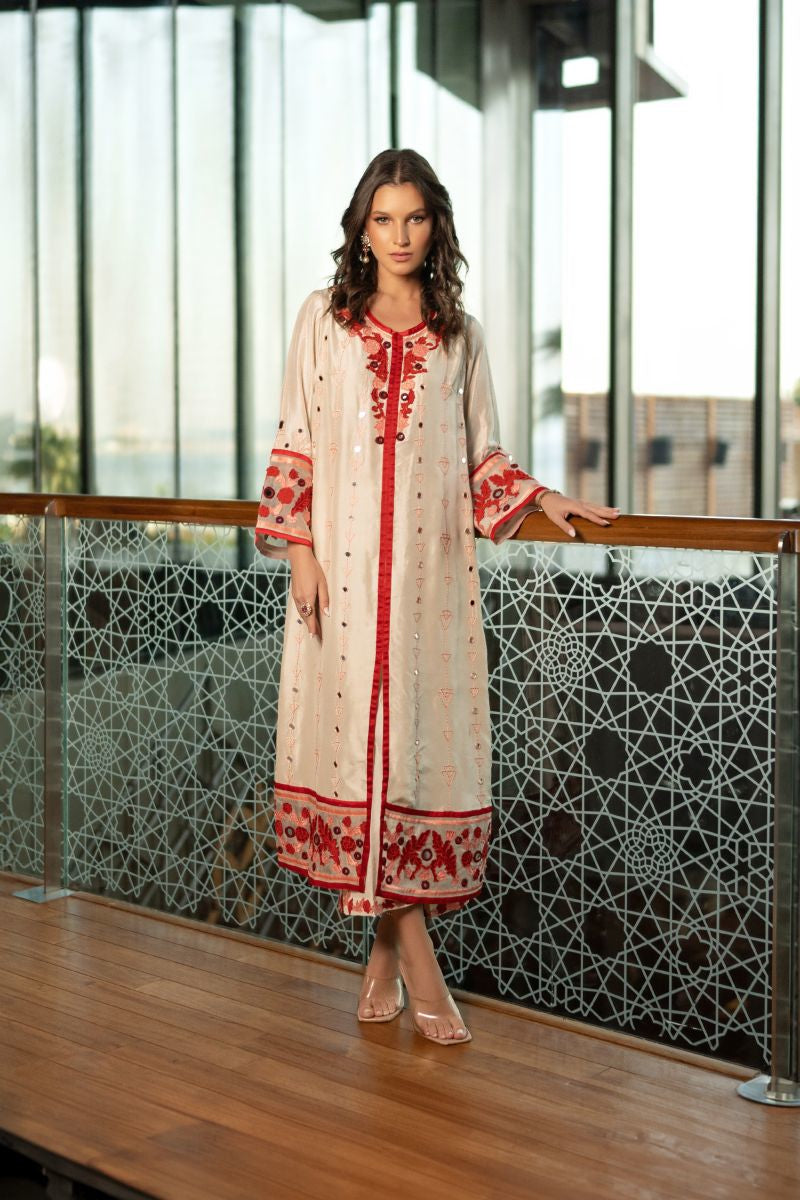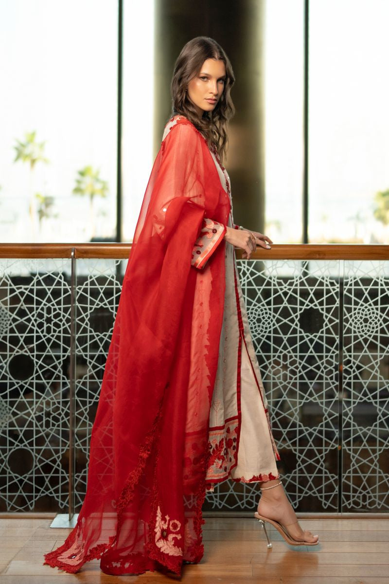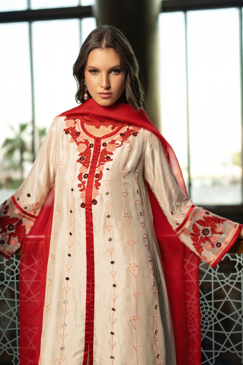 This stunning ensemble features a long raw silk shirt adorned with mirrors and intricate embroidery, complemented by a luxurious red organza dupatta with ornate edges. The look is completed with Korean raw silk pants, merging traditional grace with contemporary sophistication.