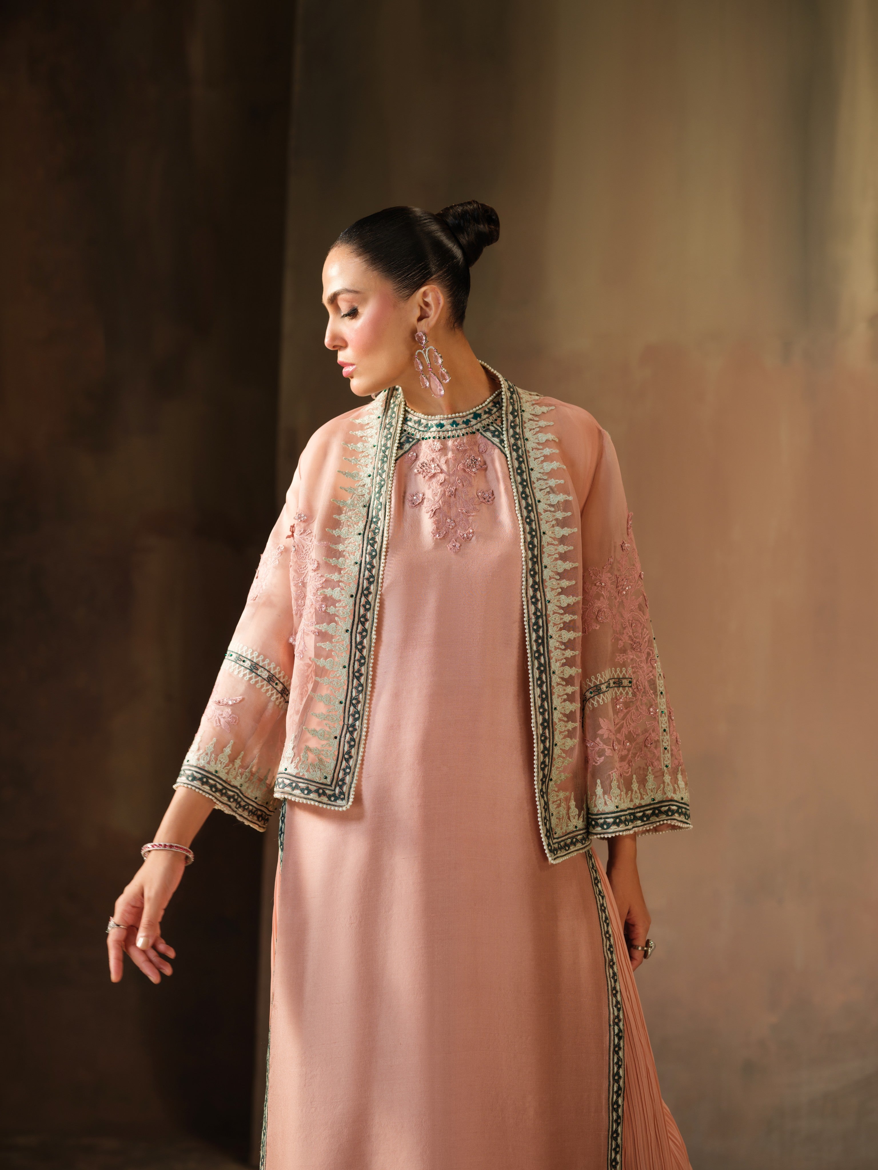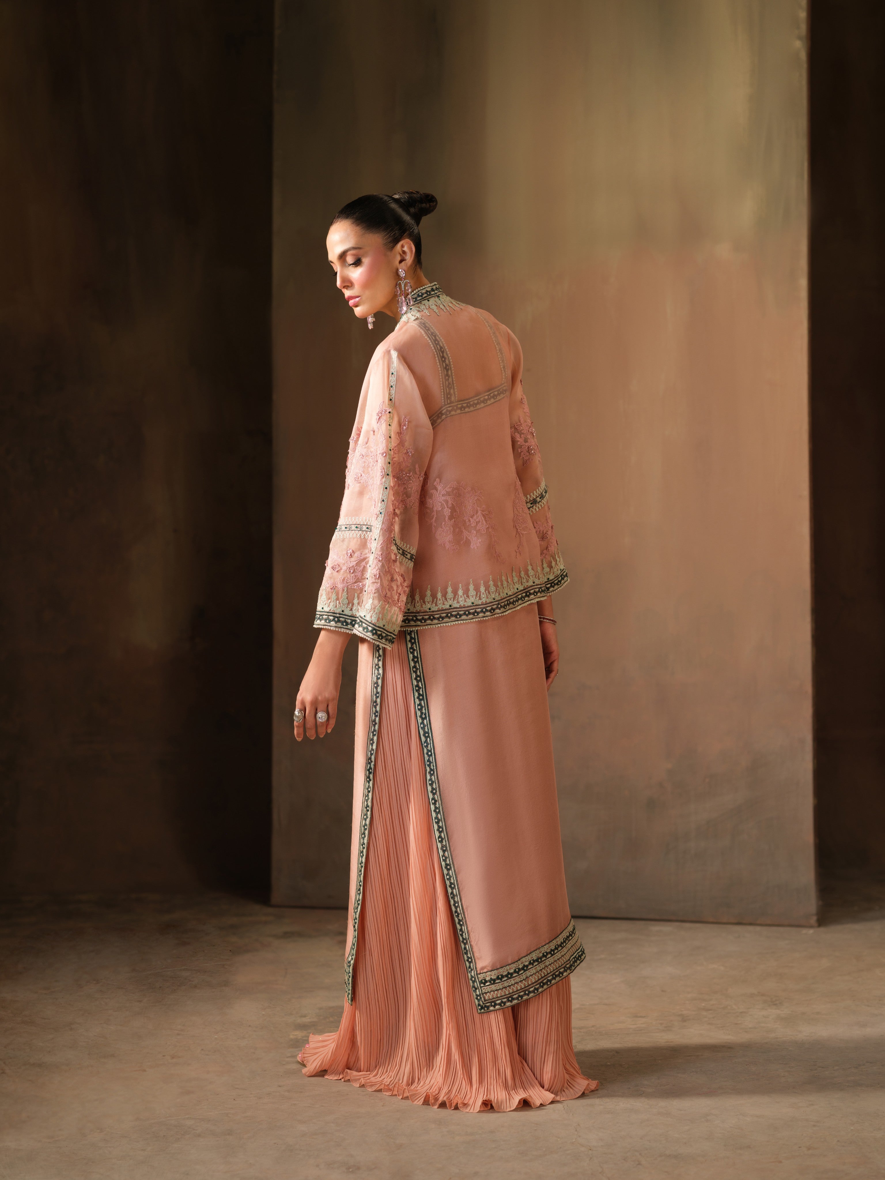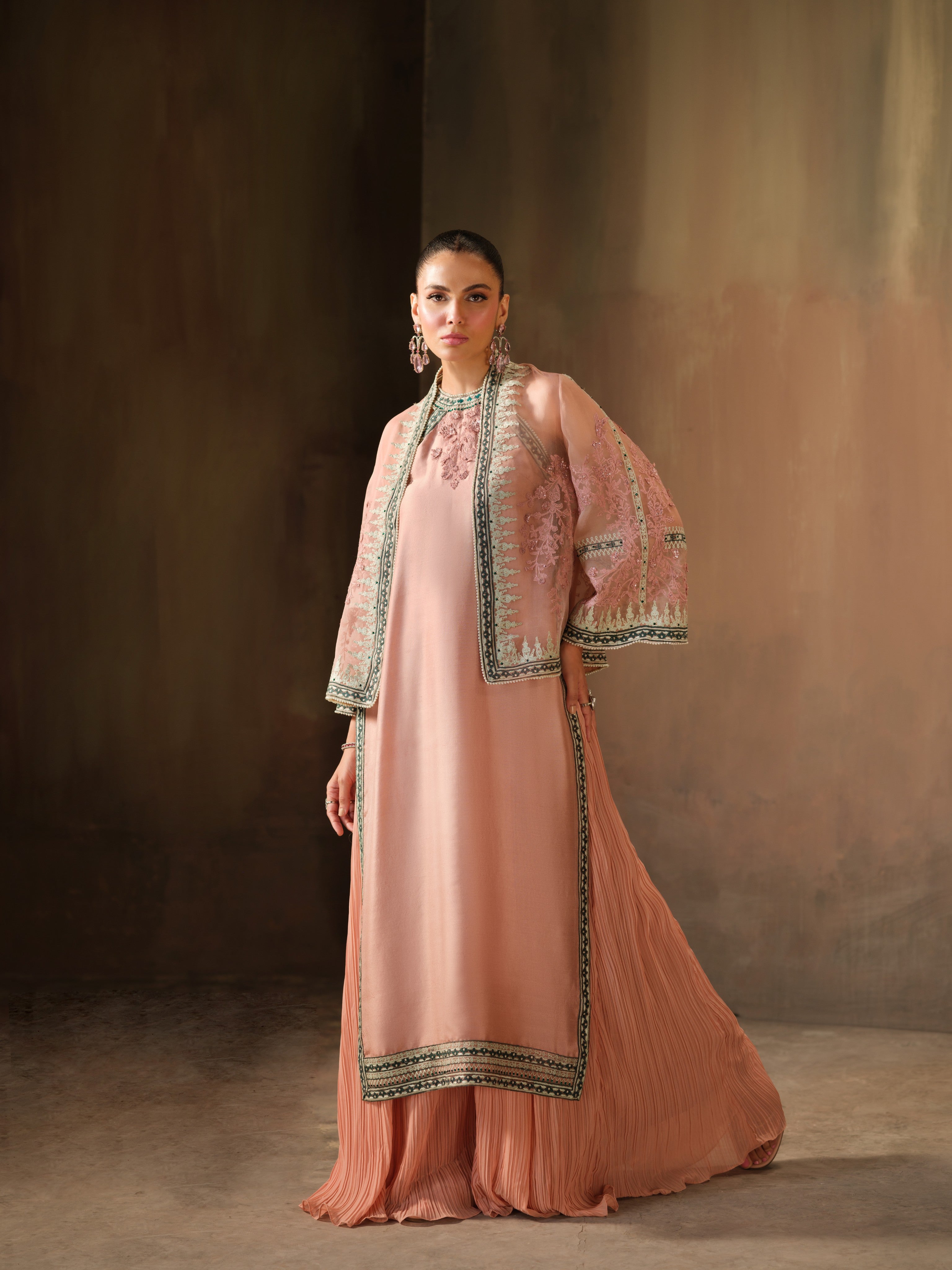 This soft blush-toned ensemble exudes sophistication with a modern edge. It features a pure crepe shirt adorned with delicate embroidery and subtle Swarovski detailing on the neckline, paired with voluminous crushed crepe silk pants that add graceful movement to the look. The highlight is the sheer, pure organza jacket, intricately embroidered in mint and sage green tones and embellished with Swarovski crystals, offering a luxurious finish!