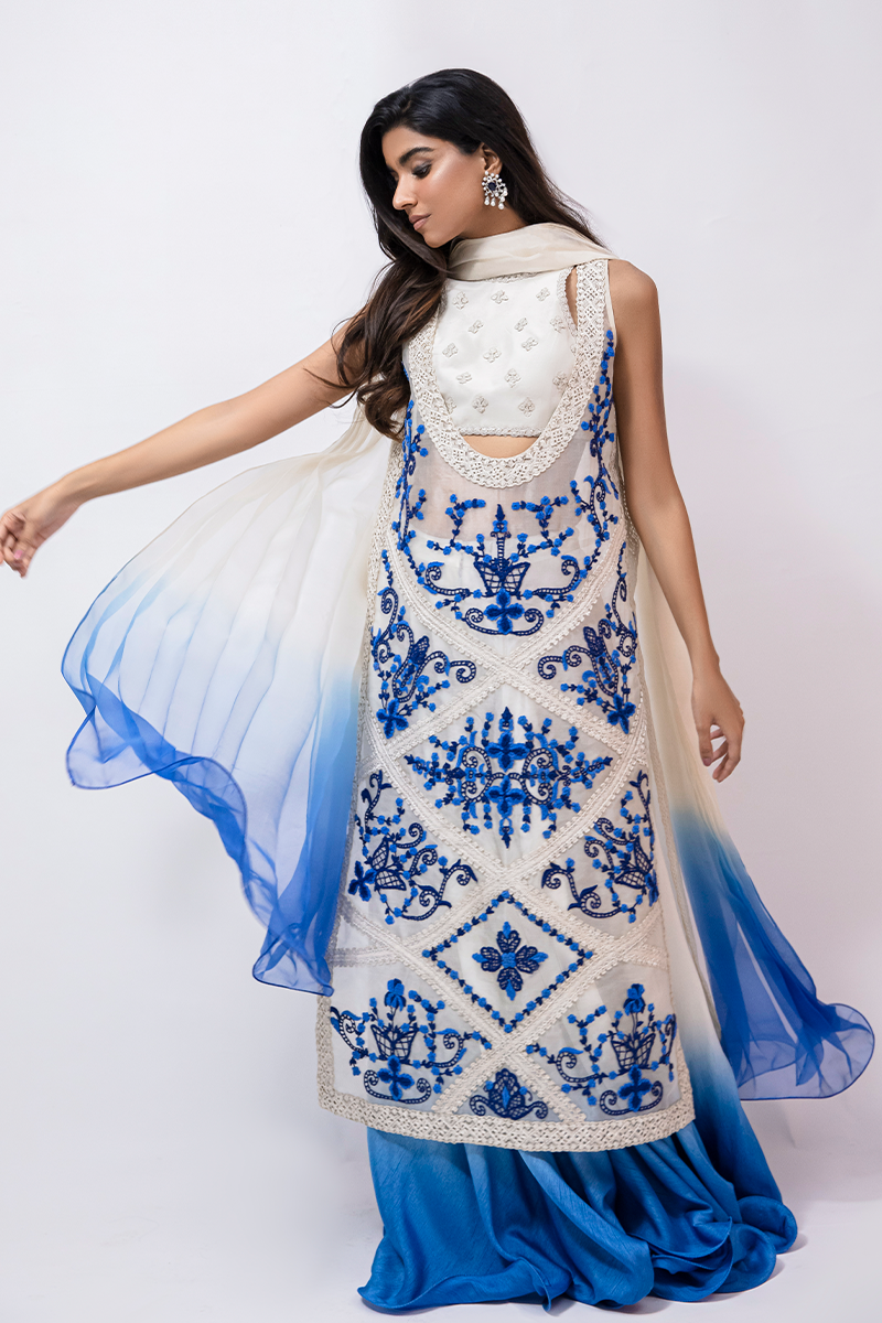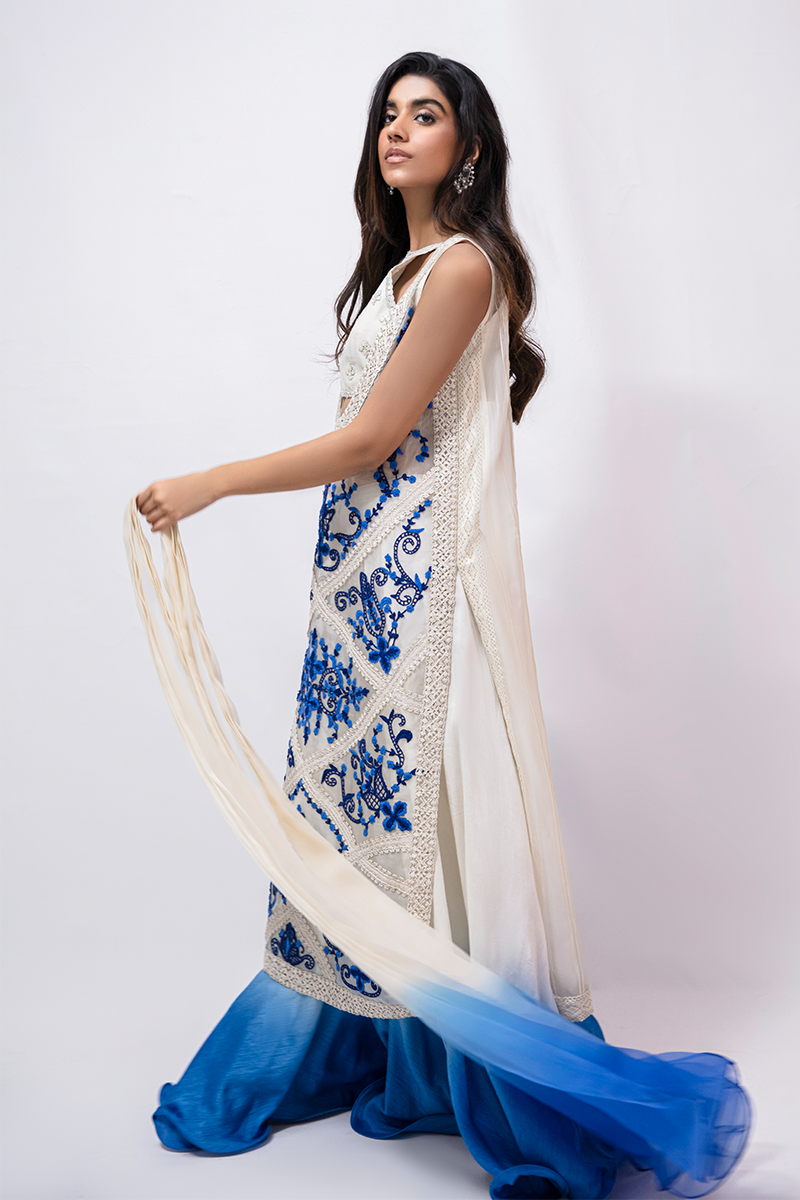 Description: Featuring a heavenly combination of white and blue, Ariana Blue is splendidly crafted on an organza base with ethereal detailing incorporating fancily embroidered floral patterns of vibrant blue and back hue. The overshirt is paired with a self-on-self white embroidered bustier, dual-shaded flared sharara pants, and a dual-toned dupatta completing this looks ethereally and making it a perfect choice for the festive season.