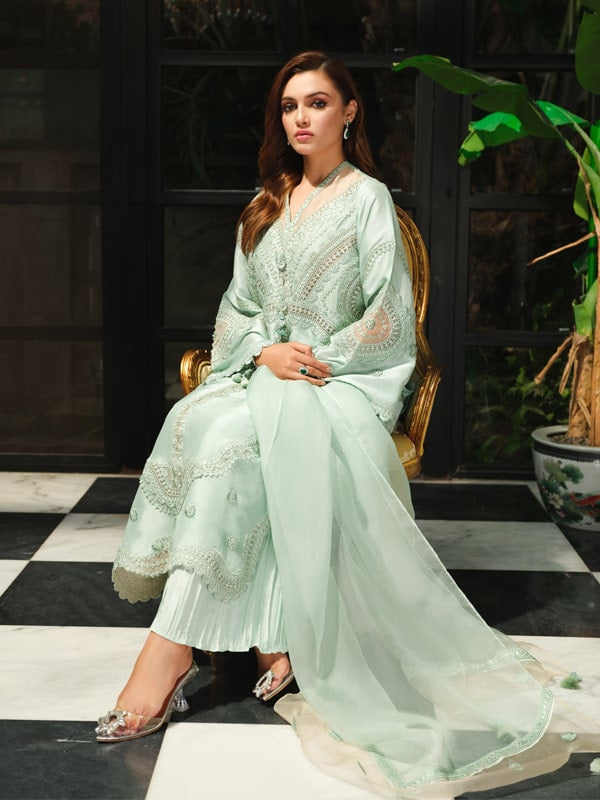 Drape yourself in refined allure with this exquisite ensemble in light teal. The raw silk shirt is adorned with intricate embroidery throughout, complemented by delicate organza details that add a touch of sophistication. Paired with Korean silk pleated pants, the outfit exudes elegance and comfort. The matching dupatta, crafted from organza with embroidery detailing, completes the ensemble, creating a harmonious and chic look that effortlessly captures attention.Â