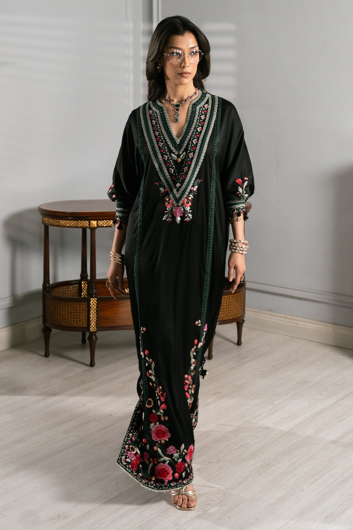 Crafted from luxurious black satin, this floor-length kaftan is a striking expression of botanical artistry, adorned with vibrant crimson and pink floral embroidery intertwined with deep emerald vine motifs. The fluid silhouette is defined by a tiered V-neckline and a central vertical panel, while floral placements frame the side slits and hem with graceful movement. Mid-length sleeves are finished with contrasting green borders and delicate tassel accents at the cuffs. Designed as a singular, flowing statement, this kaftan delivers a refined yet dramatic look!