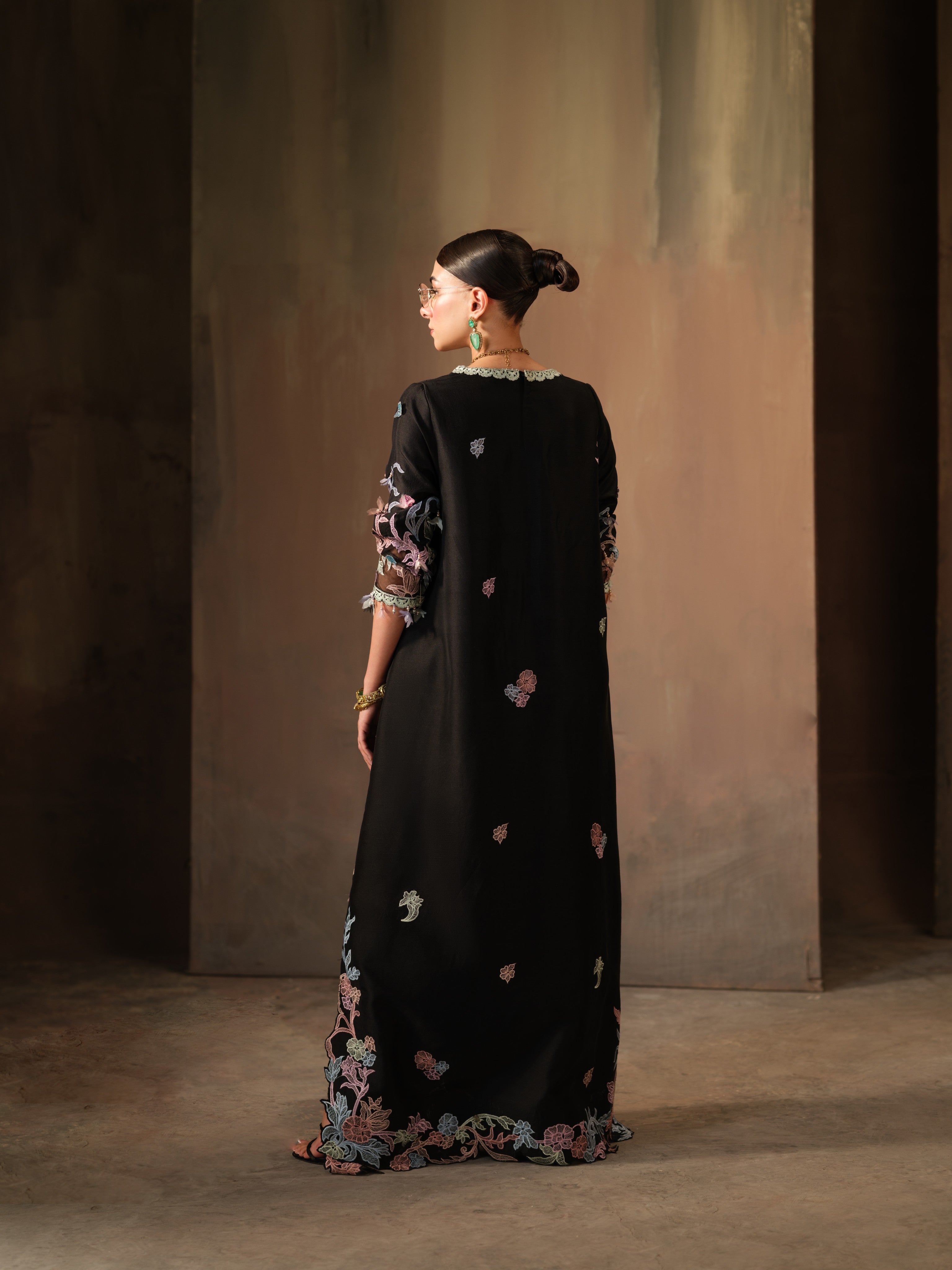 This pure raw silk kaftan features intricate multi-colored embroidery and sparkling Swarovski embellishments that add a touch of glamour to its sleek silhouette. The pastel floral motifs cascade across the black base, creating a striking contrast while maintaining a soft, feminine feel. With its relaxed fit and detailed craftsmanship, this kaftan is perfect for evening soirées, festive dinners, or intimate celebrations where style meets comfort with a contemporary twist.