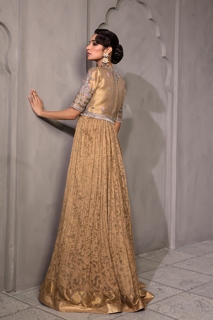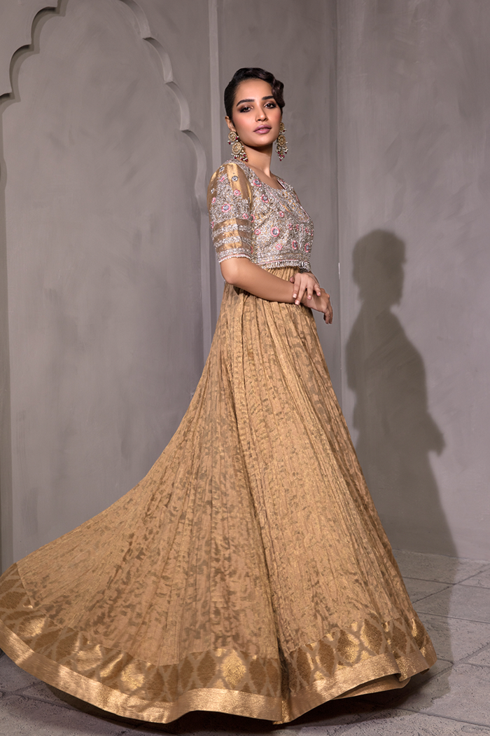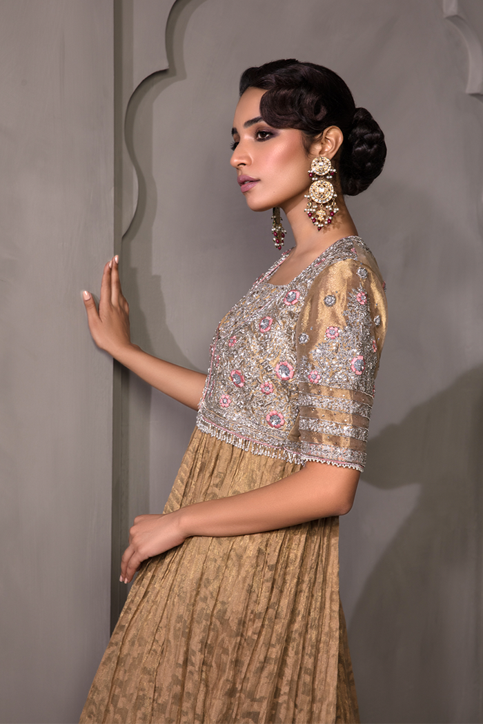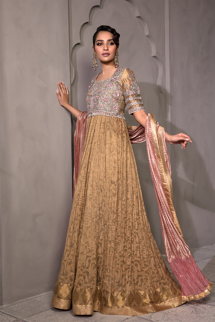 Mustard on Sliver traditional dabka and Sitara work on jacket with pink resham embellish roses along with crushed tissue dress paired with kimkhab lehnga and crushed dupatta with finishing.