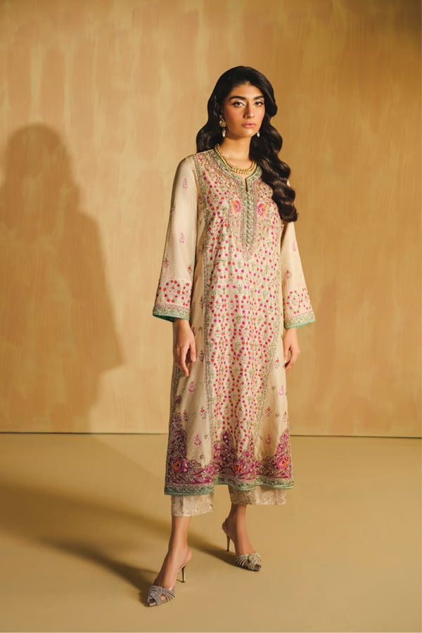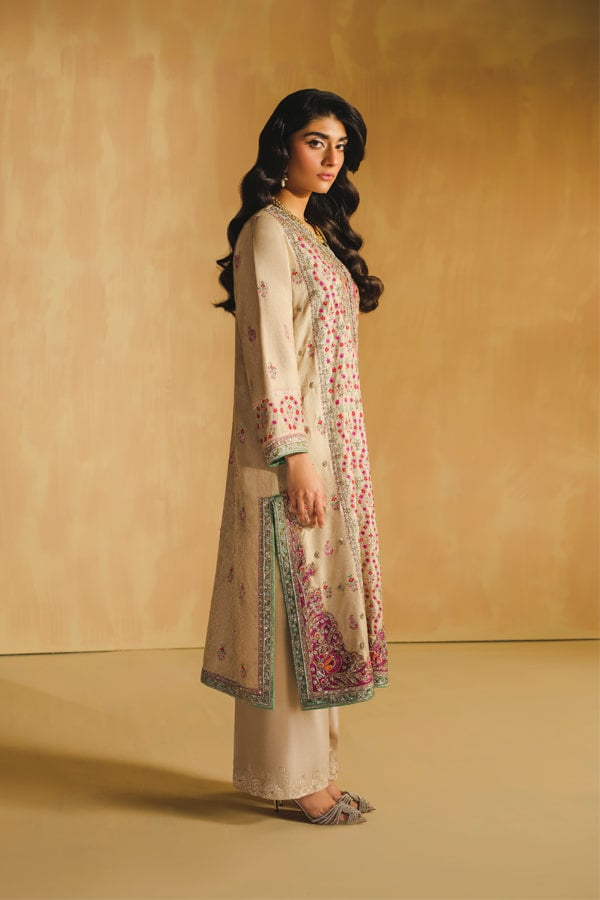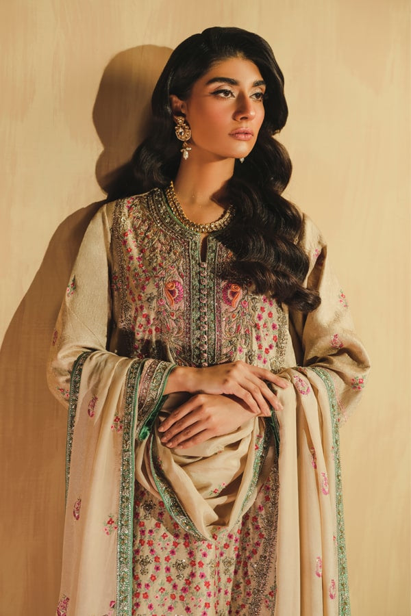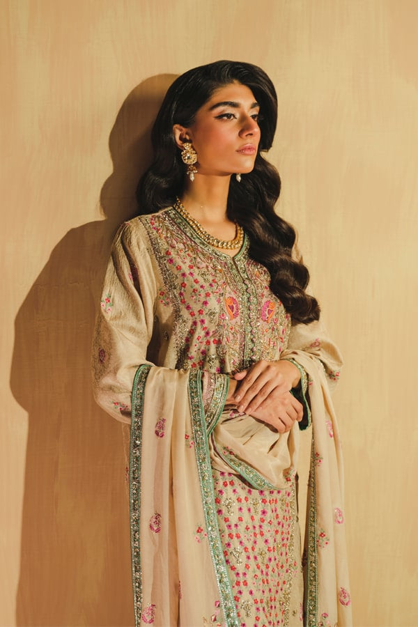 Description: This elegant nude beige ensemble showcases self-embossed silk jamawar adorned with a detailed floral threadwork jaal in rich jewel tones of ruby, emerald, and topaz. The outfit is complemented by silver dabka, naqshi bead sequence work borders, and intricate detailing. Accompanied by a satin chaadar featuring a dense Resham jaal, scattered spray, and a dabka border. Paired with a raw silk Azar trouser adorned with self-on-self work, this look exudes timeless sophistication.