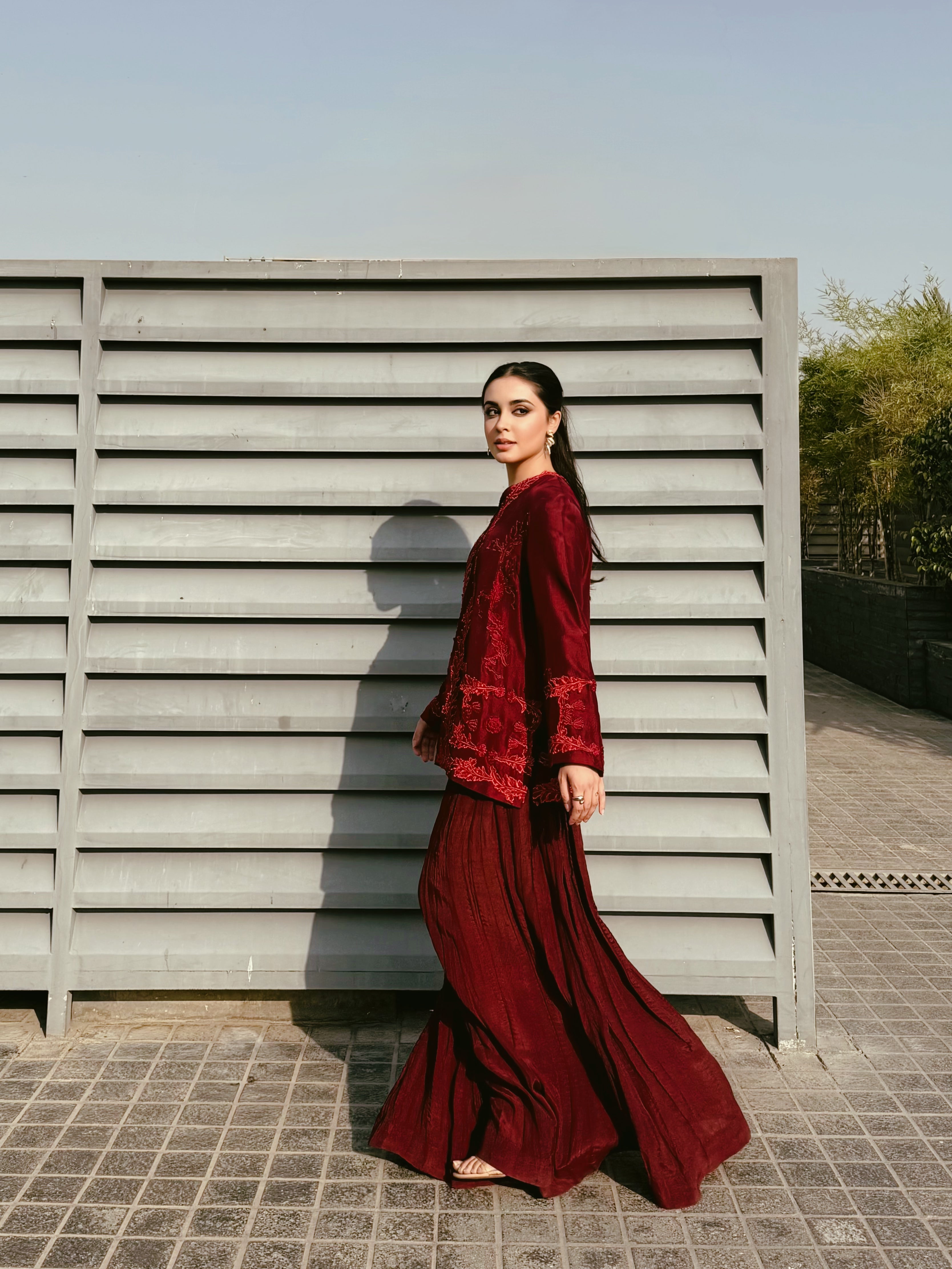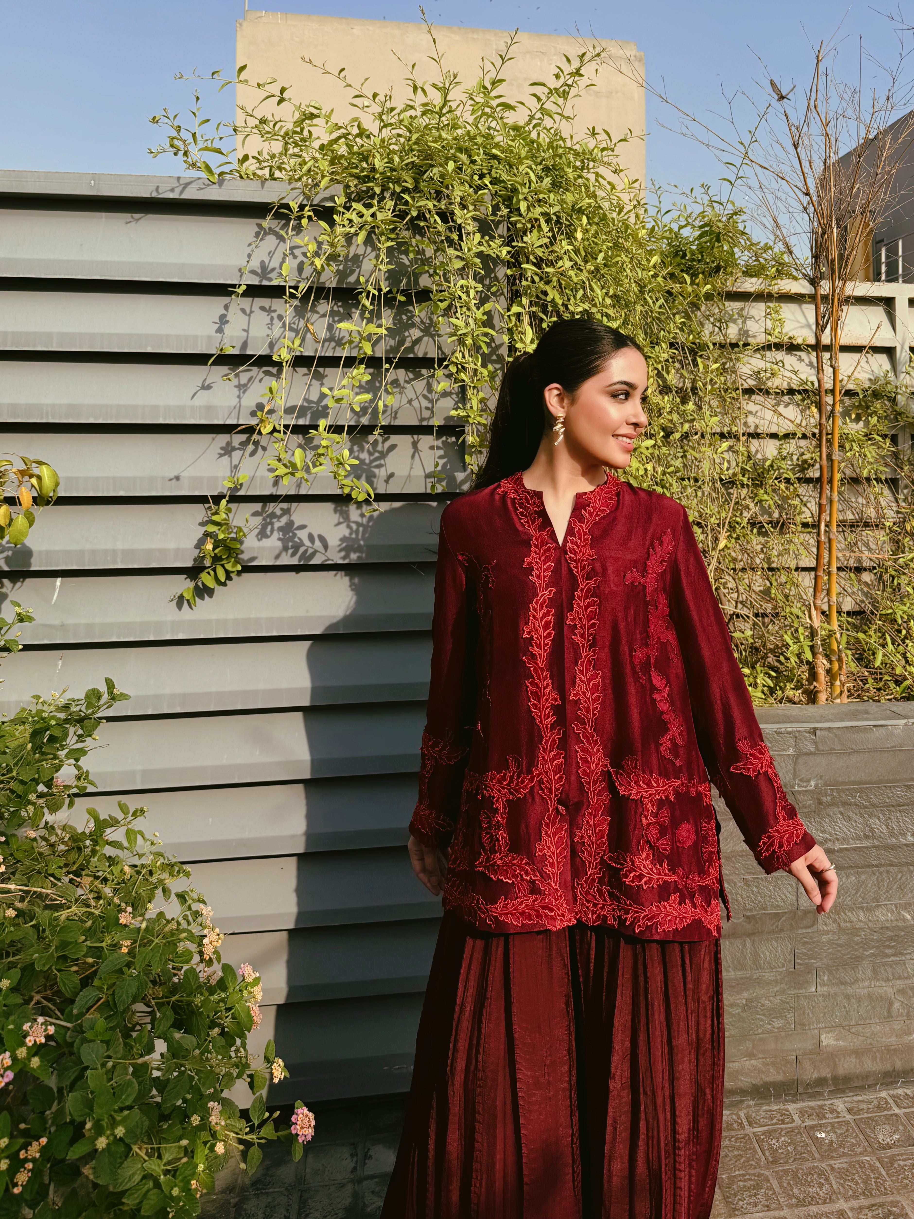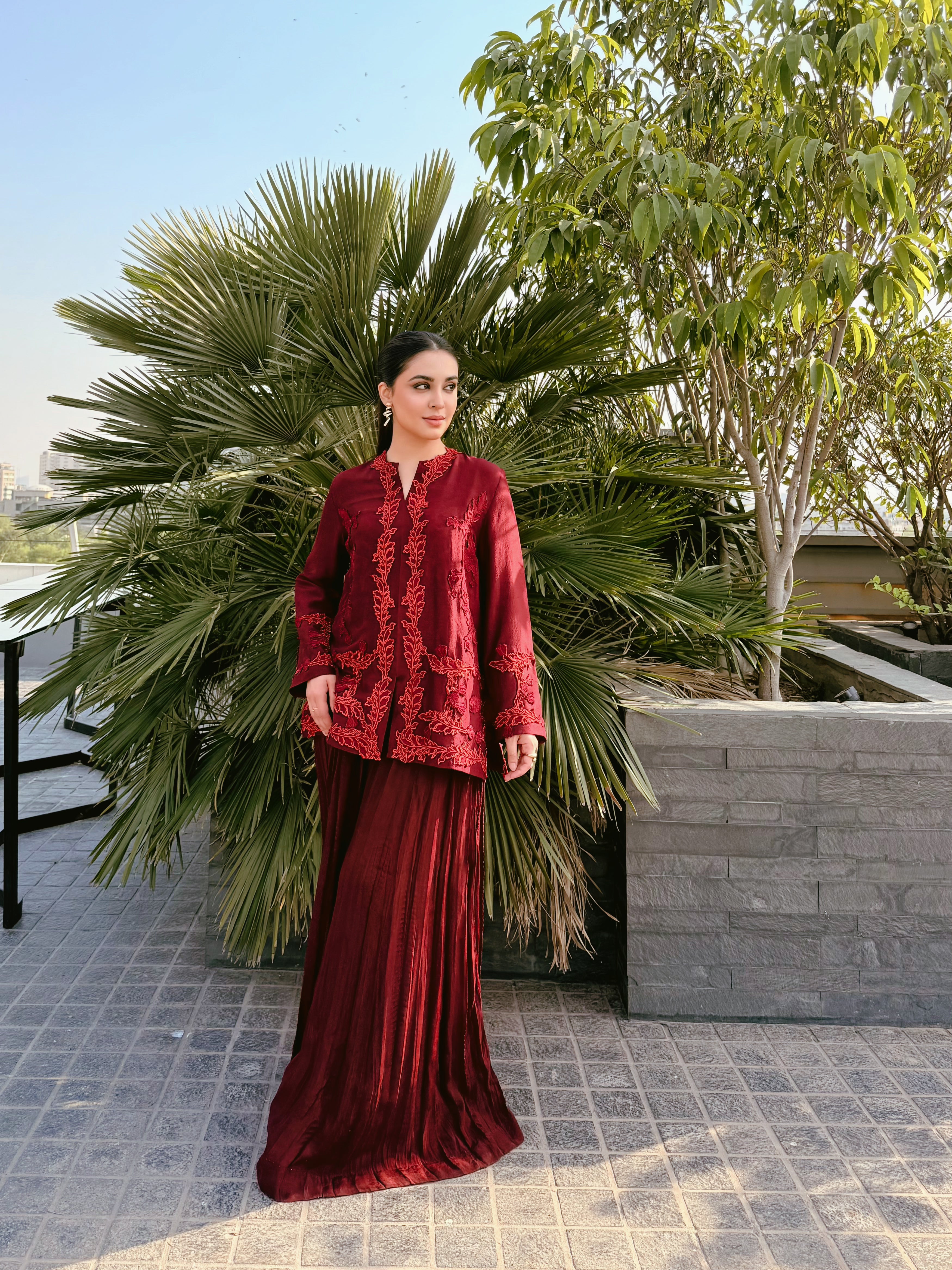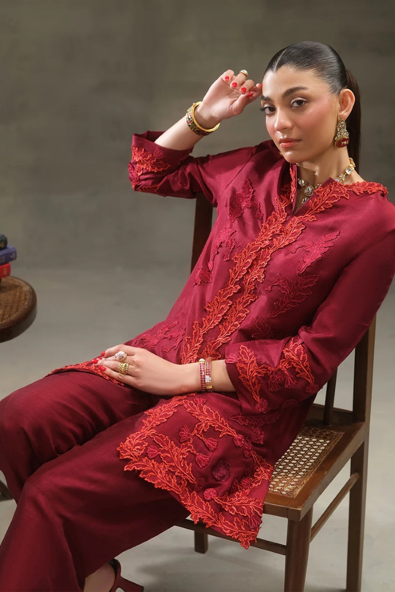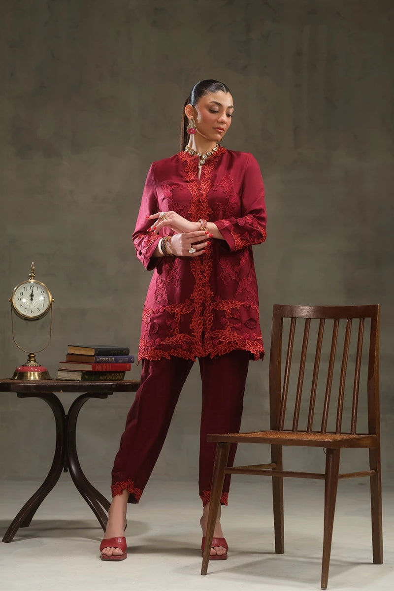 A pure raw silk front-open short shirt featuring satin appliqué embroidery, paired with a pure silk shalwar adorned with satin embroidered borders. Also available with crepe loose trousers for an alternate look.
