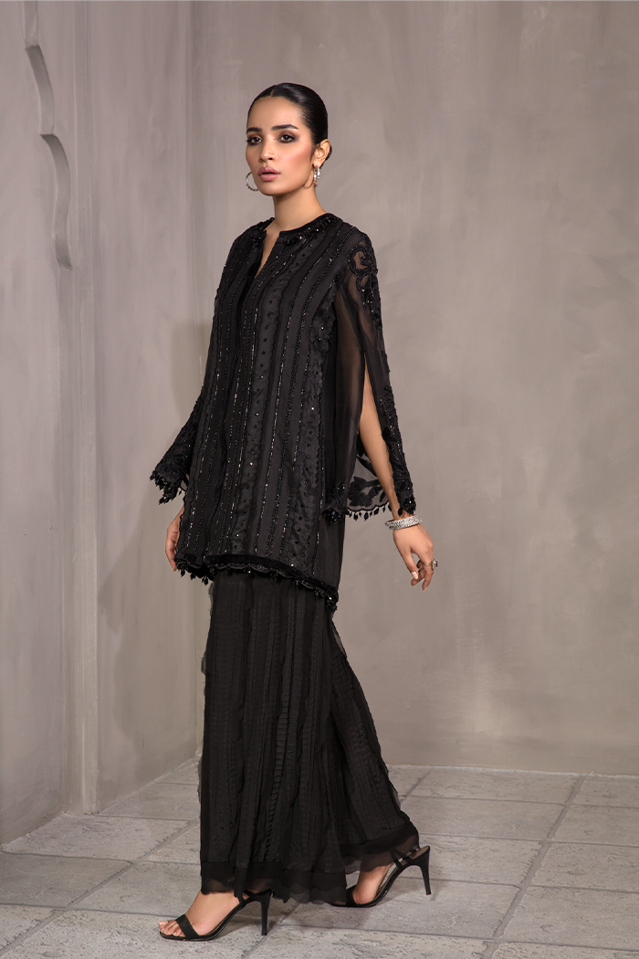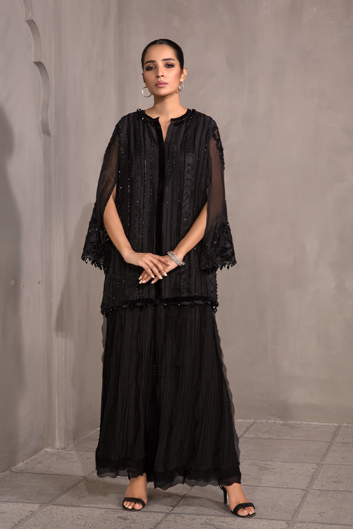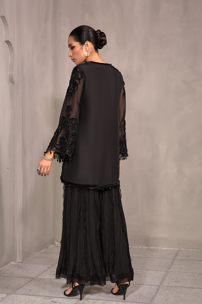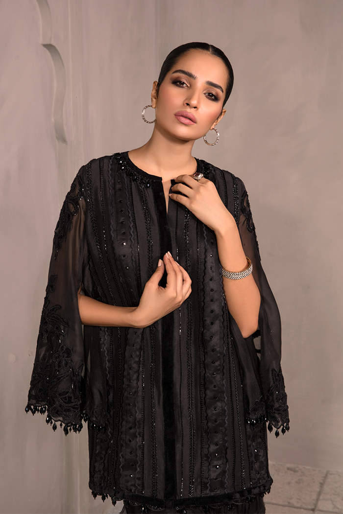 Black on Black Short length jacket with self-colored sequence, beads work, crystal and cut dana with velvet applique and finishing paired with bustier and crush pants