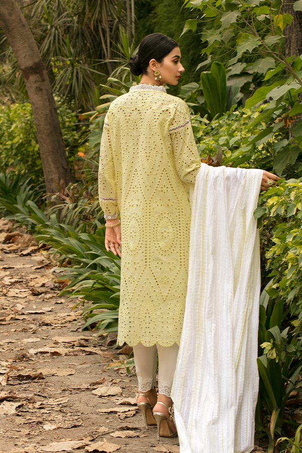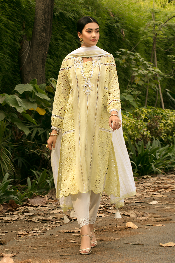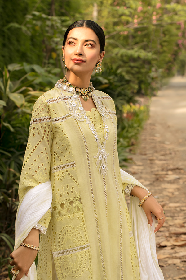 Description: A radiant display of elegance is embodied by Citrine featuring chikan canvas rendered in a soft yellow hue enhanced with mirror work and laces. Paired along is a beautifully draped swiss voile dupatta and cotton azaar pants wondrously finishing the elegant look!
