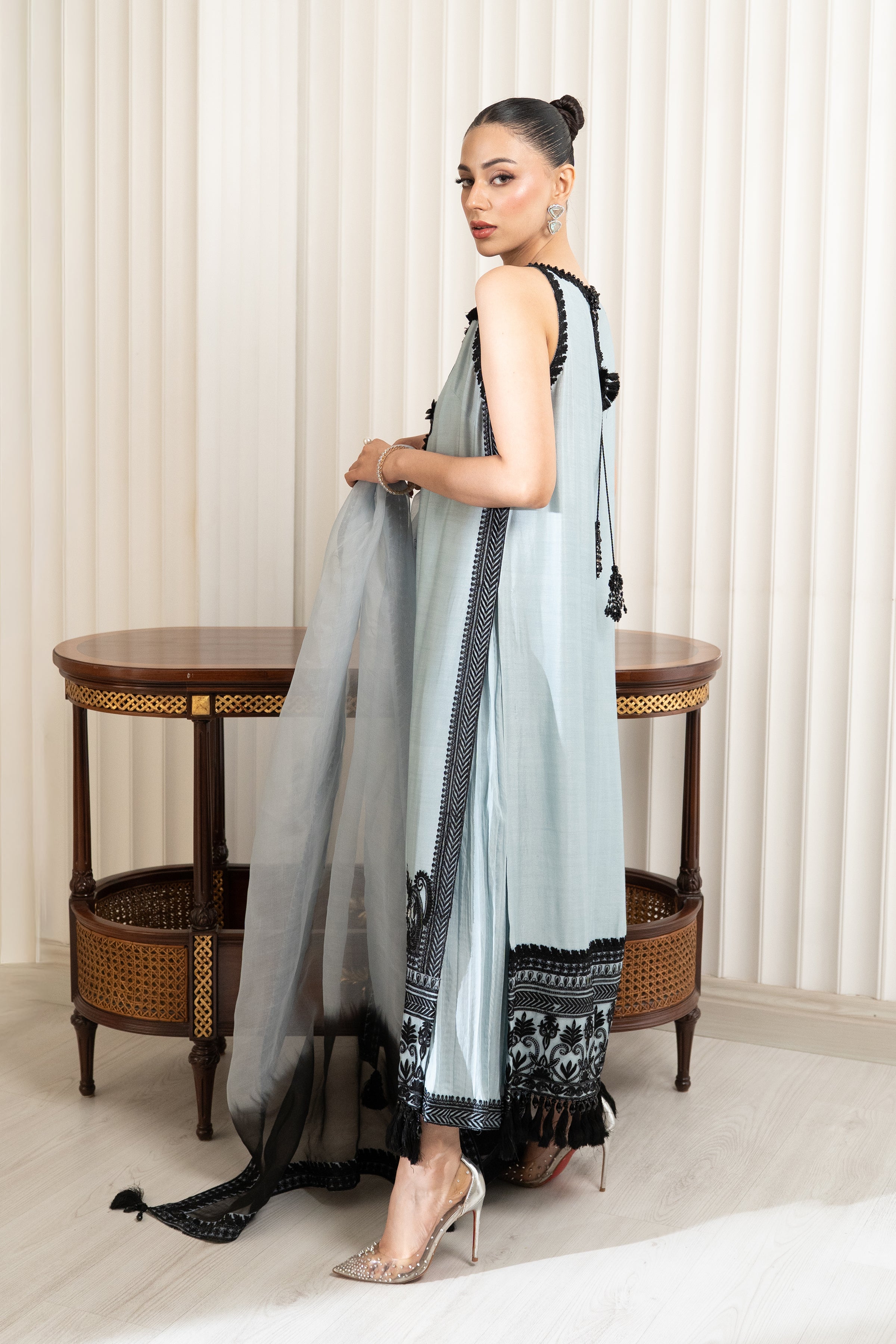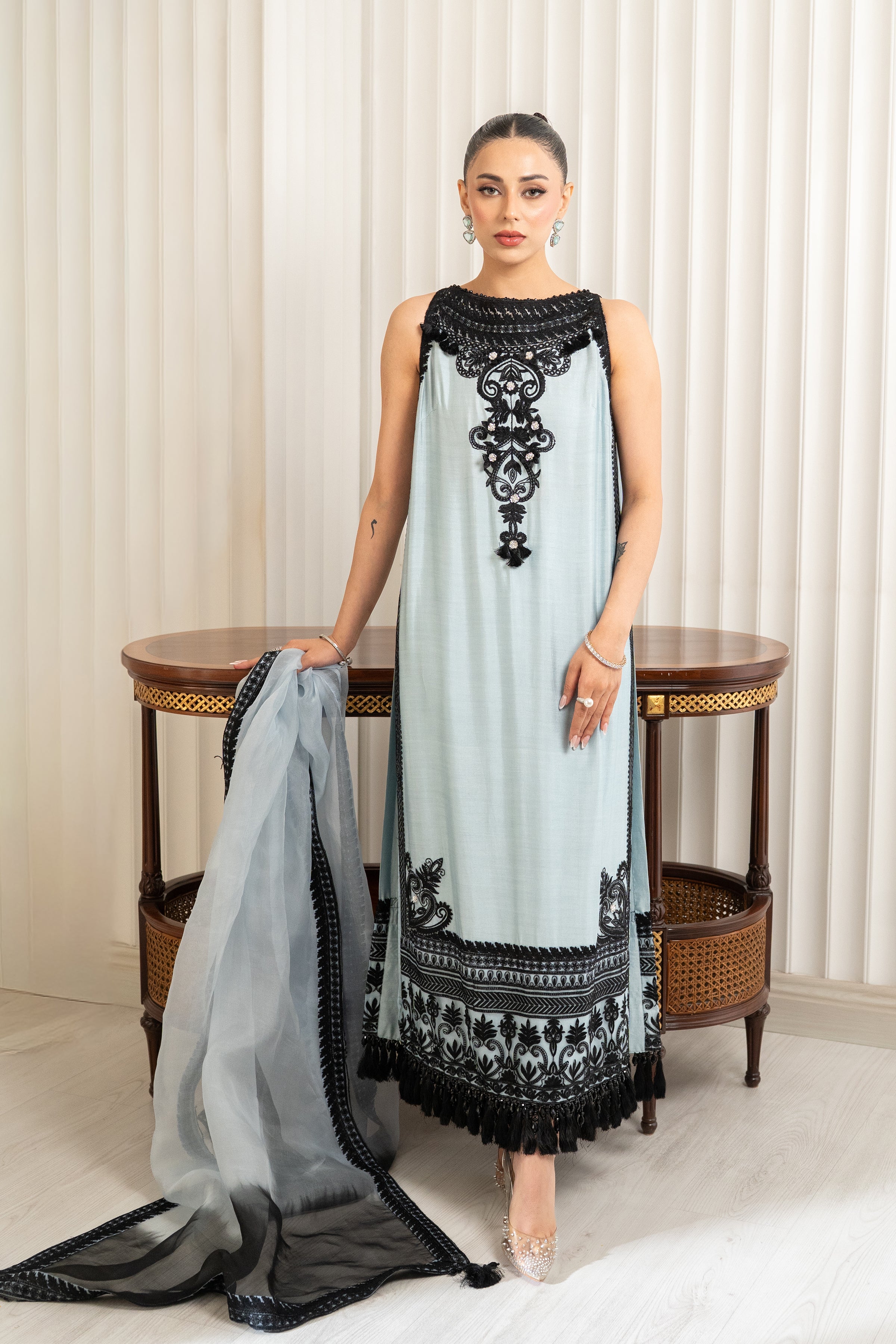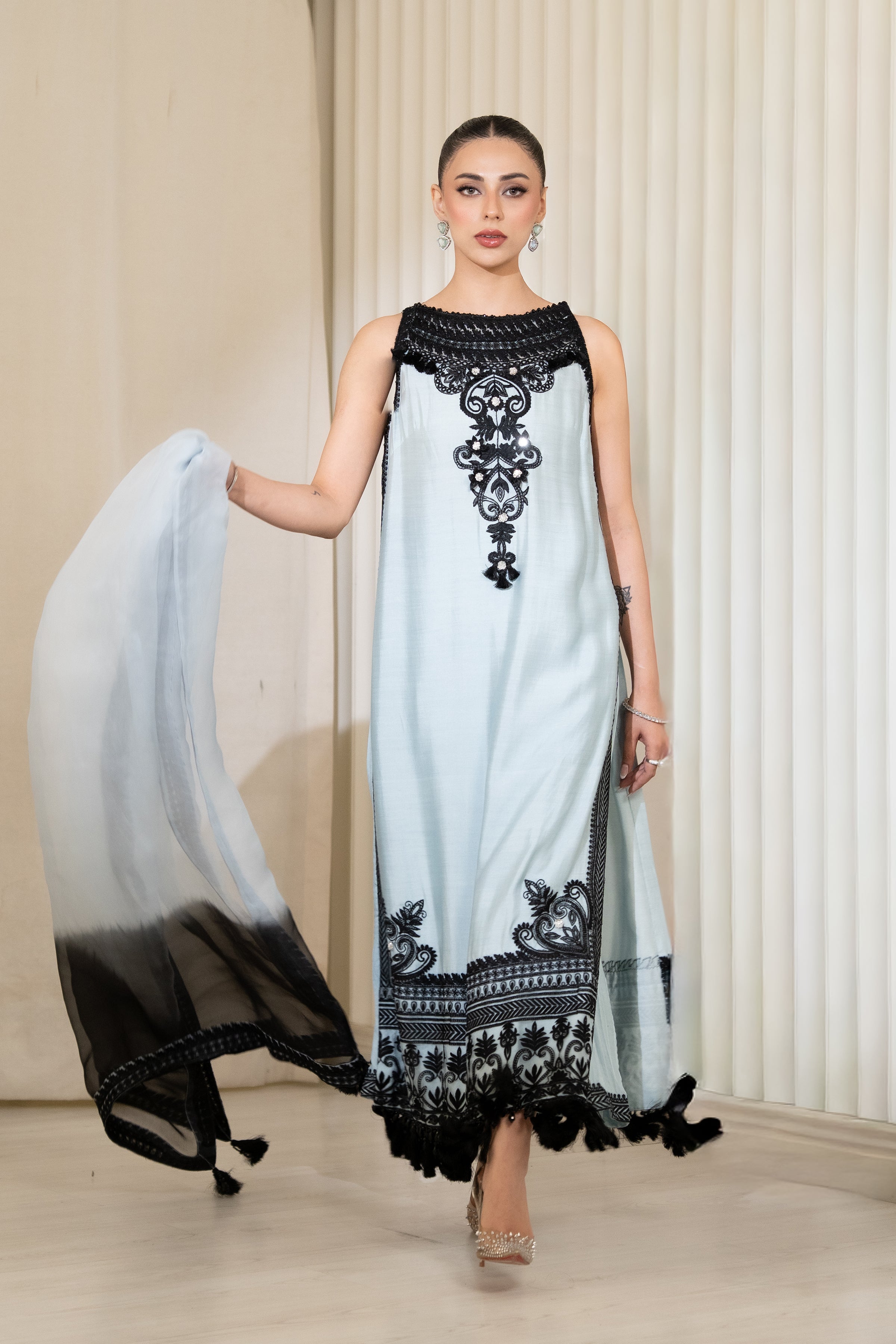 This exquisite ensemble features a flared jacket shirt crafted from silk khaadi crepe. The shirt is beautifully adorned with intricate embroidery borders and appliqué detailing. It is paired with flared pants in the same silk khaadi material, which also showcases elegant embroidery. A striking silk net dupatta with fine embroidery and lace finishings completes the look!