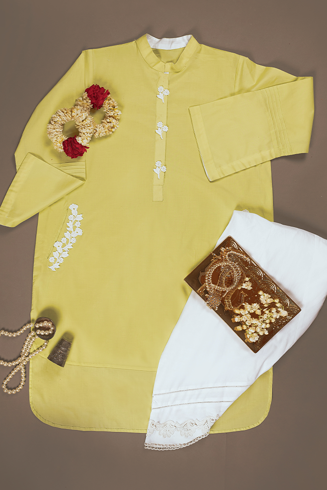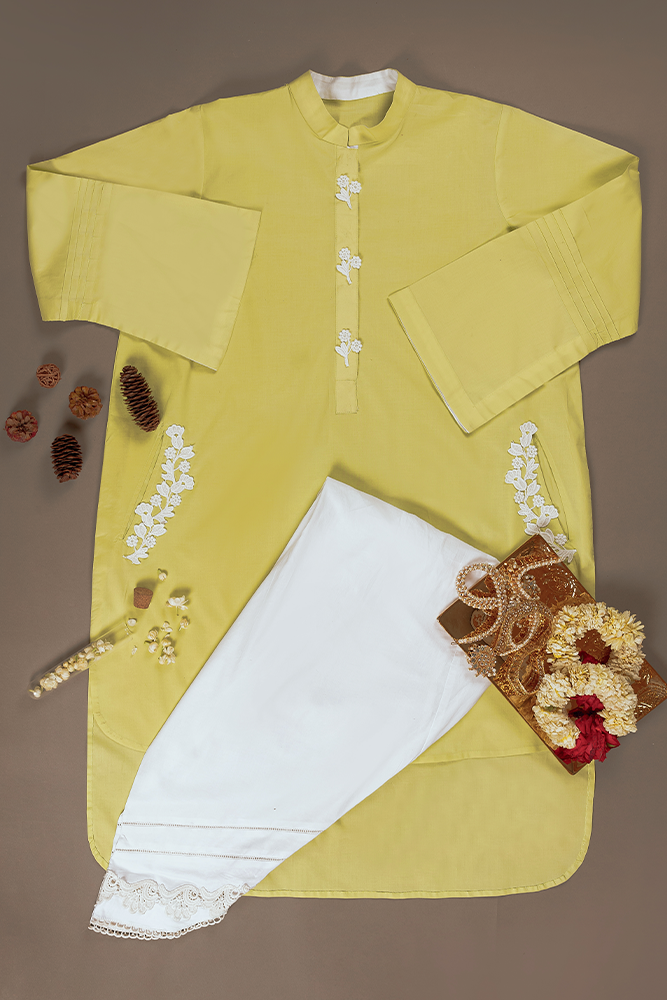 Description: Solid-green with white is a contemporary combination and reflects a sophisticated persona. This Kurta is crafted with eternally refined embroideries paired with plain shalwar glorifying its look. Embroidered pockets on the shirt are a plus point of this 2 piece outfit.