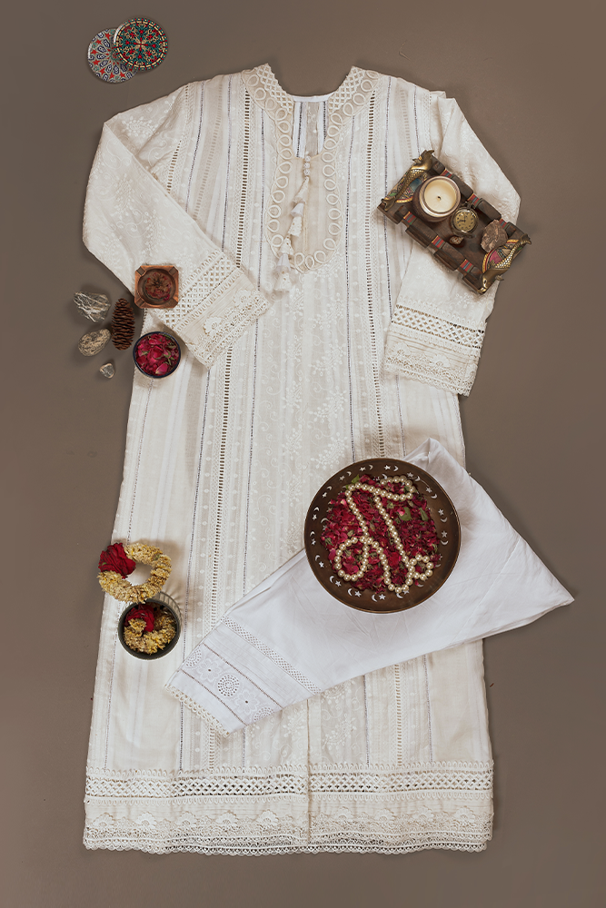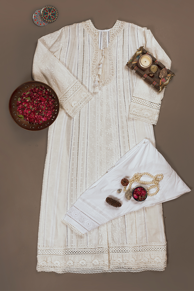 Description: We all love the aura white color creates! Get glammed up in this paneled chicken white shirt designed with an inlay of laces and a garland of hand-sewn cotton string around the neckline amplifies the beauteous persona paired with delicately completed shalwar splendors the allure.