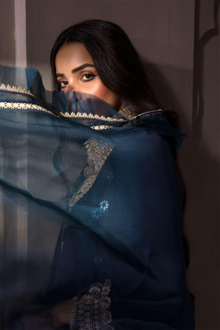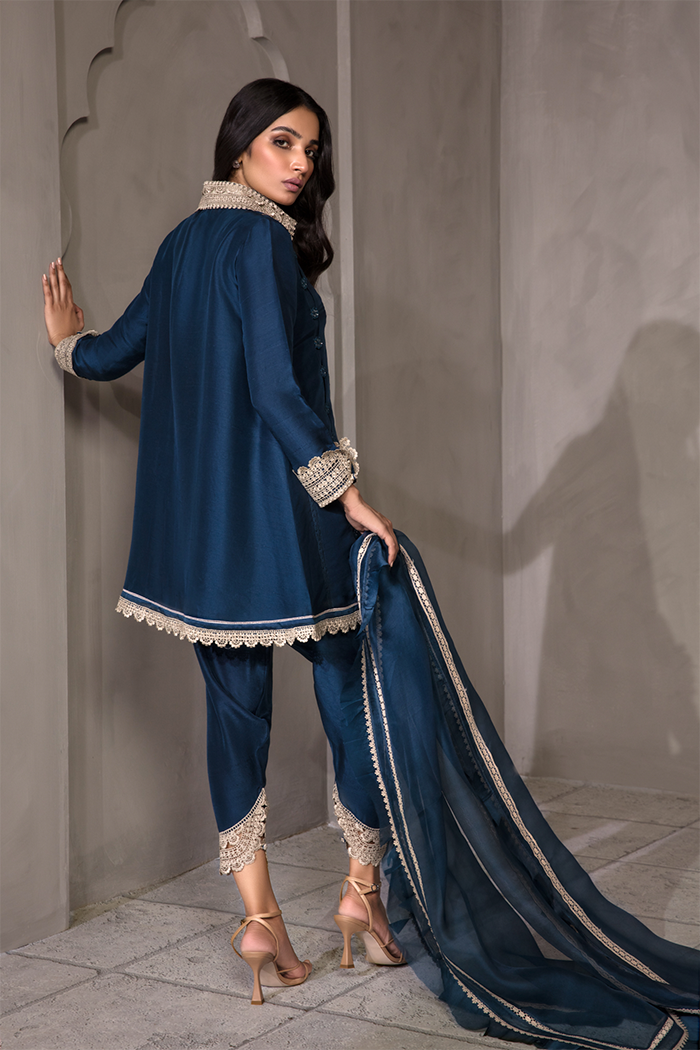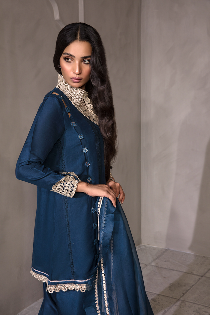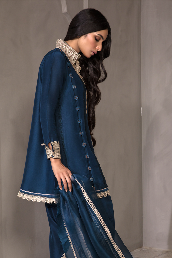 The teal blue colored raw silk kurta engraved with mirror work and lace detailing paired with traditional shalwar and organza dupatta.