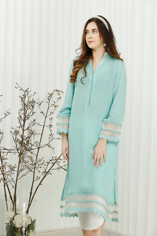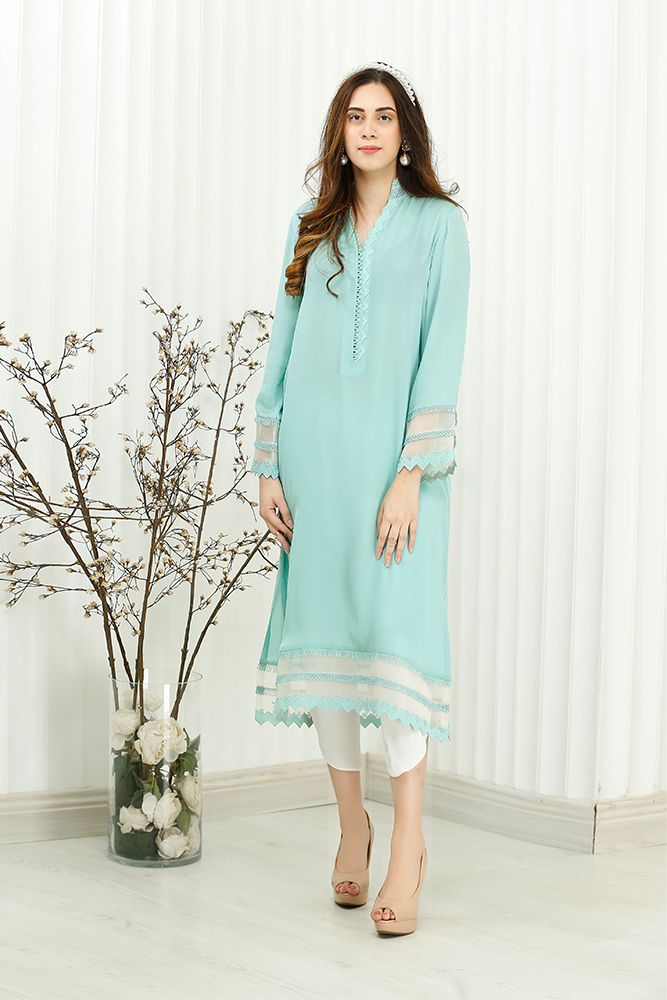 Description: This enchanting aqua blue malai long shirt with the most heavnely deatils on the sleeves and borders creates the most divine look that one would like to acheive. This kurta embraces soft touch of grace and symbolism combined and the white tulip shalwar enables to add depth to the outfit.