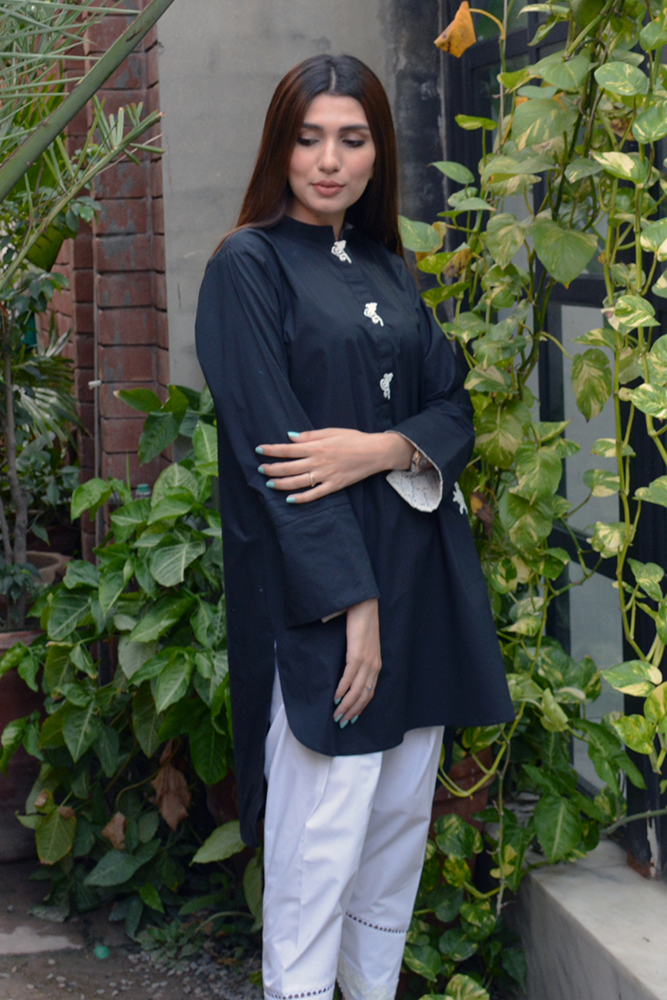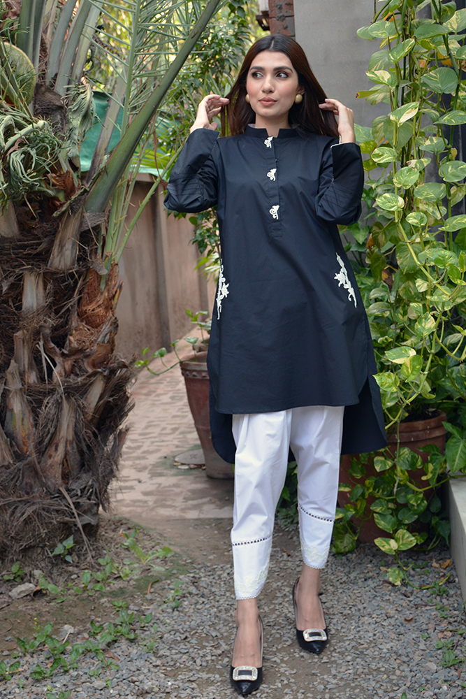 Description: This classic black cotton kurta with intricate embroidery details on the neckline and pockets, paired up with white shalwar makes this outfit the your perfect on the go outfit.