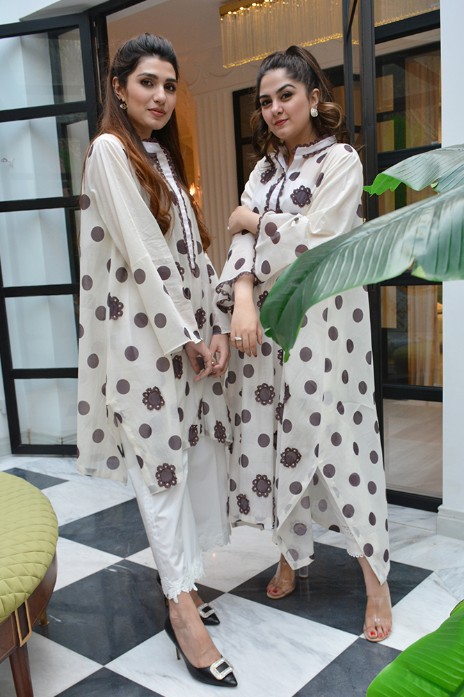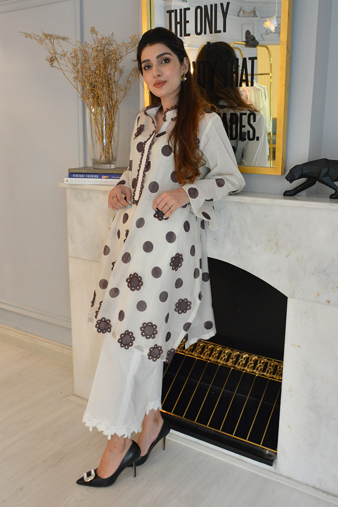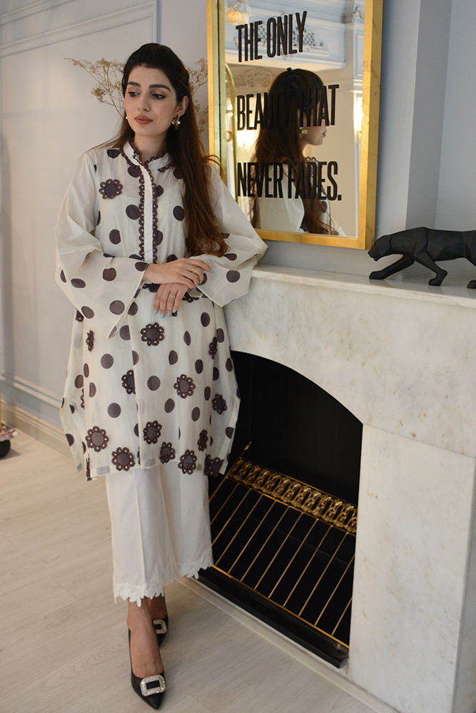 Fine polka print on white cotton shirt features detailed brown finish neckline and 3d flowers adding utter elegance and beauty to the whole look