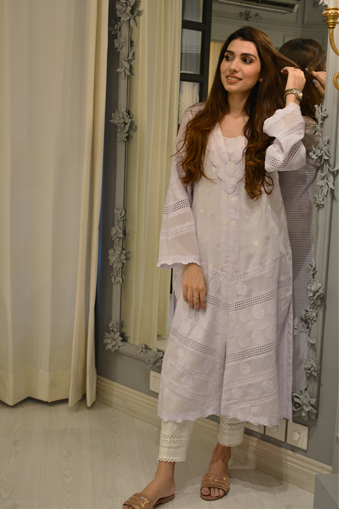 Description: Lilac chicken long shirt with a refreshing design and self embroidery on the panels. Paired up with white cigarette pants that completes your perfect look