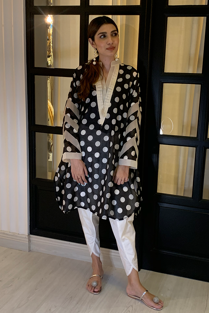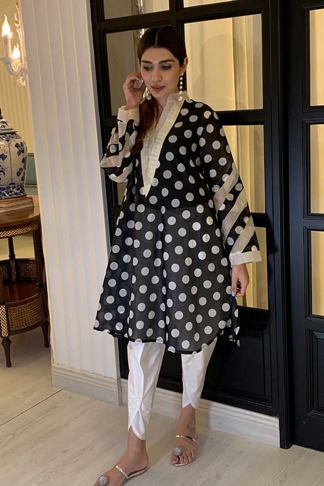 Description: Featuring a beautiful white polka print on a fine black taffeta silk canvas. The chevron neckline is meticulously detailed with off white silk organza and silk stripes organza inlay on the sleeves effortlessly enhancing the grace of this look