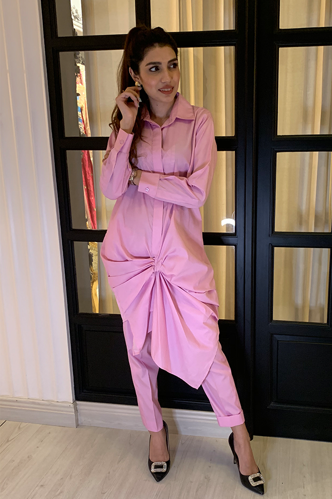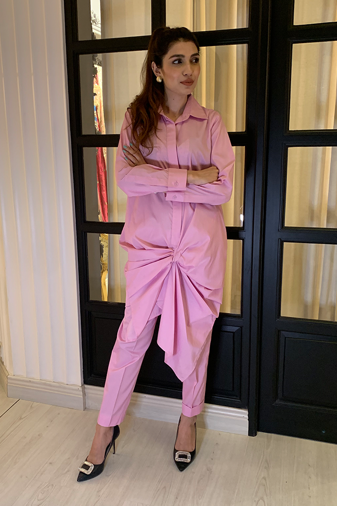 Description: Soft plain Irish cotton collar shirt with handcuffs and front center knot exclusively paired with cigarette pants to complete the elegant look