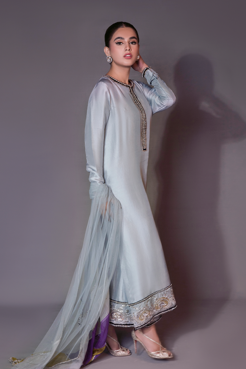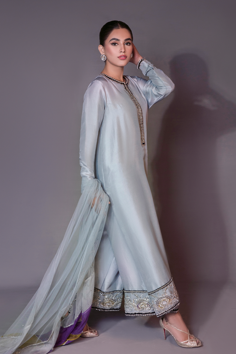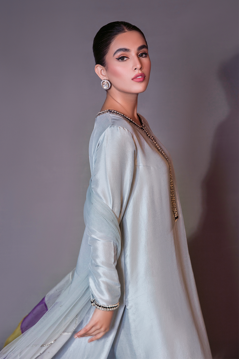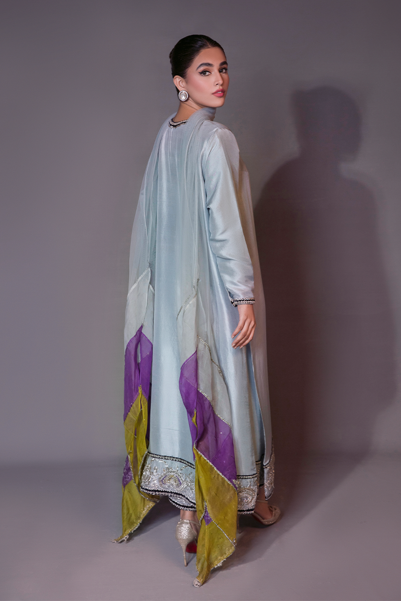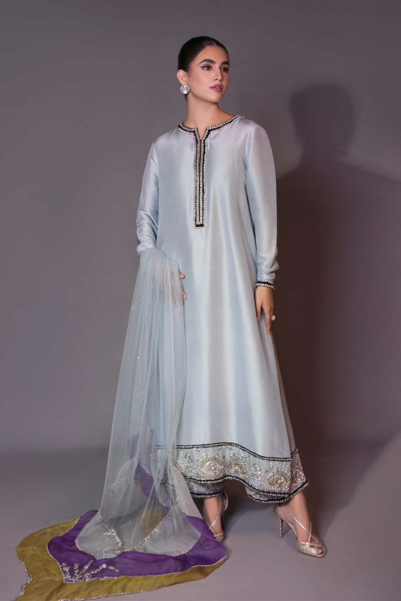 Dahlia is a contemporary festive outfit draped in grey-blue hues ornamented with intricate embellishments. A straight raw silk shirt adorned with delicate silver details over the neckline enhanced with purple velvet details on borders. A gorgeous net dupatta with scattered spray finished with lime green and purple details comes with matching silk azaar pants completes the elegant festive look.
