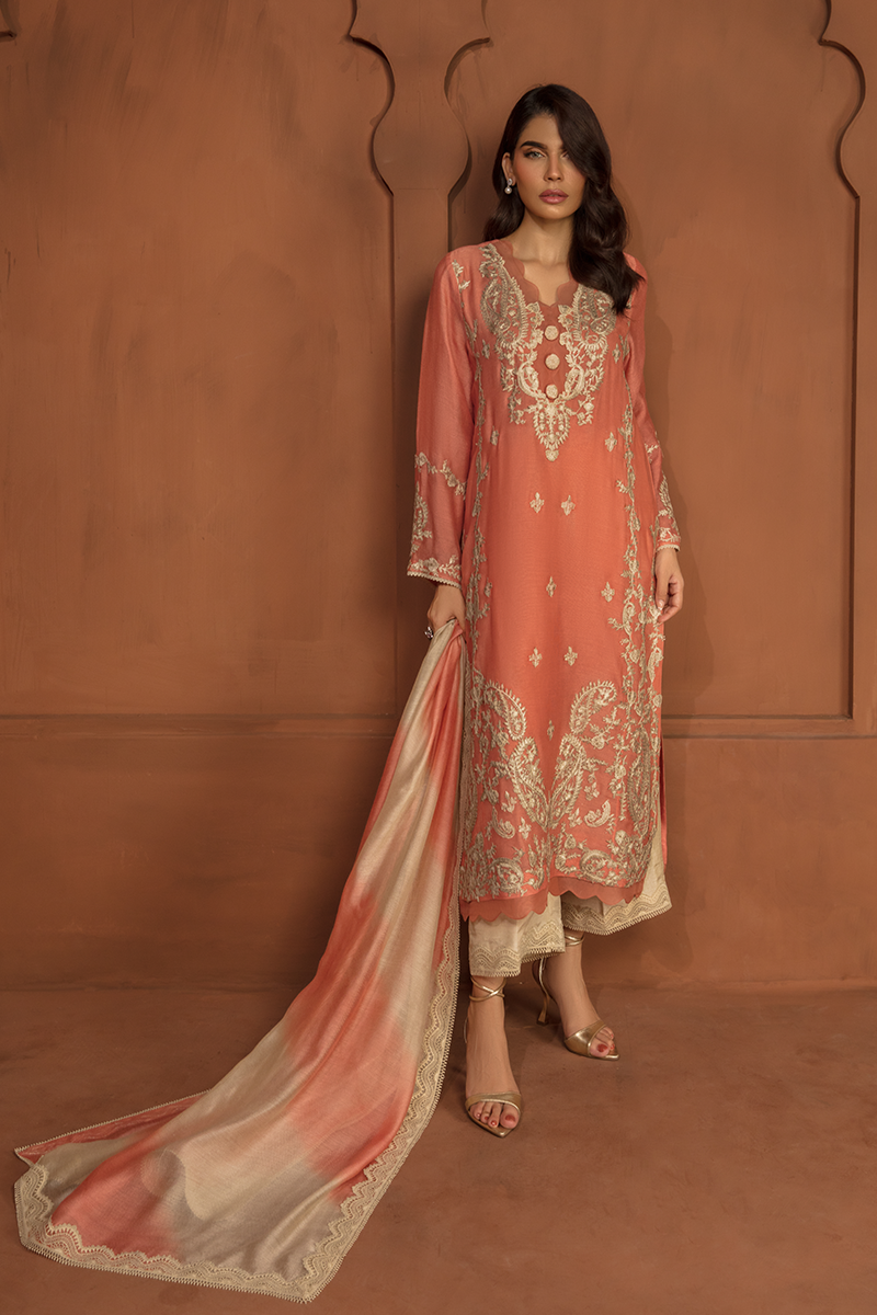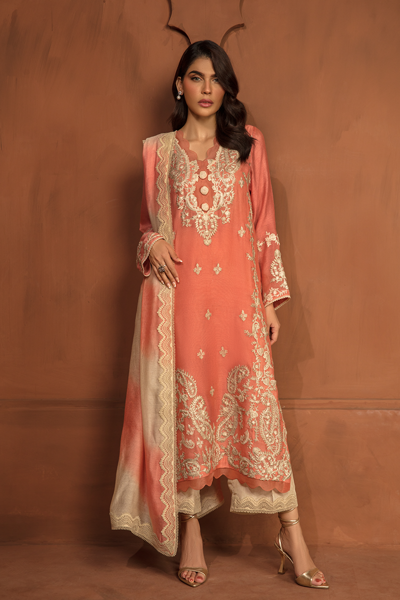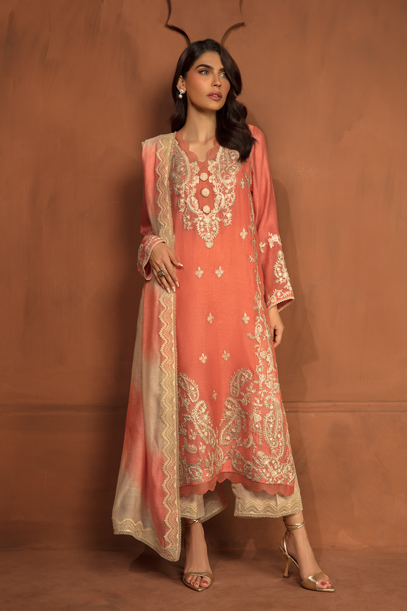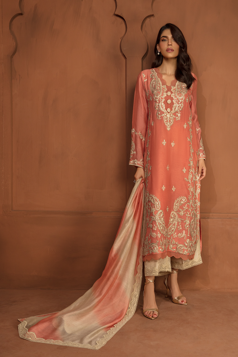 Description: Majestic mornings unfold with "DAWN" in all its splendor. This dazzling ensemble in Coral boasts a cotton net shirt elegantly adorned with exquisite beige appliquéd embroidery, forming regal patterns of paisleys and flowers. Complemented by raw silk trousers and a cotton net dupatta, Dawn is full of dreamy details encompassing modern techniques, this dress epitomizes grace!