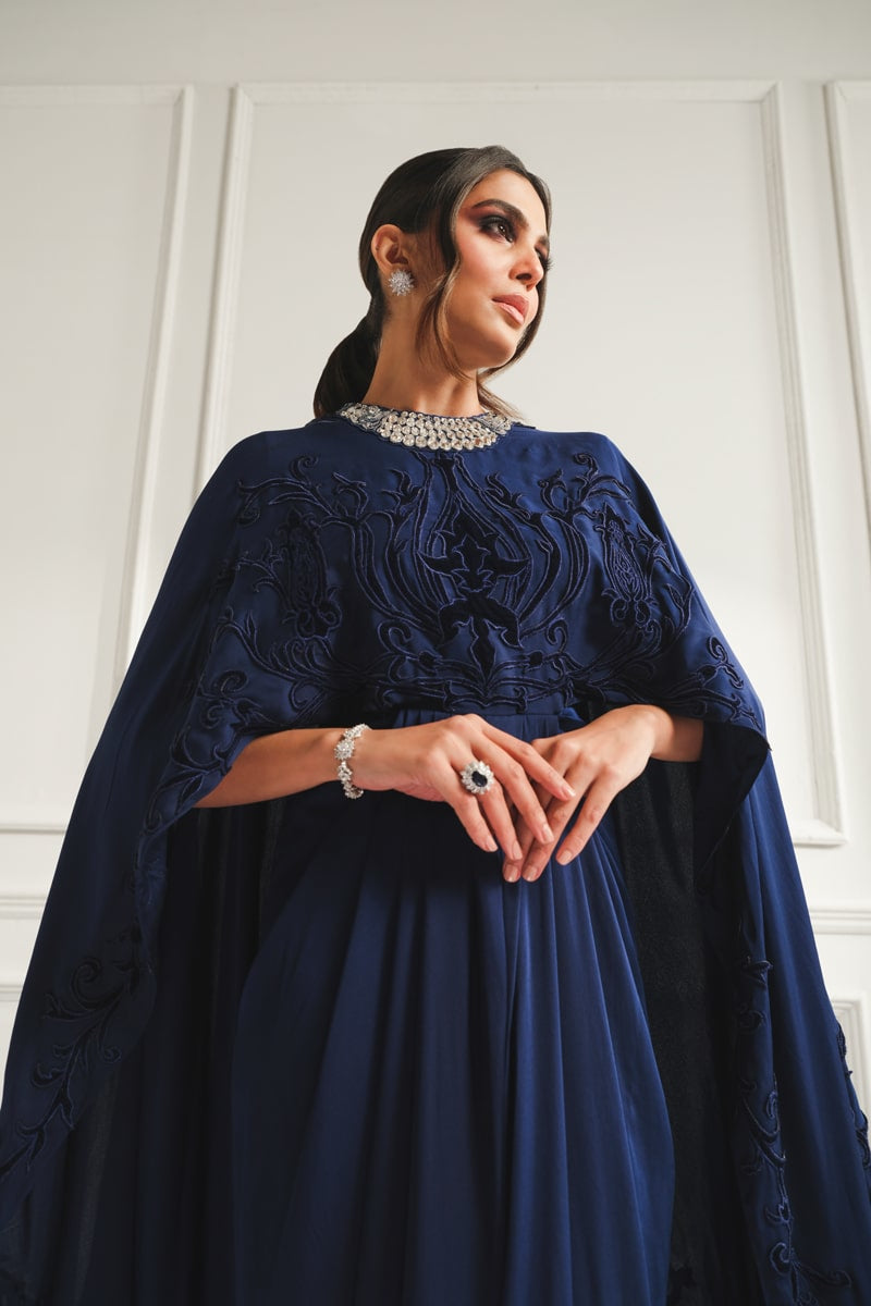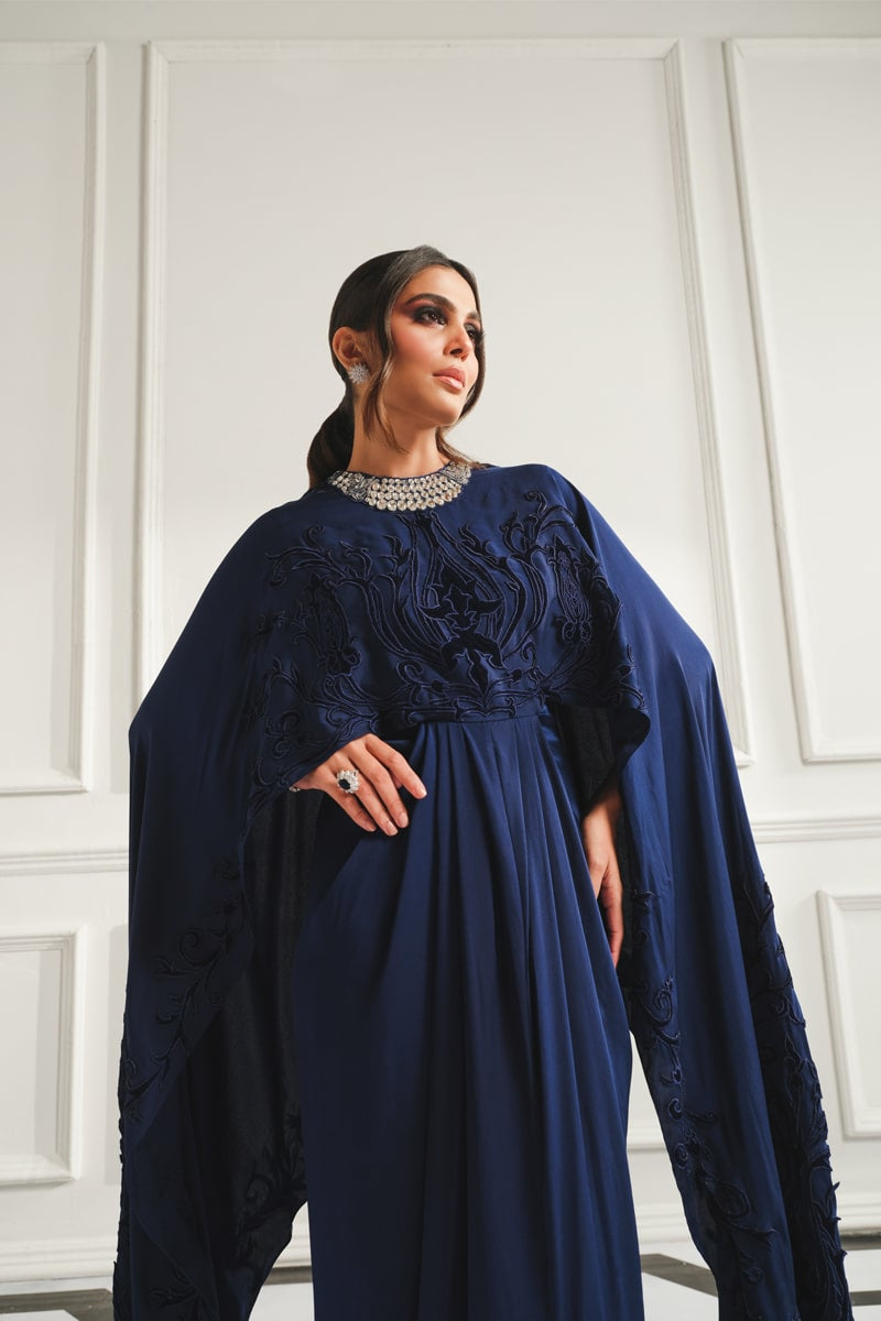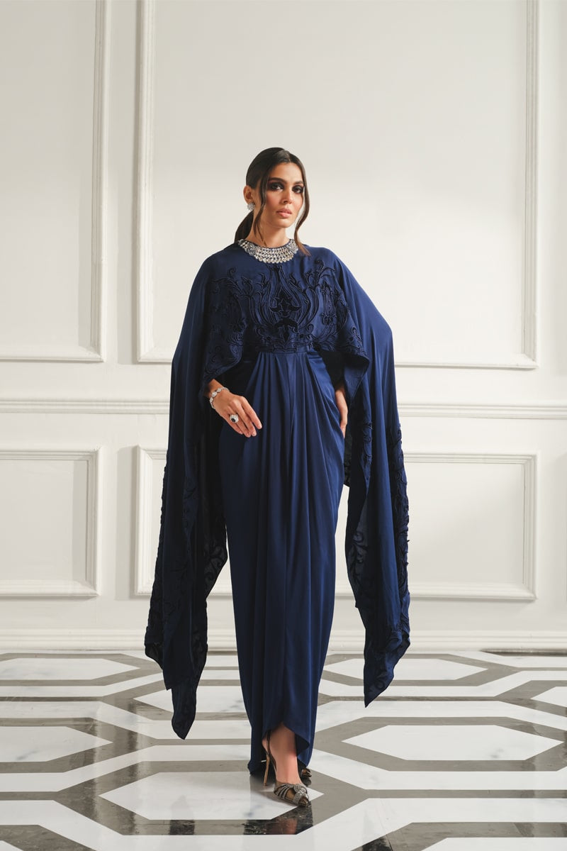 Description: A draped gown of pure silk, adorned with a Swarovski necklace neckline, elevating elegance to new heights.