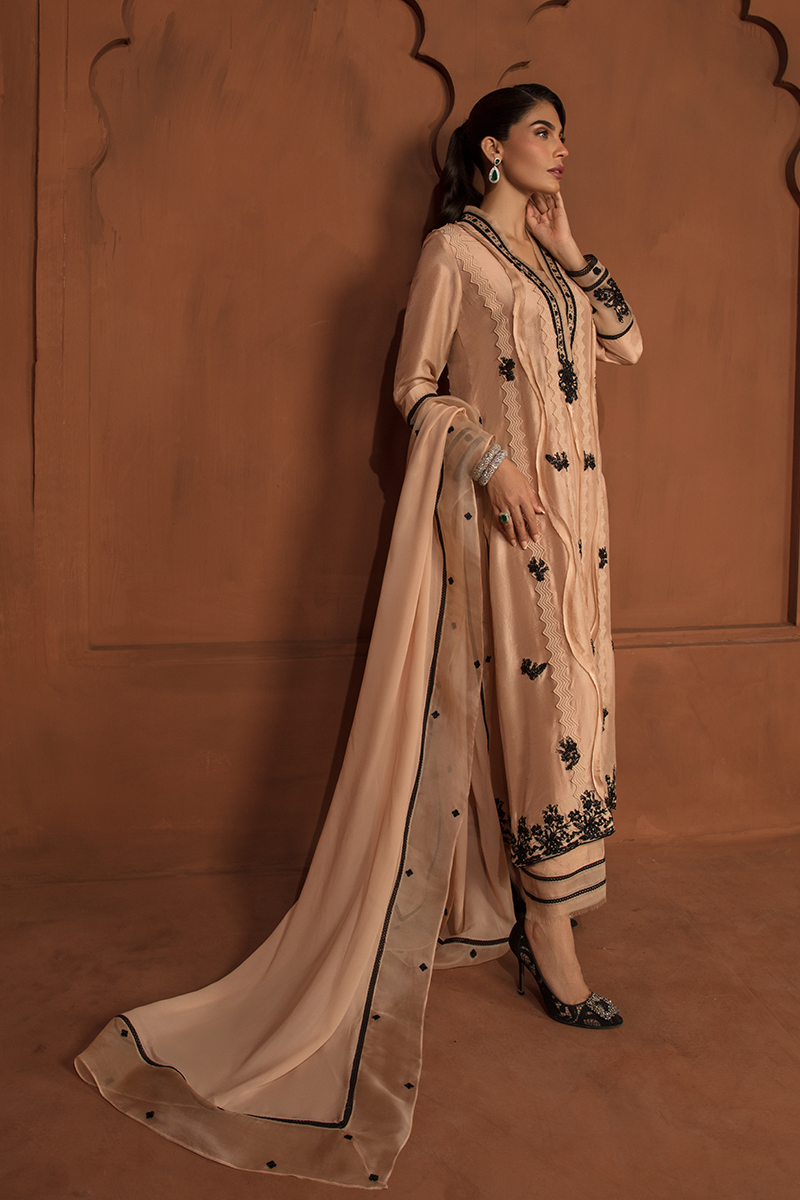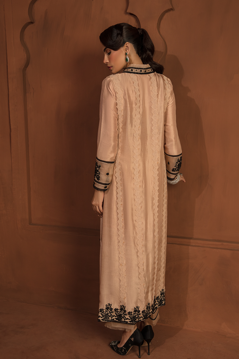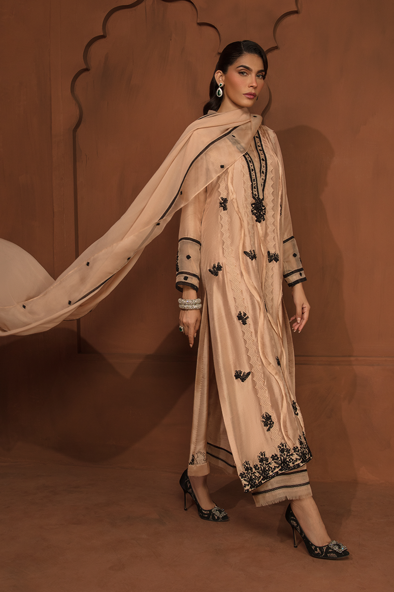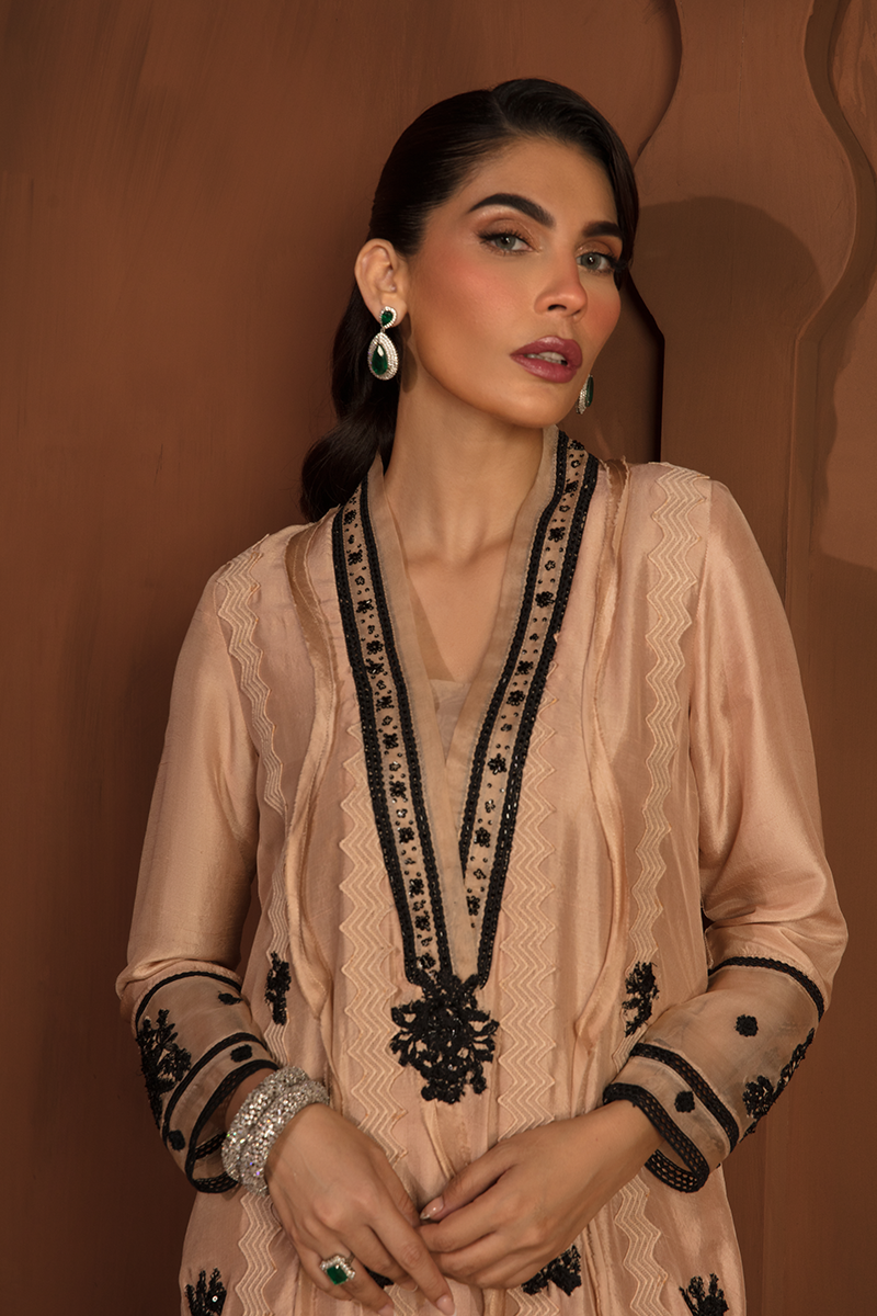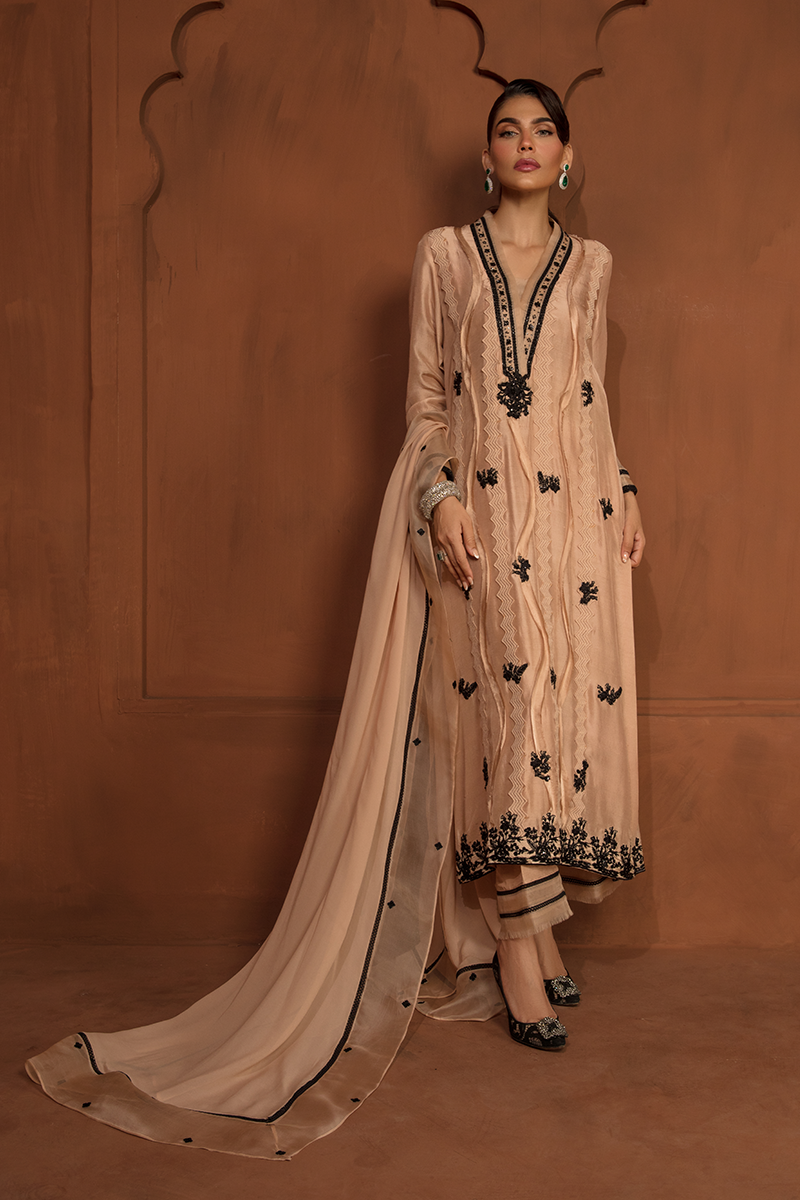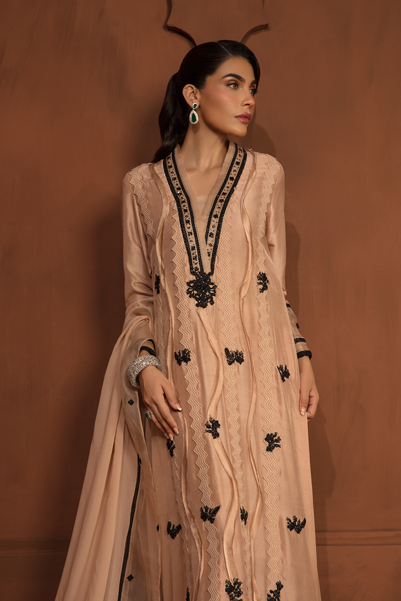 Description: "DIANA“ is a monochromatic artistry in Beige and Black. With a beige base adorned by intricate black embroidery, this dress becomes whole with a raw silk shirt, tailored raw silk trousers, and an organza dupatta. Diana is further beatified by raw edges detailing of black net and a mesmerizing floral motif patchwork, adorned with sequins and pearls.