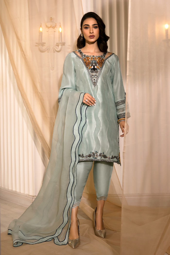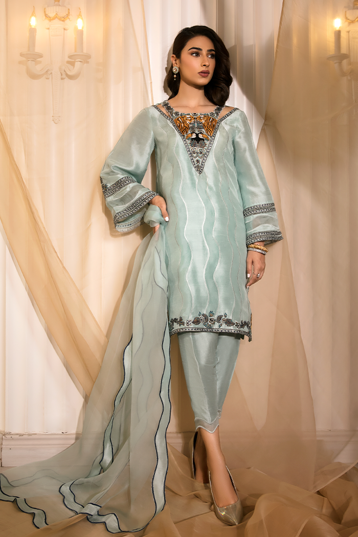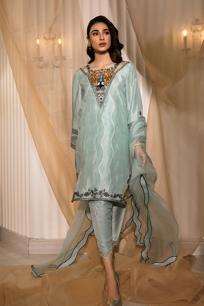 Description: Symbolizing elegance and grace with a unique style, Ella features delicate embroidery on an aqua blue pure raw silk shirt forming gorgeous patterns on the neck and daaman. The intricately embellished fierce tigers and lovely pelicans on the neckline are enhancing the grace even more! Paired along is a beautiful organza dupatta featuring scalloped details and a pure silk shalwar to ethereally enhance this perfect festive look!