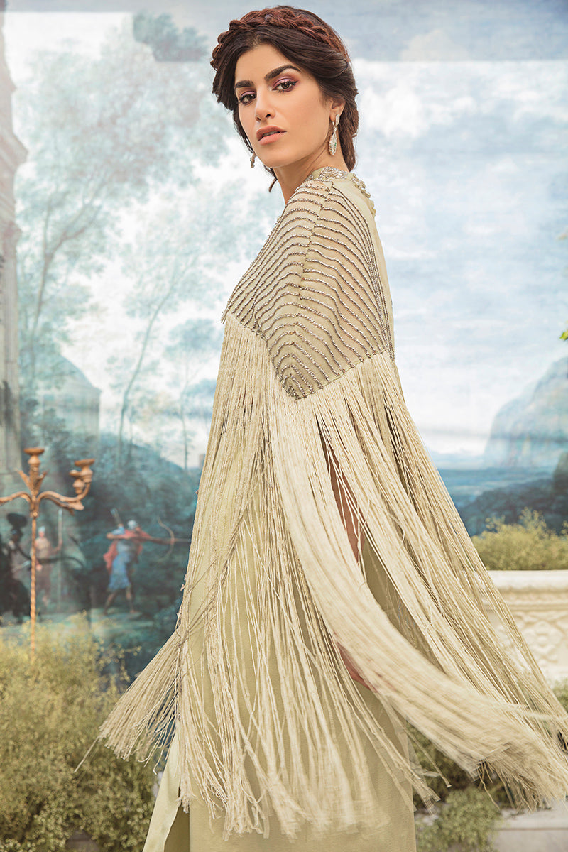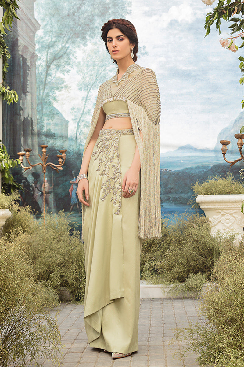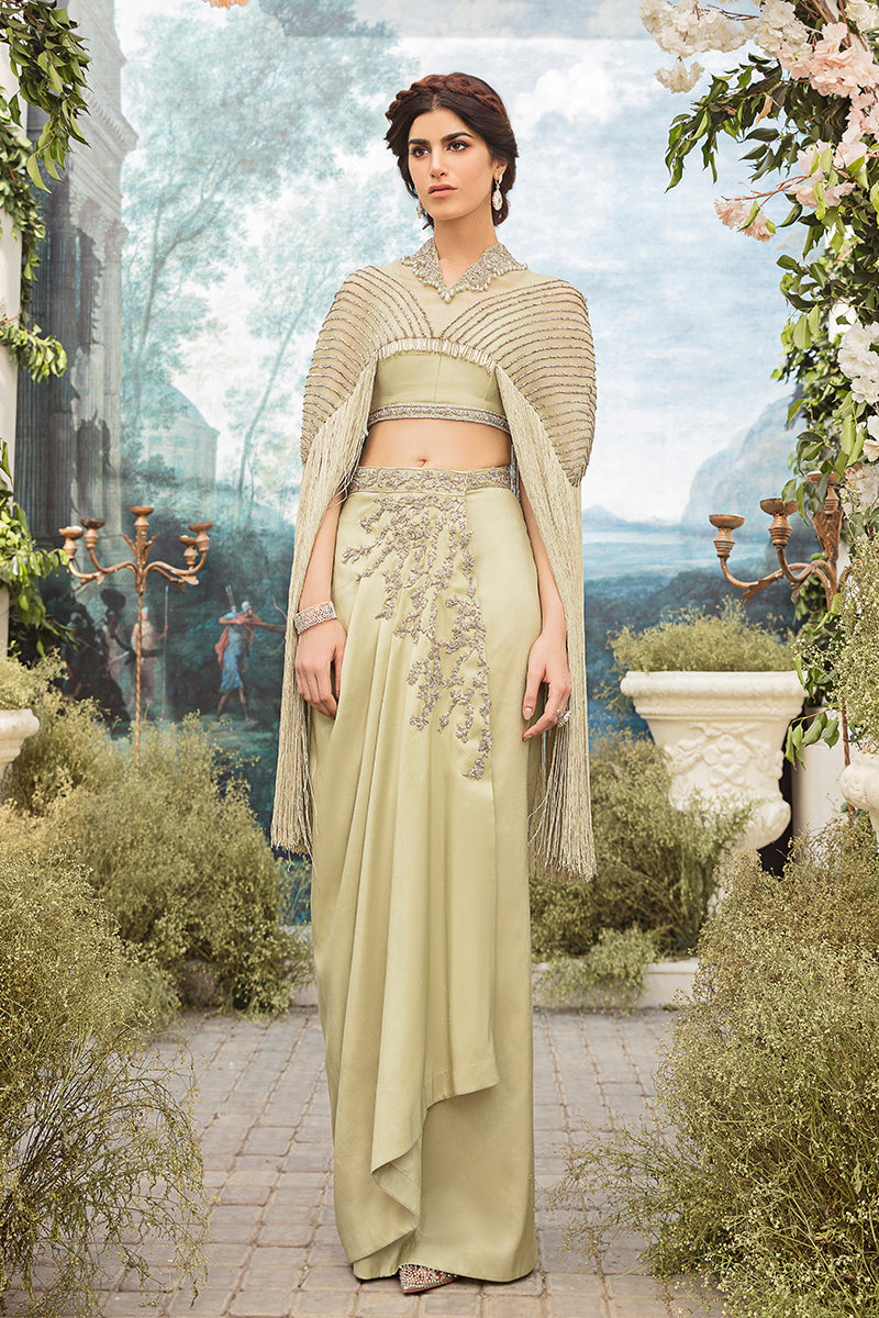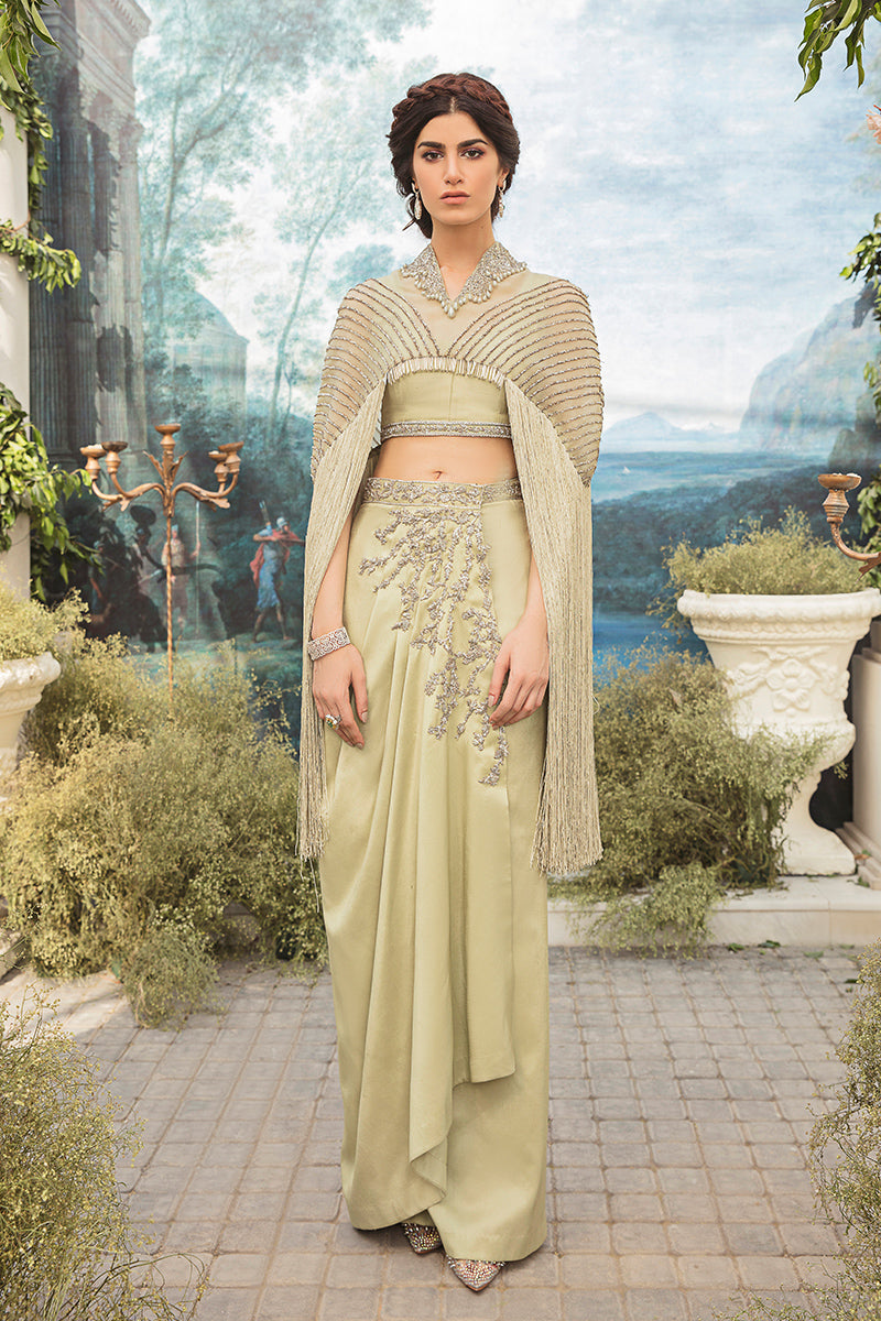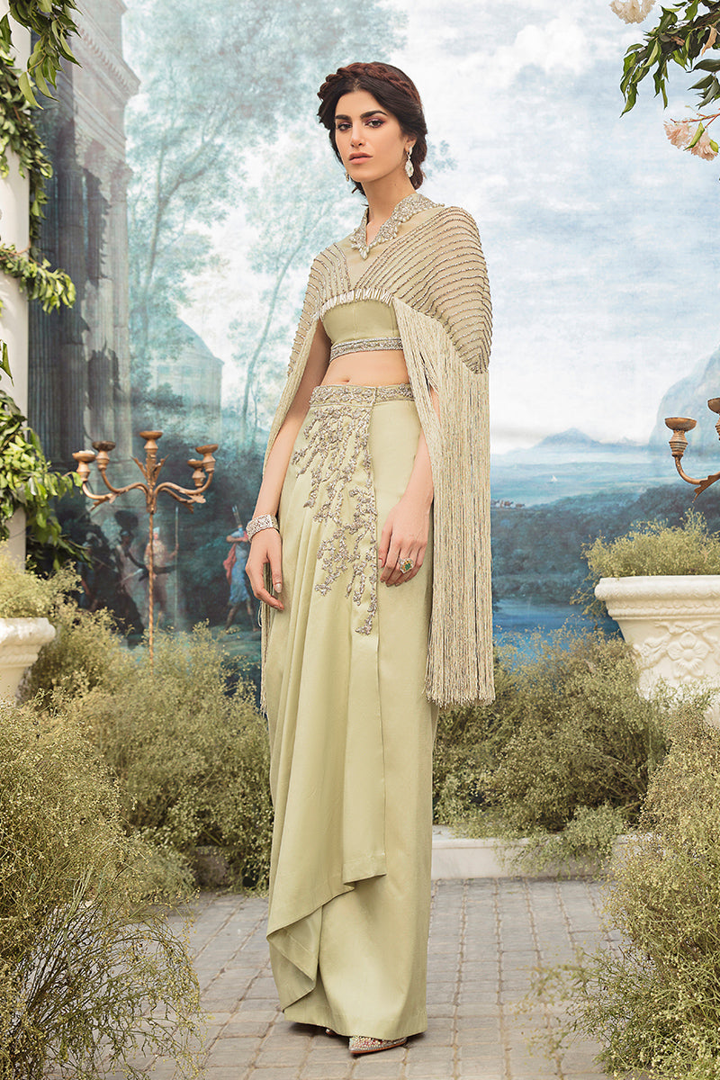 Description: Every aesthetic detail of the ‘Eshal’ outfit infuses exquisite craftsmanship with modern glamour. This olive green cape with silk dori tassels is perfect for the woman who looks for playfulness and gracefulness. It is paired with a sarong skirt for undeniable beauty.