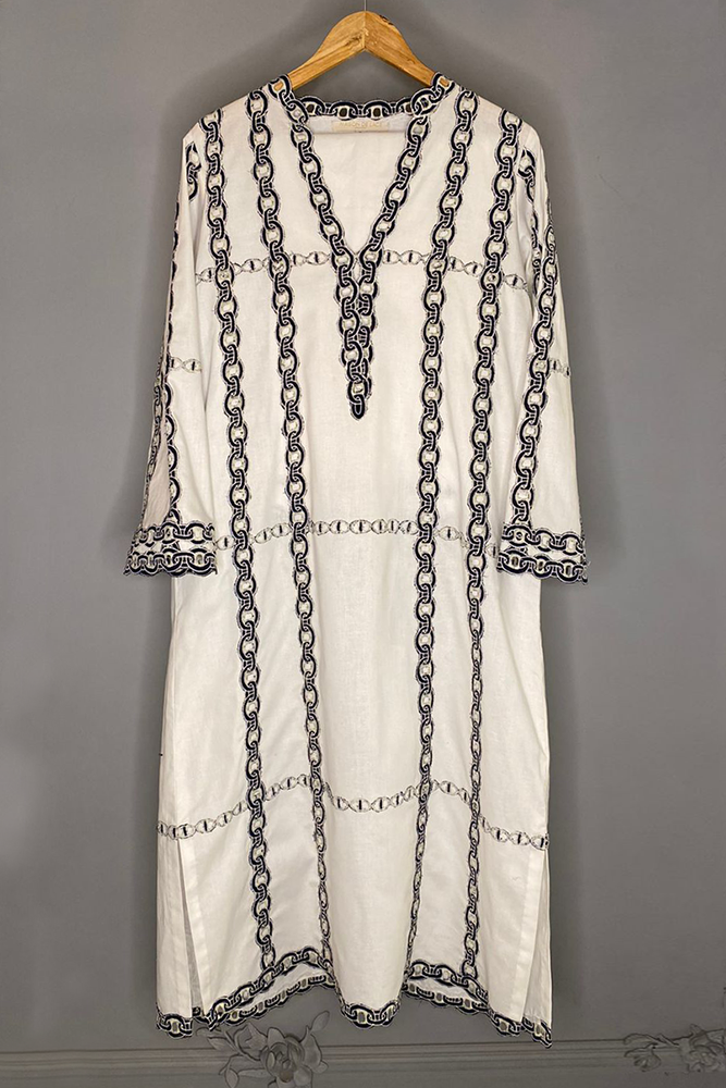 Description: This enticing piece of black and white with the most exquisite blue embroidered chain applique, paired with straight pants makes this ensemble a crucial grab for an elegant look.
