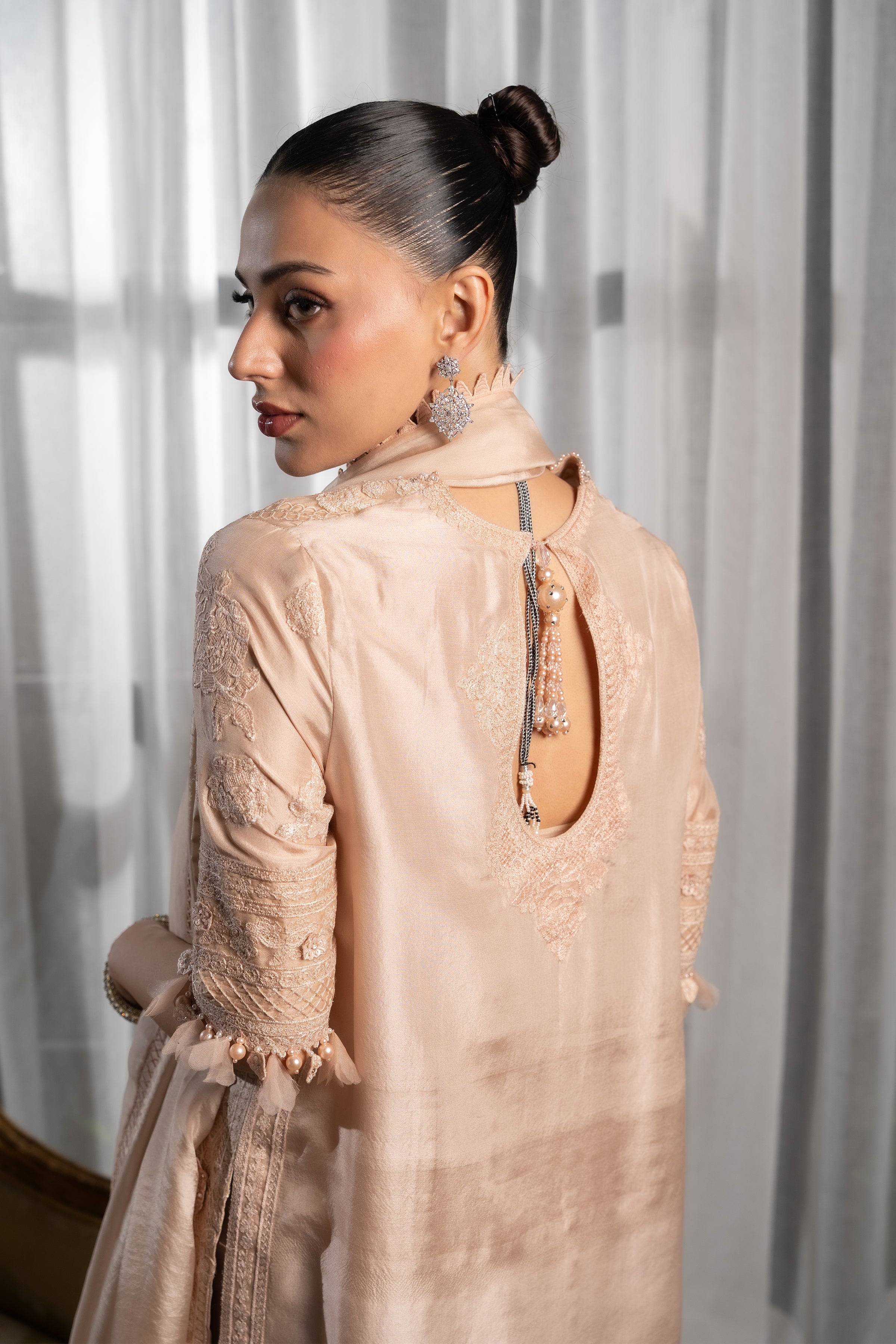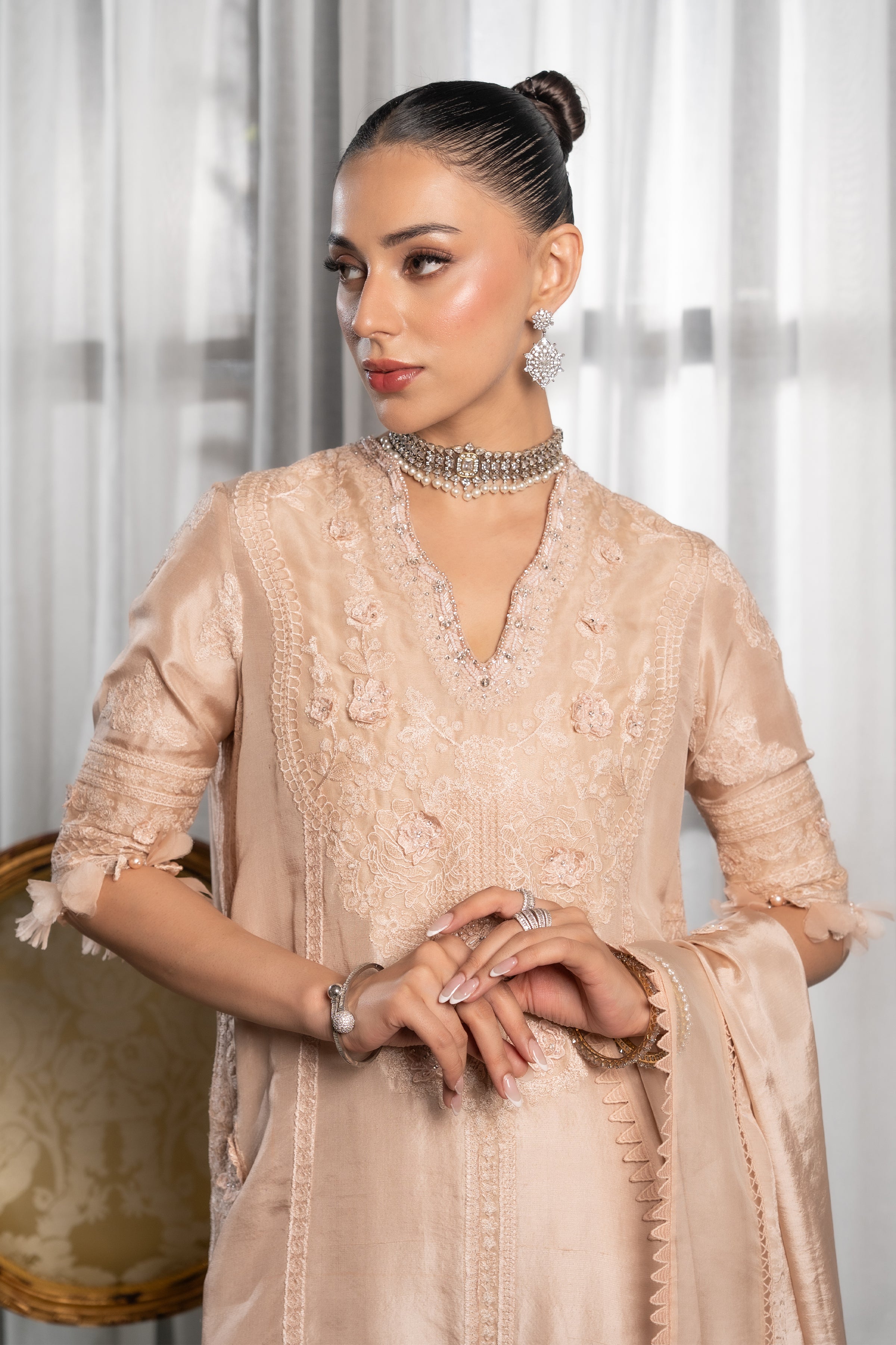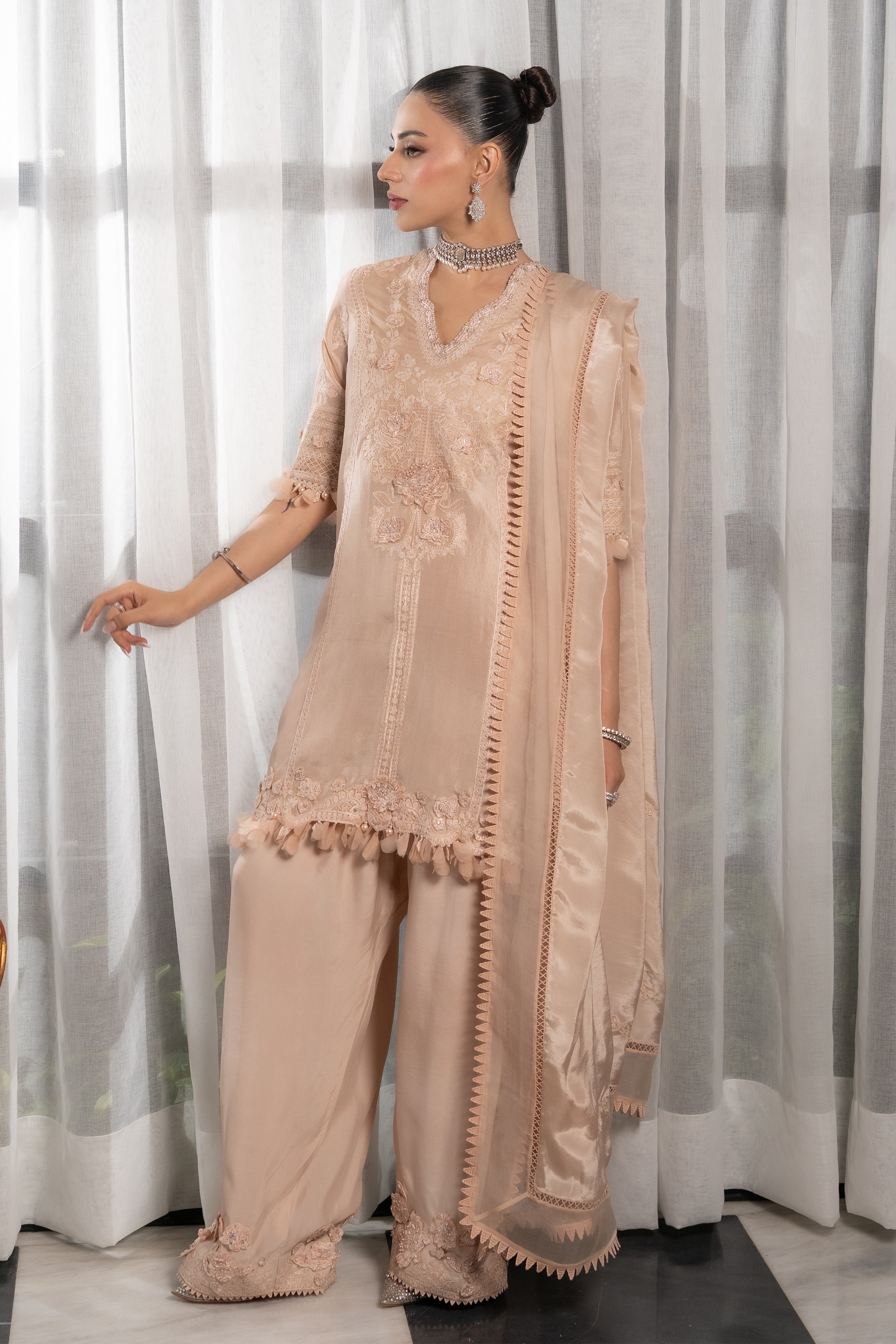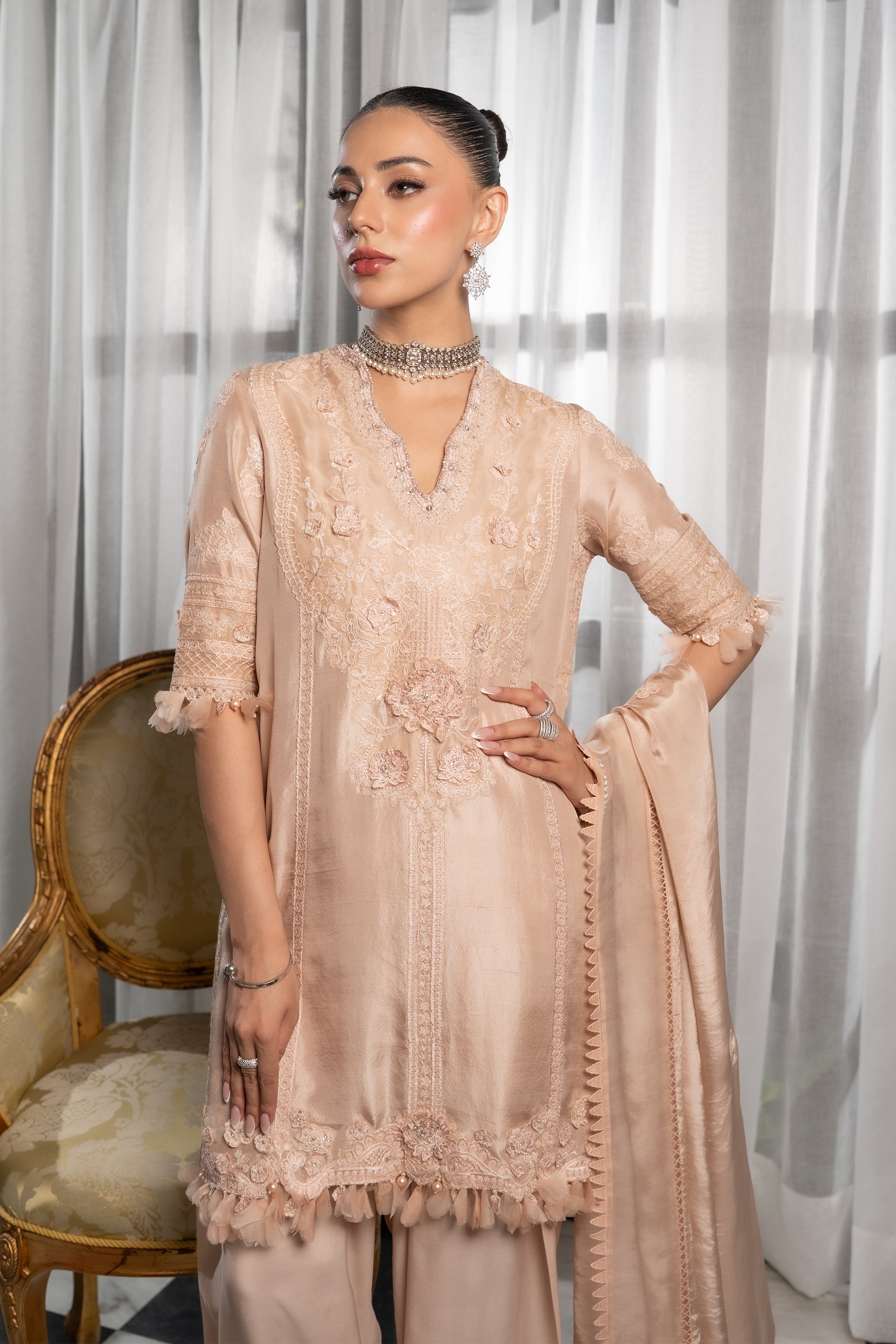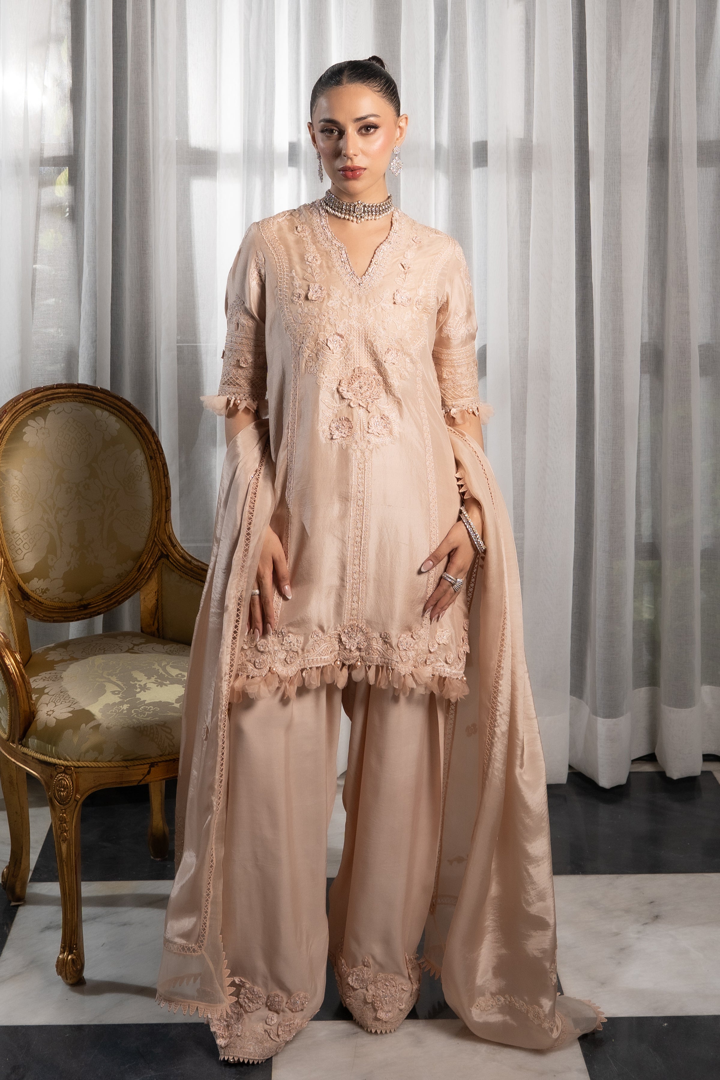 This exquisite ensemble is crafted from pure raw silk, with the shirt featuring self-embroidery and delicate 3D embellished flowers. The neckline is further enhanced with intricate beadwork. It is paired with a pure crepe silk shalwar, which is also adorned with 3D embellished flower details. The outfit is completed by a graceful pure silk dupatta with elegant embroidery and lace detailing.