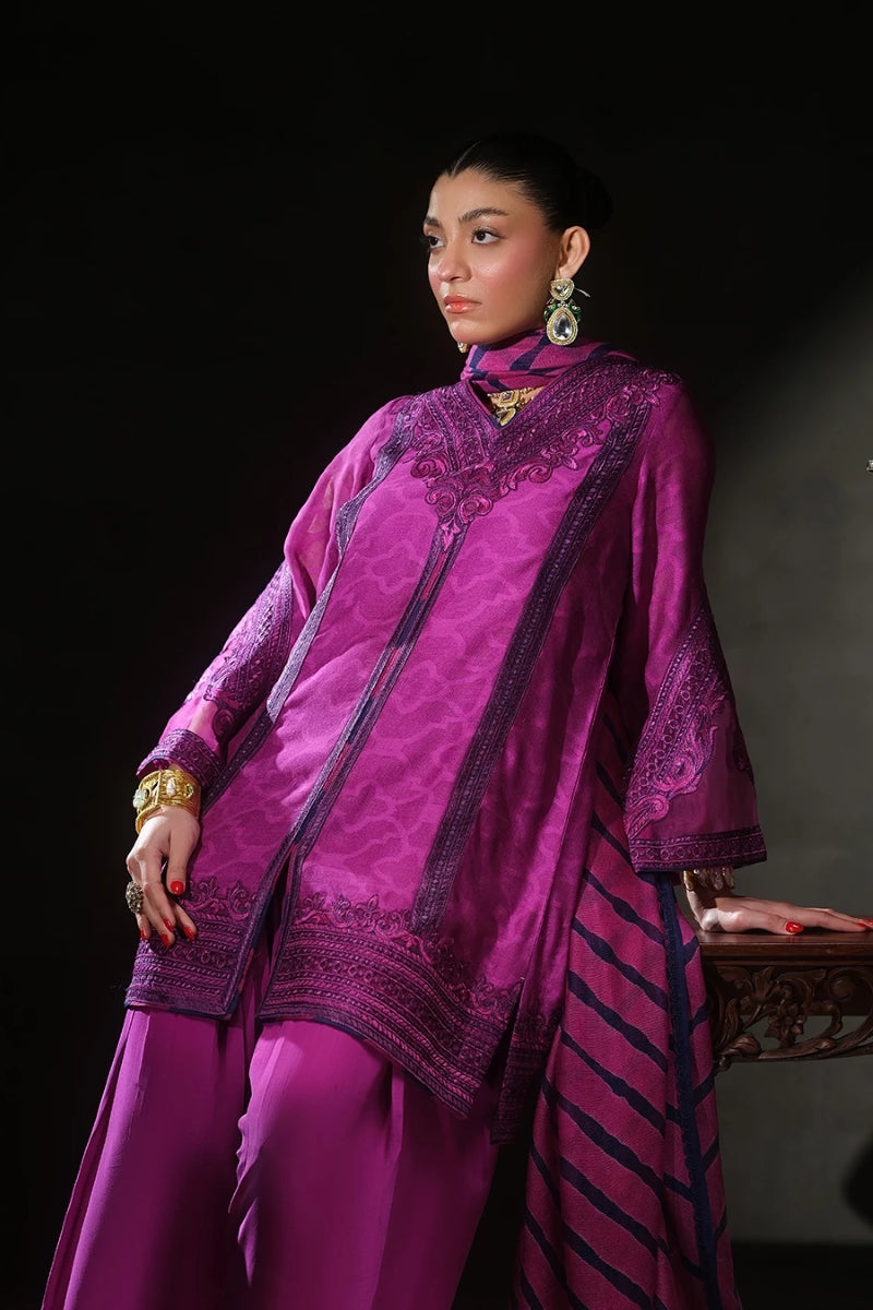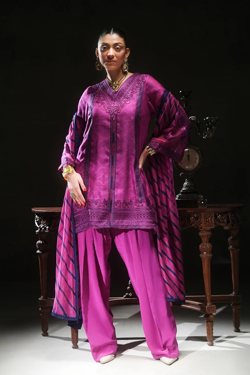 A silk-embossed thadi net front-open short shirt with intricate embroidery, paired with a pure crepe loose shalwar and a two-tone pure thadi net dupatta, finished with delicate lace edging.