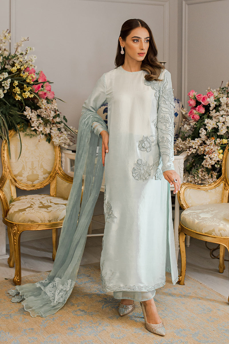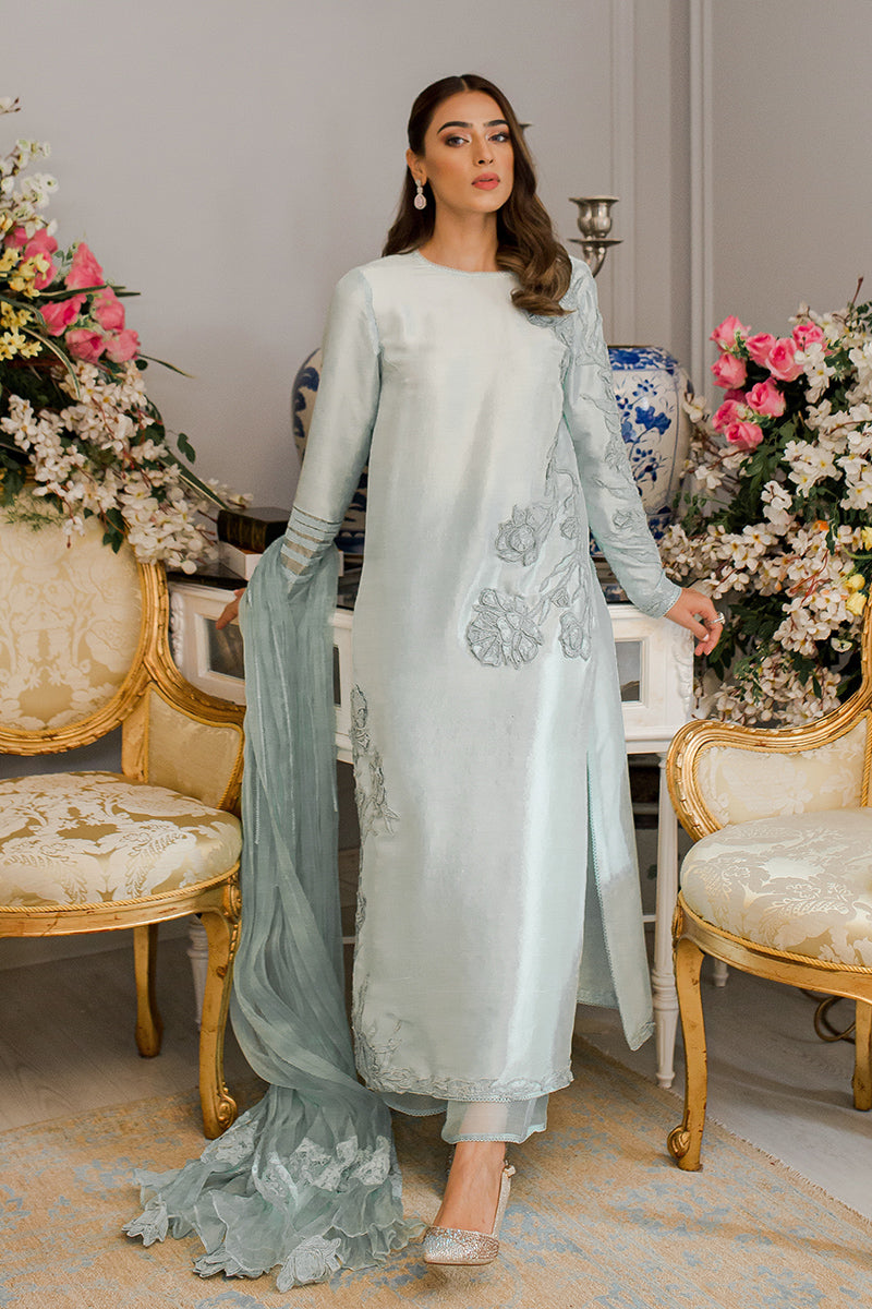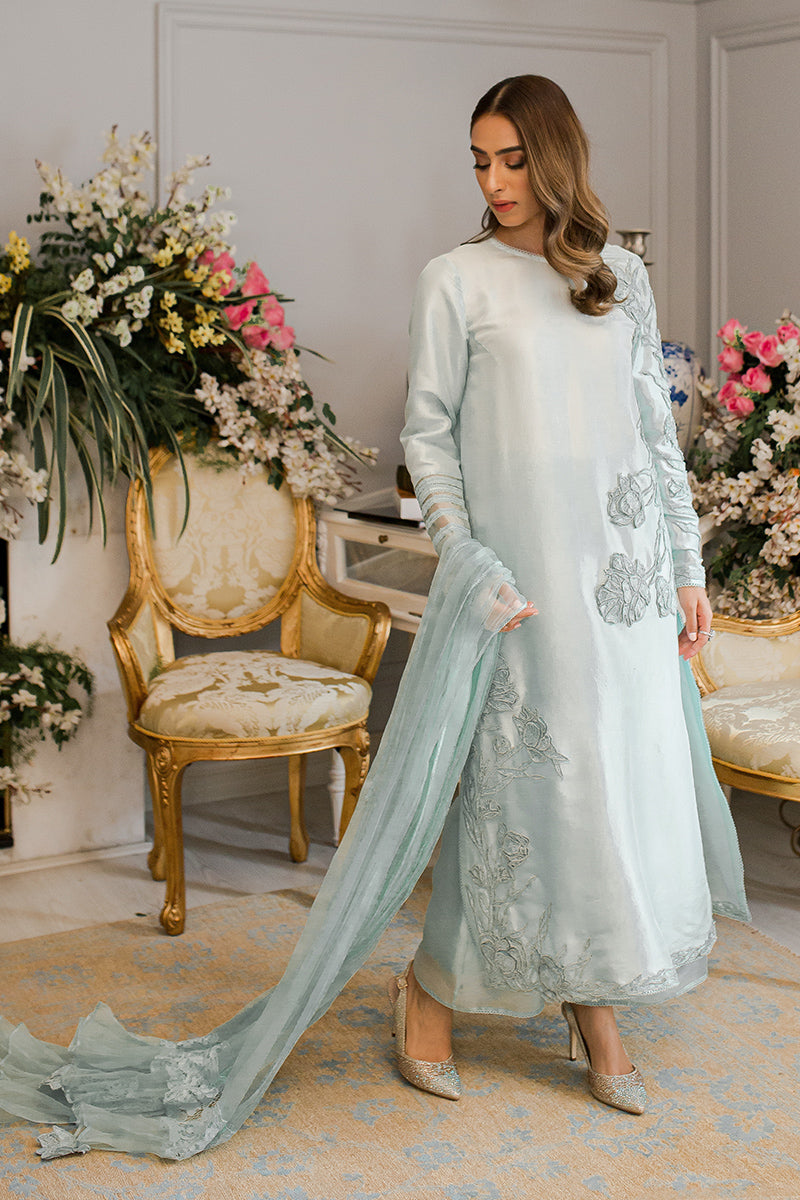 Description: This stunning shirt is embellished with gorgeous rose self embroidery on the front and lovely organza sleeves. A graceful organza dupatta and raw silk izaars with delicate, pleated detailing complete this dreamy ensemble.