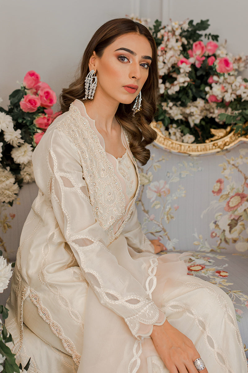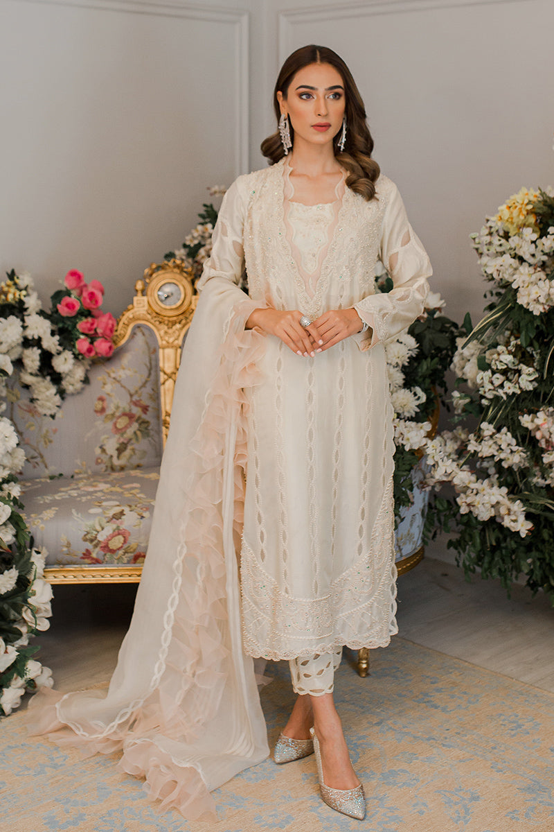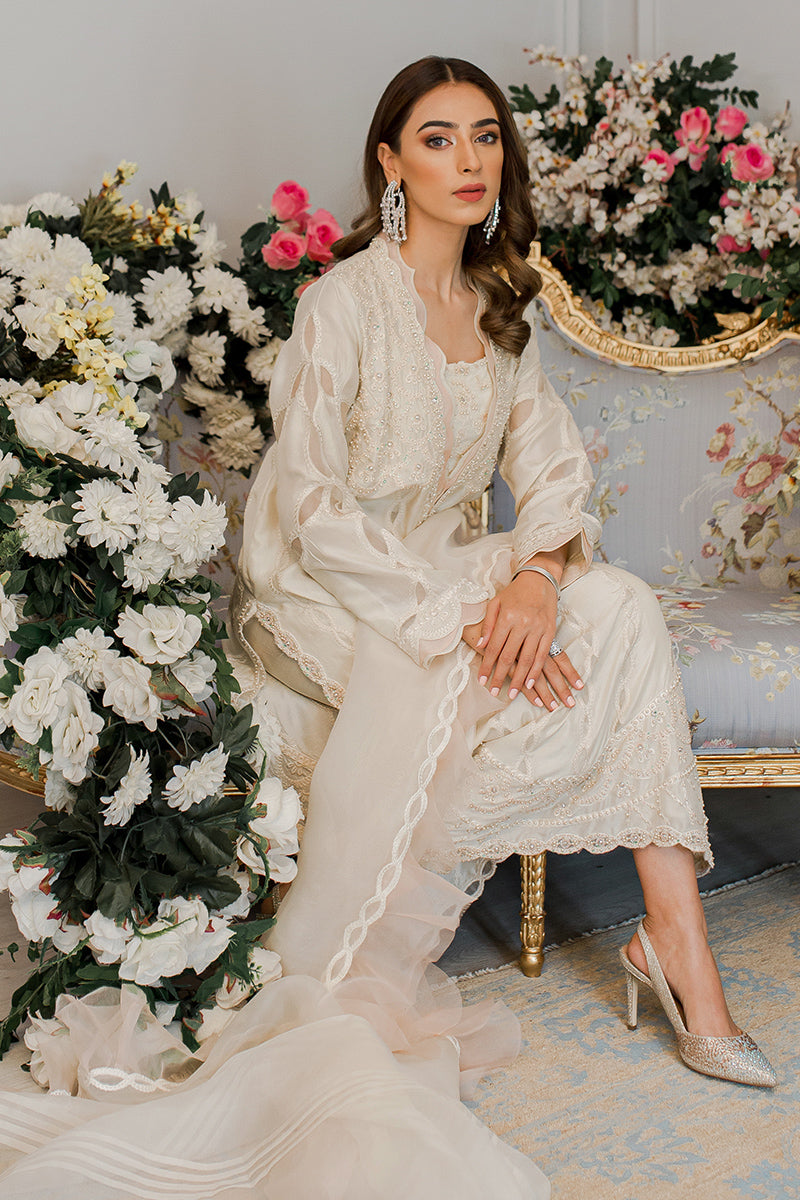 Description: The charismatic ivory and peach-hued work of art is handcrafted with intricate embroidery on the shirt. This classic ensemble is paired with elegant raw silk pants with a graceful organza dupatta making the attire the perfect fit for your summer look.