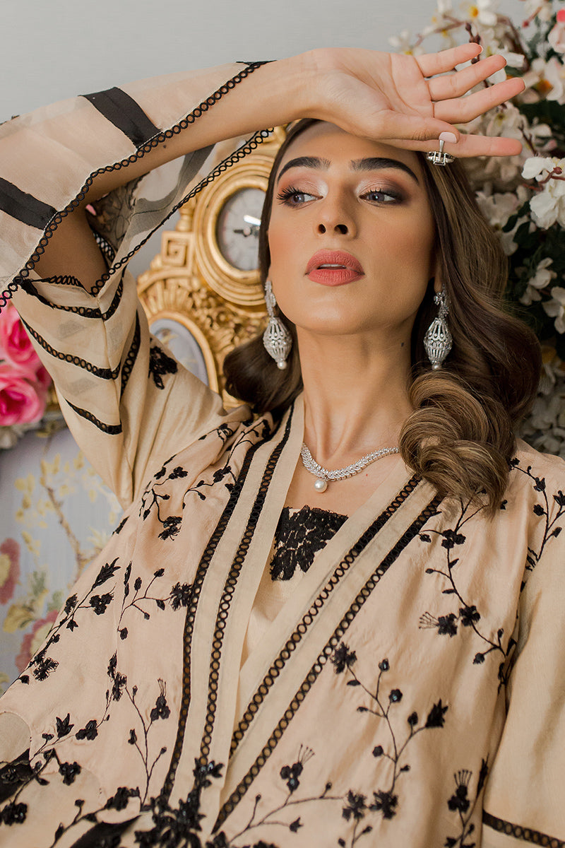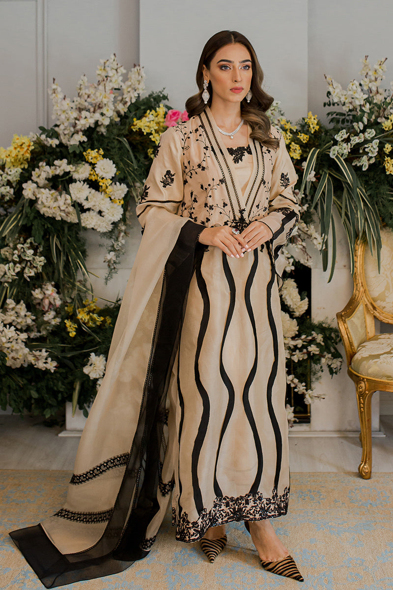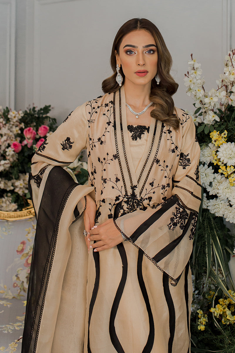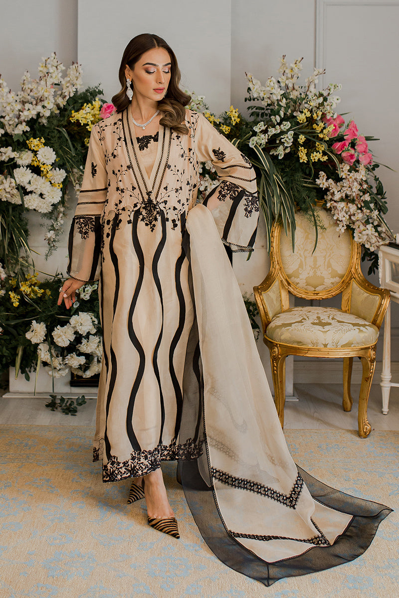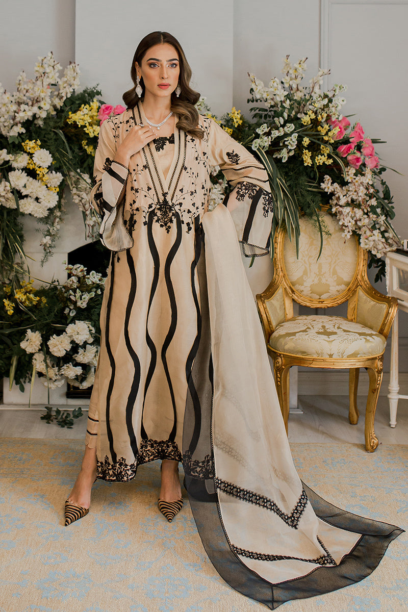 Description: The shade of this classic raw silk ensemble is carefully selected from the summer palette and is embellished with bold black swirly patterns and intricate embroidery.Raw silk pants and the elegant organza dupatta with black detailing complements the whole attire. The whole look is perfect for your summer brunches.