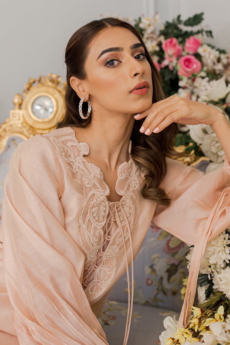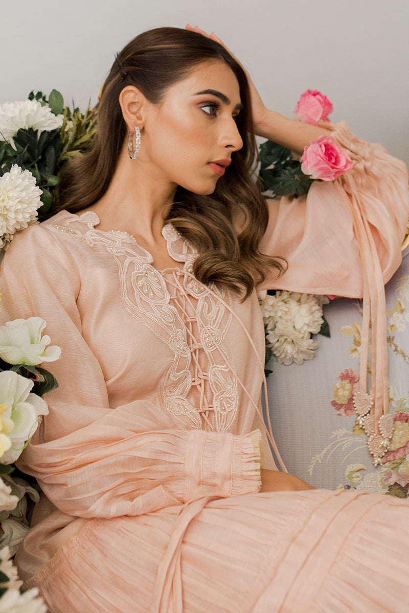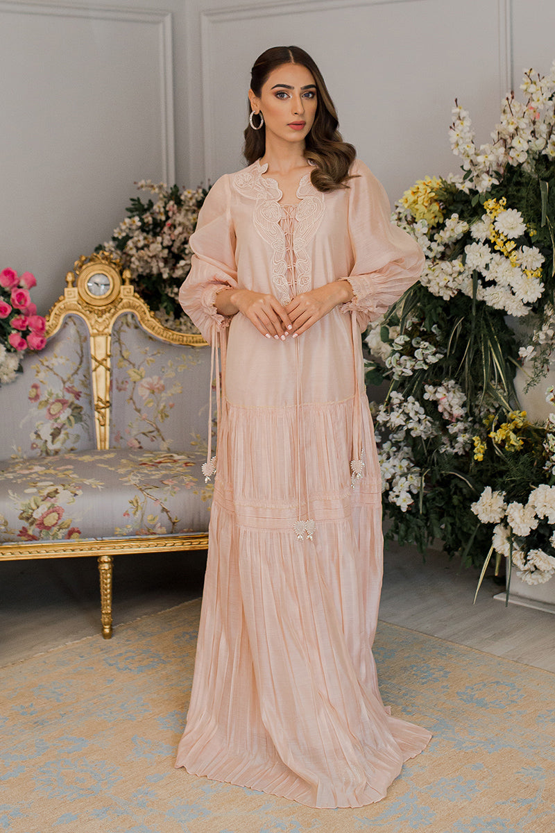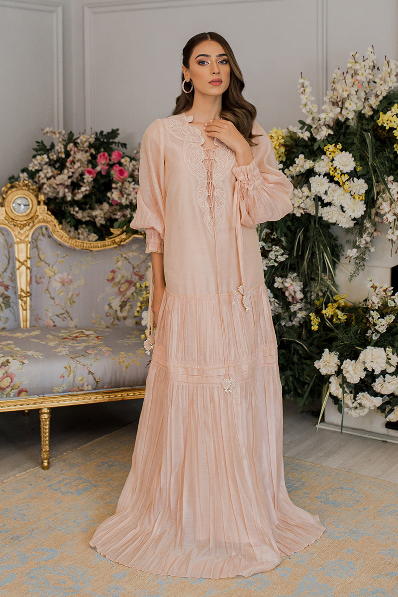 Description: The dusty pink pleated dress exhibits the essence of grace and sophistication. The classic chemise is embellished with intricate embroidery on the neckline. To enhance the look, this silk drape is paired with raw silk pants, a perfect choice for the summer season!