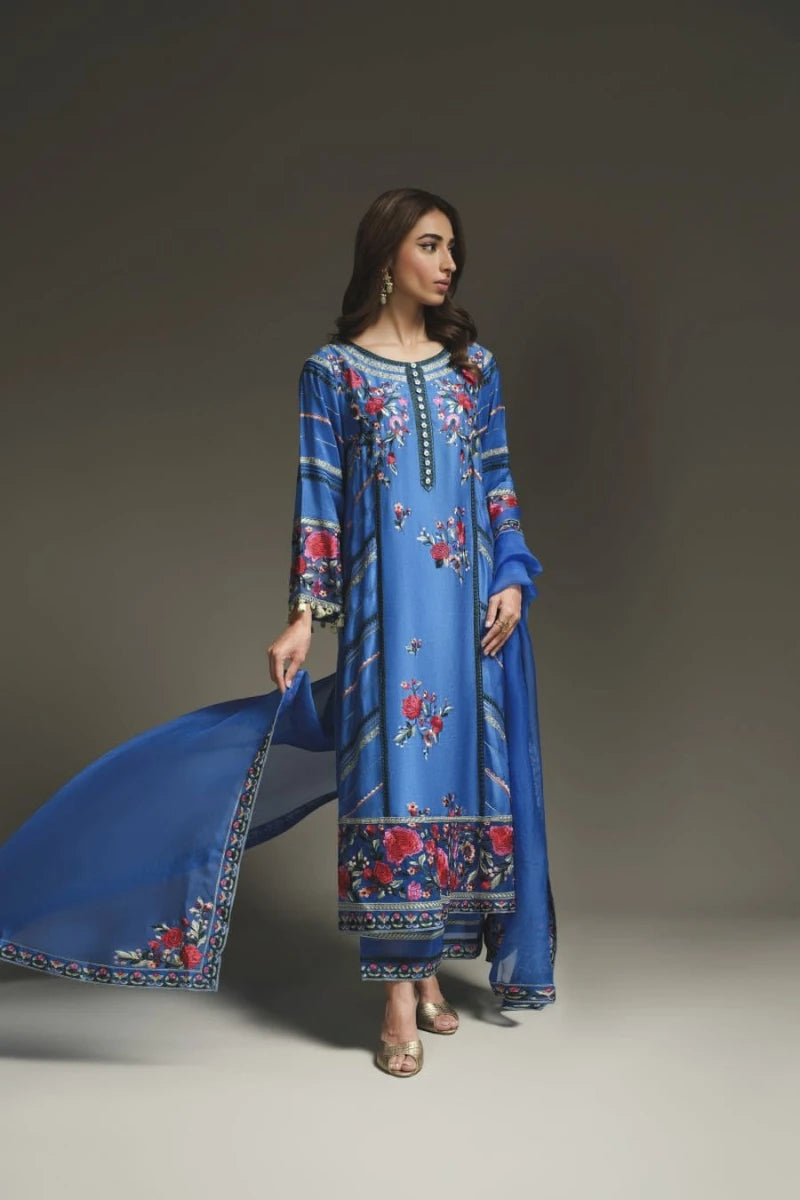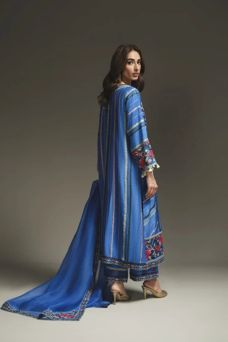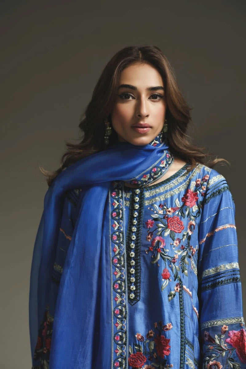 This stunning blue outfit features vibrant multicolored floral embroidery, with bold red roses as the highlight. The long kameez, made of pure raw silk, is adorned with intricate multi gara floral patterns on the front, sleeves, and hem, complemented by diagonal striped accents. Paired with matching embroidered trousers, also crafted from pure raw silk, and a pure organza dupatta with embroidered borders all around, this ensemble offers a perfect blend of elegance and festive charm.