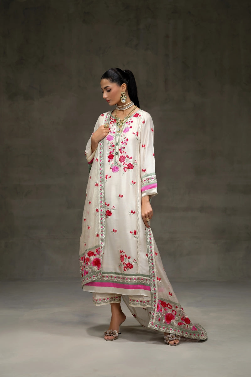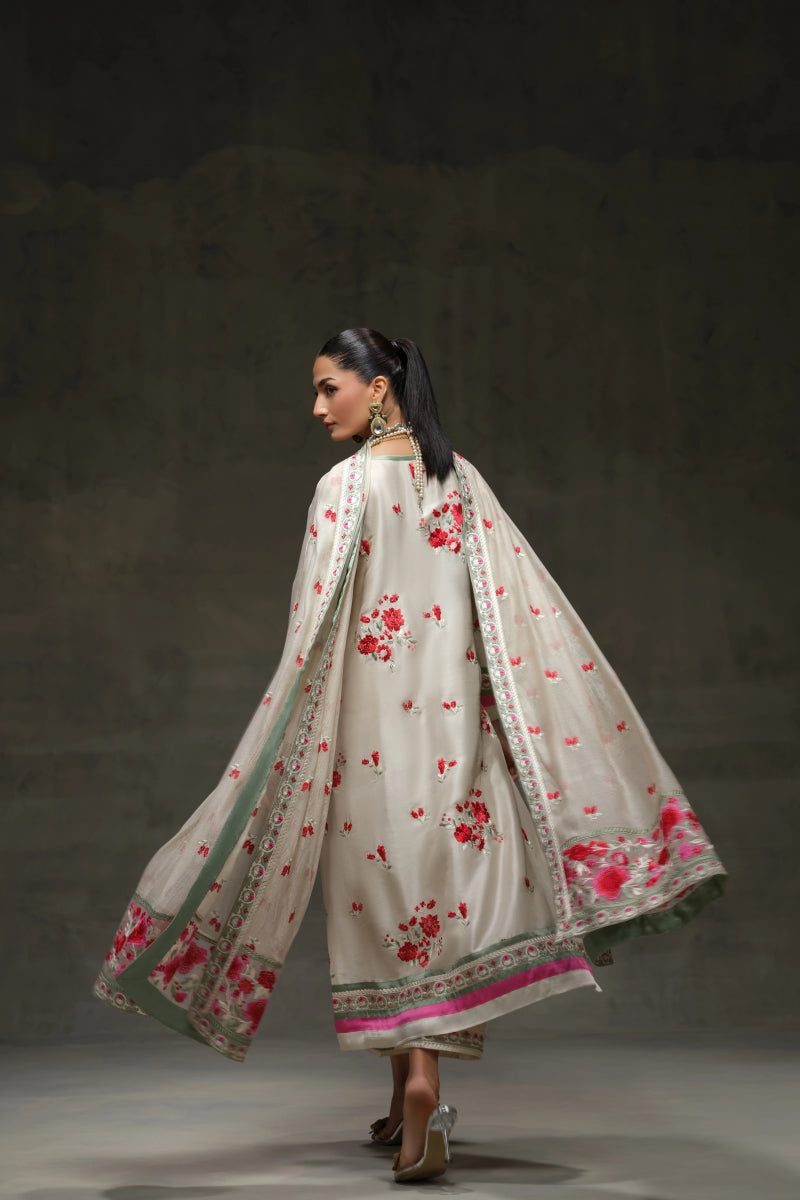 An ethereal ensemble featuring a pure raw silk shirt paired with a pure crepe shalwar, adorned with intricate multi-thread embroidery. The look is completed with a delicate pure silk organza dupatta, gracefully embellished with embroidered floral details.