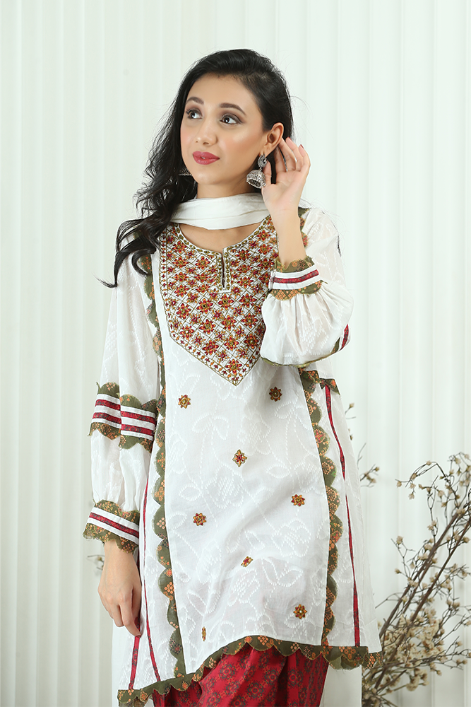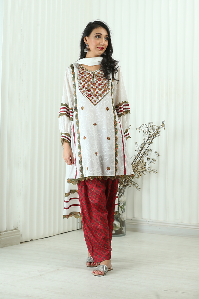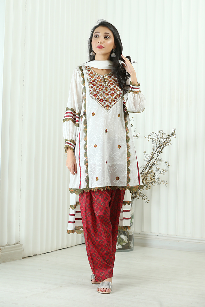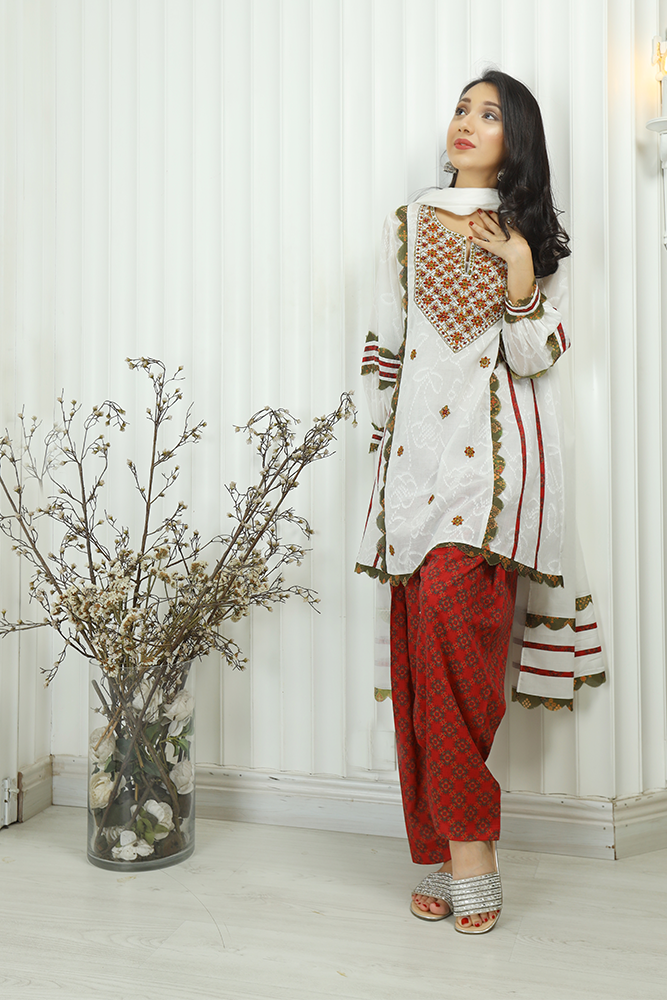 Description: The white angelic embossed ensemble, for young souls, is a perfect mix of cool and classy. The cotton shirt is embellished with exquisite mirror embroidery on the neckline. The enchanting attire is complemented with bright-colored shalwar.