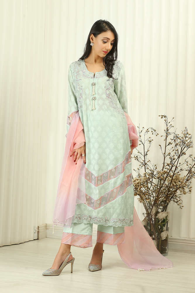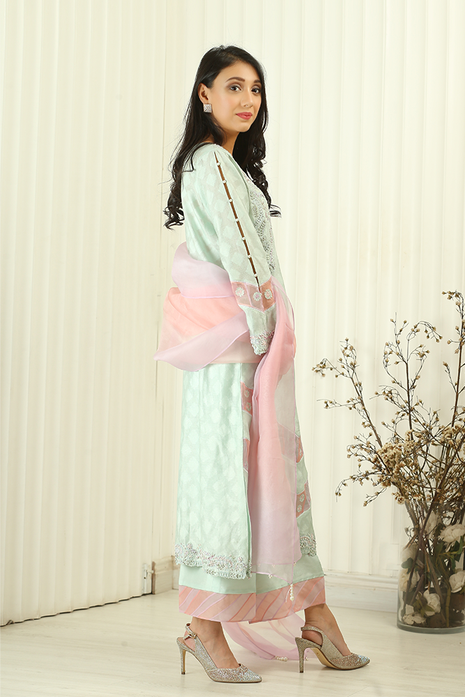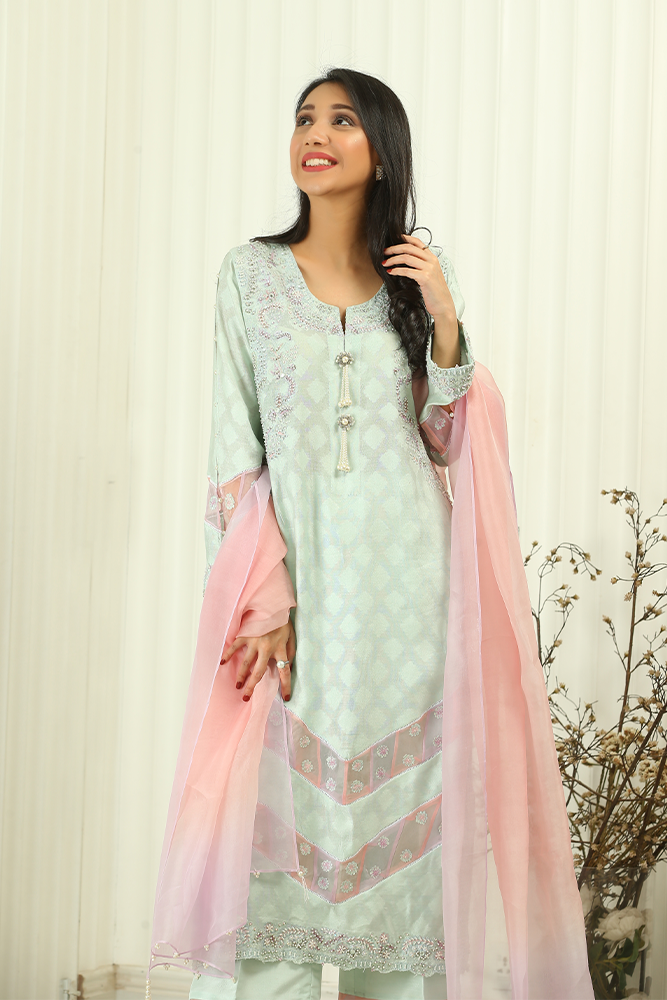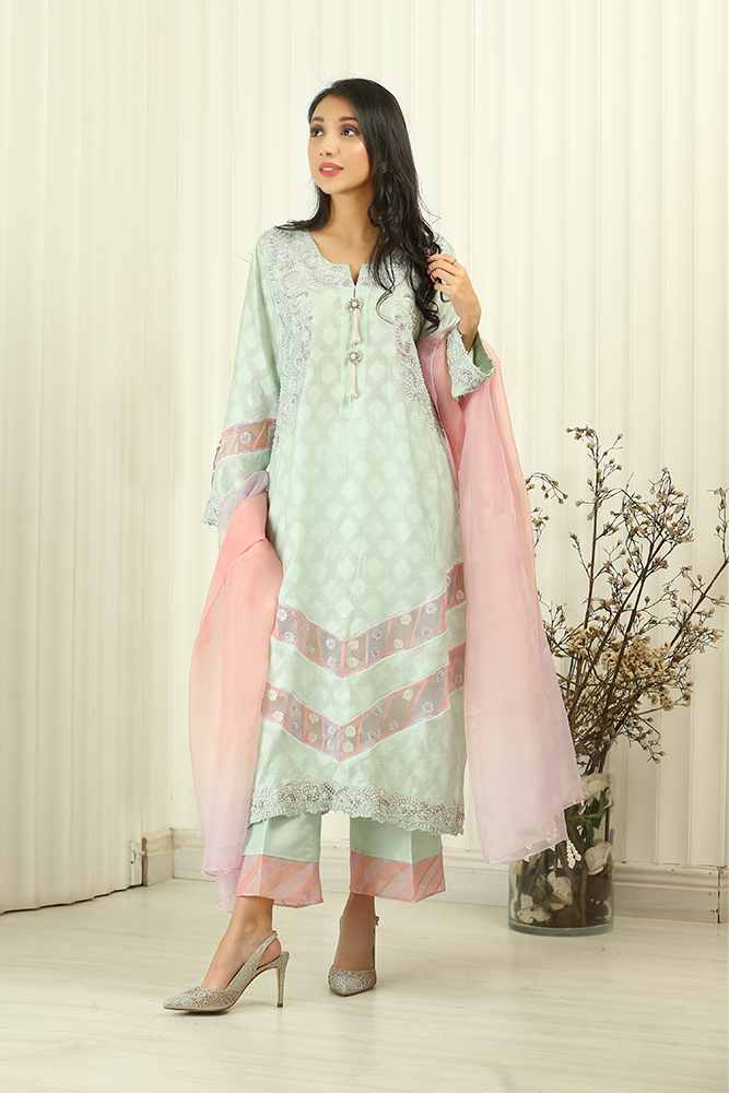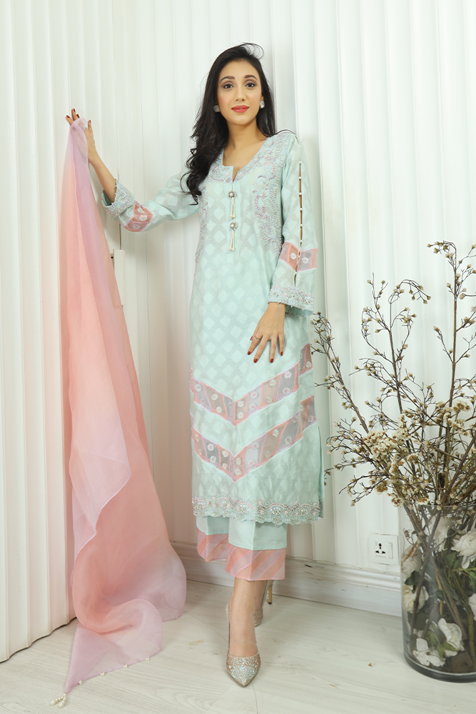 Description: The Aqua blue embossed silk net shirt shows off sophistication and the elegant Organza shaded dupatta with pearl embellishments will make you stand out in the crowd. The attire has intricate embroidery on the neckline which is eye-catching and flattering and a perfect choice for you this season. The cool summer ensemble is adorned with organza inlay borders on the shirt and is paired up with an azaar.