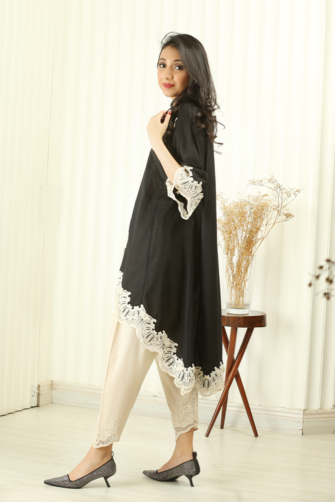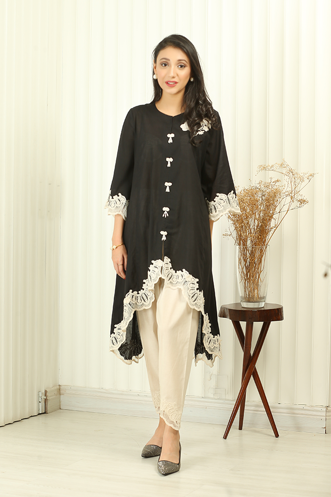 Description: The black, high front low back, tunic is your go-to summer dress as it will keep you cozy and stylish all day. The carefree and effortless ensemble with beige lace appliqué exudes a cool vibe which perfectly goes with the season. The pearl embellished detail on the neckline is pure flattering. Lastly, the attire is complemented with shalwar which makes this a perfect dress which will stand out and turn heads.
