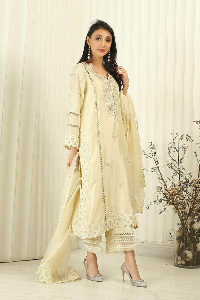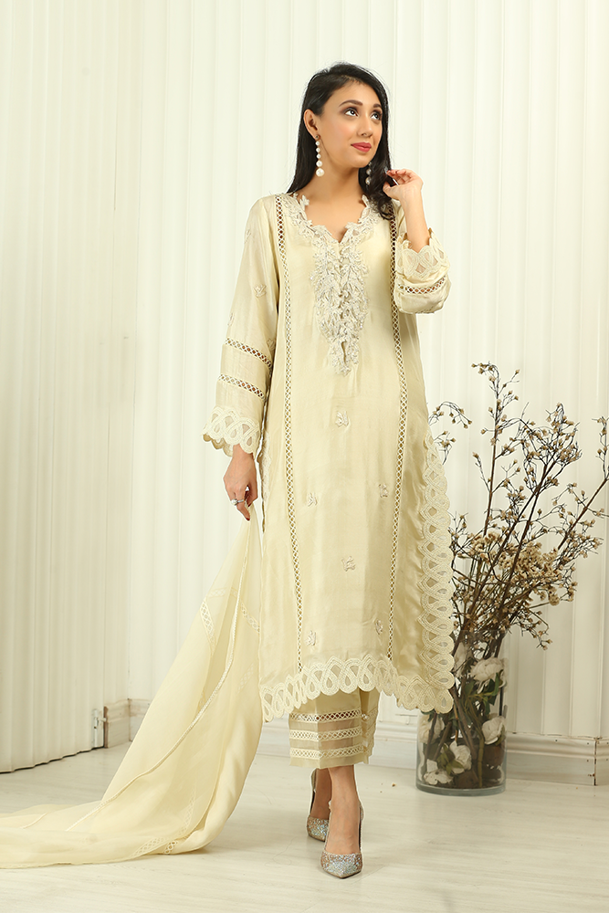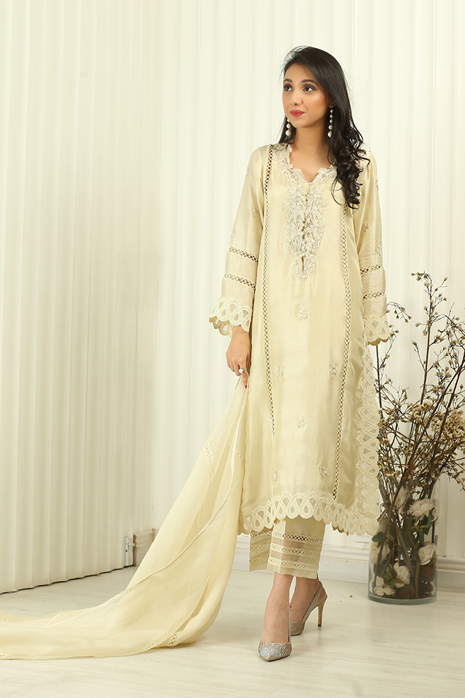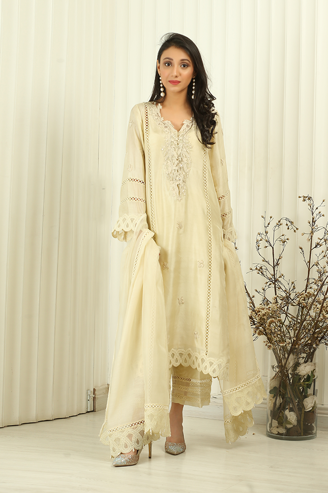 Description: This silk net shirt flaunts your elegance. The Organza dupatta with pearl embellishments will make you catch everyone's eye. The clothing has complex weaving on the neck area which is attractive and complimenting and an ideal decision for you this season. Just Dwell into this stunning chic outfit to welcome the ethereal vibe of the season.