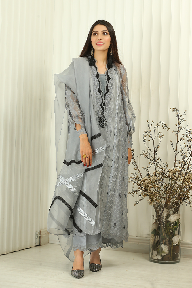 Description: The dreamy grey-shaded organza pleated long shirt is a classic work. The mesmerizing ensemble with delicate self-colored embroidery detail on the neckline is a pure fashion statement . Paired up with pure silk trouser that is with grey and black organza details this attire .