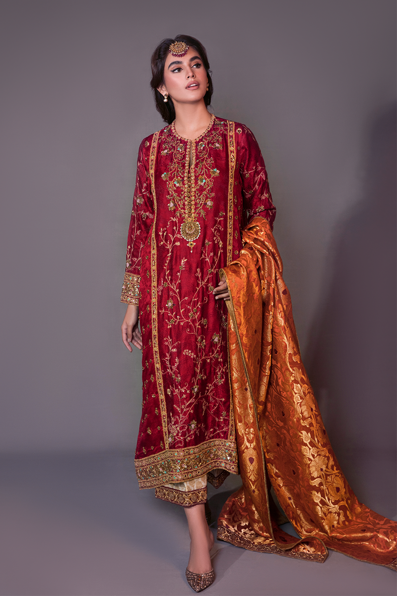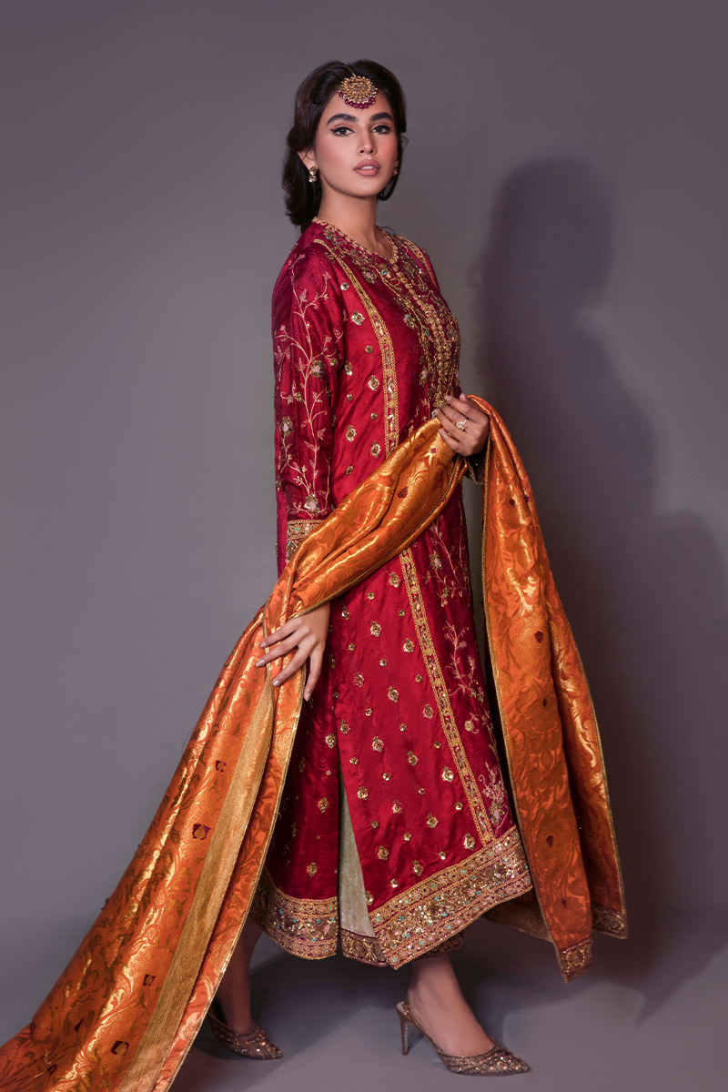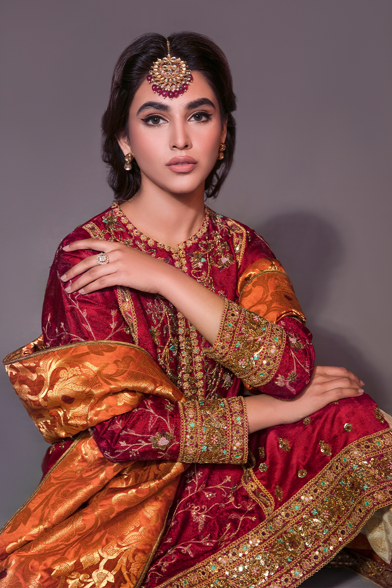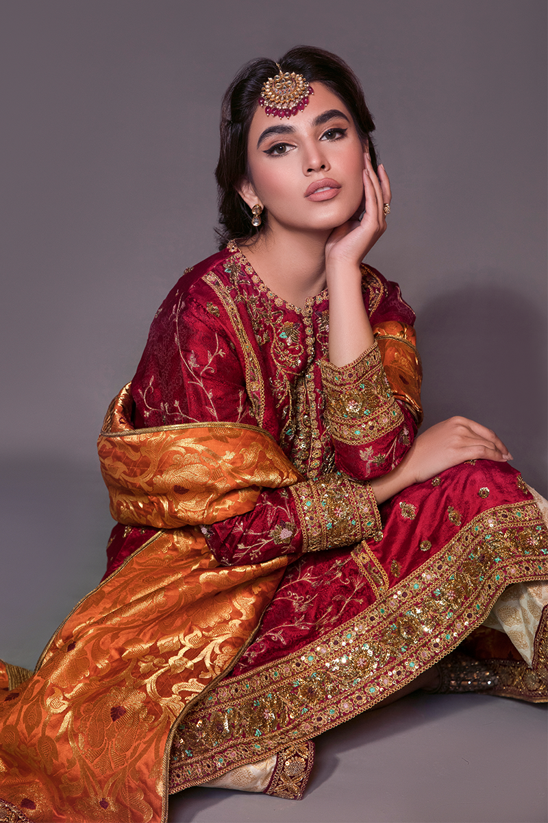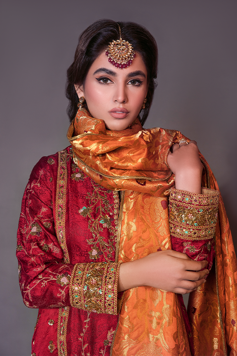 “Gulaal” an opulent ensemble, in a deep radiant red self-embossed Jamawar. A truly regal shirt, brimming in an intricately handworked floral pattern in marori, dabka, and sequence. Paired with a rust khamkhab chaddar and a white kamkhaab azaar further enhances the grandeur of this majestic beauty.
