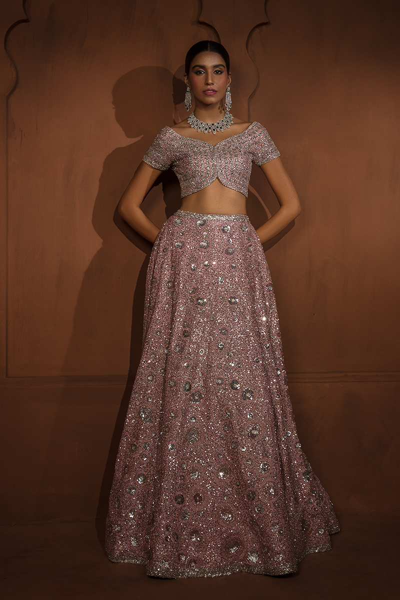 Description: “GULE-ISFAHAN”, the Bridal Lehnga Choli that embraces modern glamour, will leave you spellbound with its contemporary allure. The Silk Choli, exuding sophistication, adorning exquisite craftsmanship in silver perfectly complements the Silk Net Lehnga with based entirely on thread work enhanced with sequins, crystals, and pearls, like a night sky studded with glimmering stars. The Net Dupatta, adds a touch of ethereal elegance, creating a harmonious symphony of beauty.