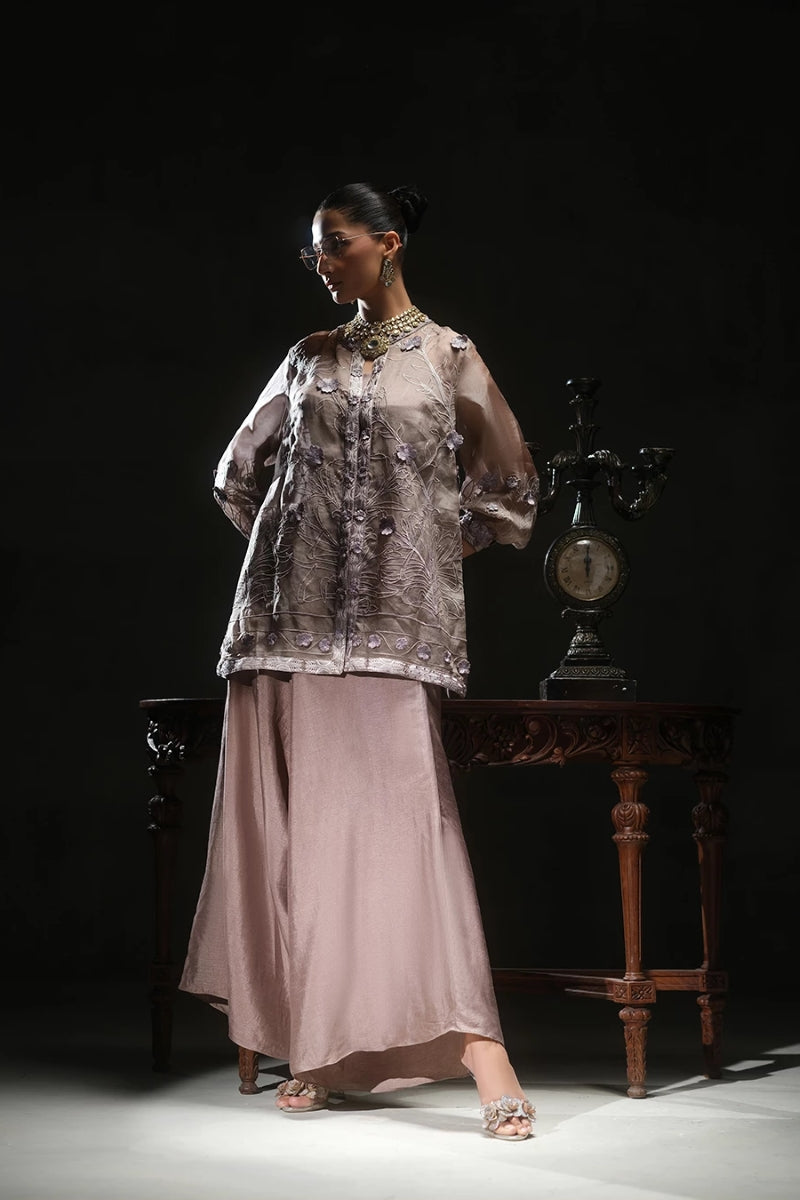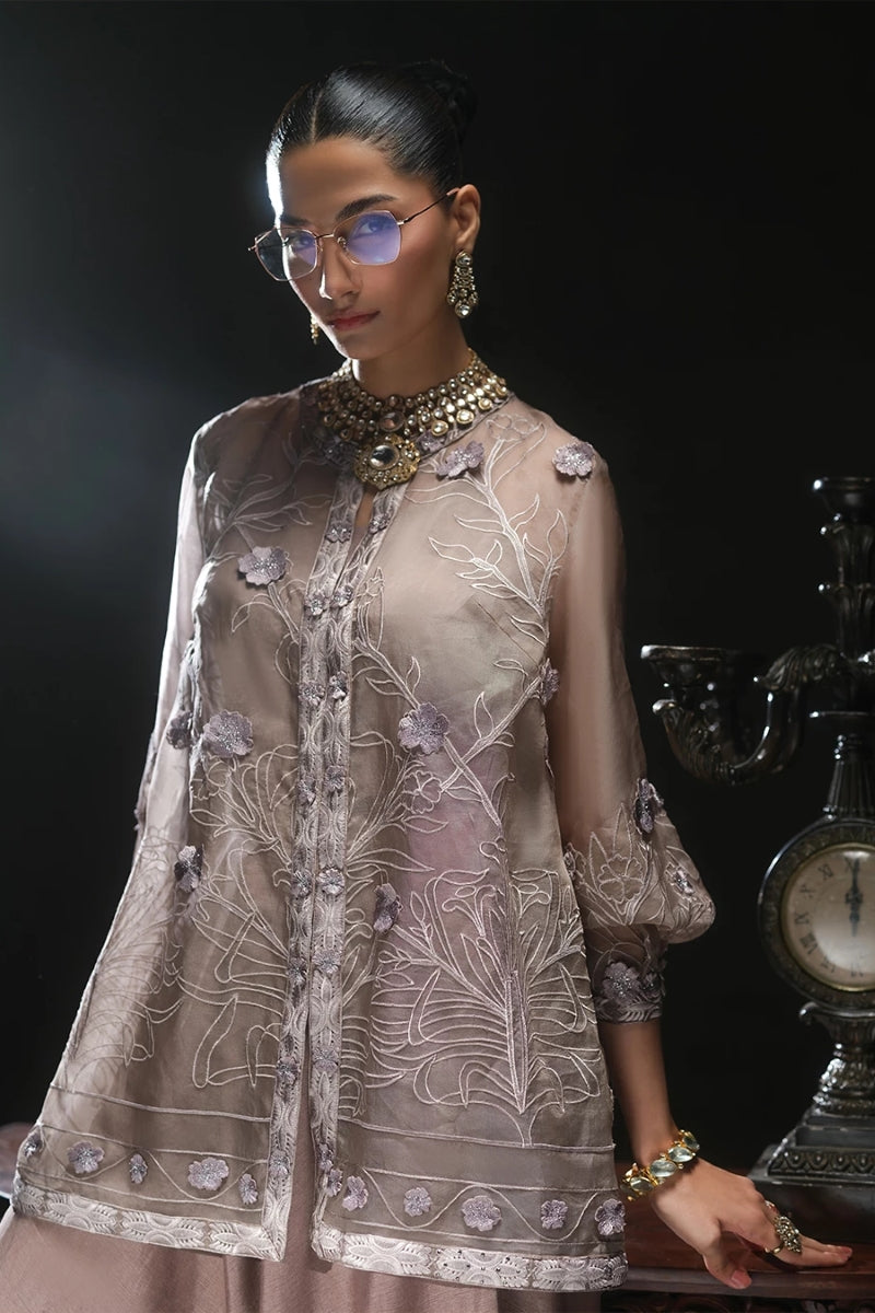 A pure organza front-open short jacket adorned with silver appliqué roses and delicate self-embroidery, paired with a pure crepe slip and wide-leg trousers for an effortlessly elegant look.