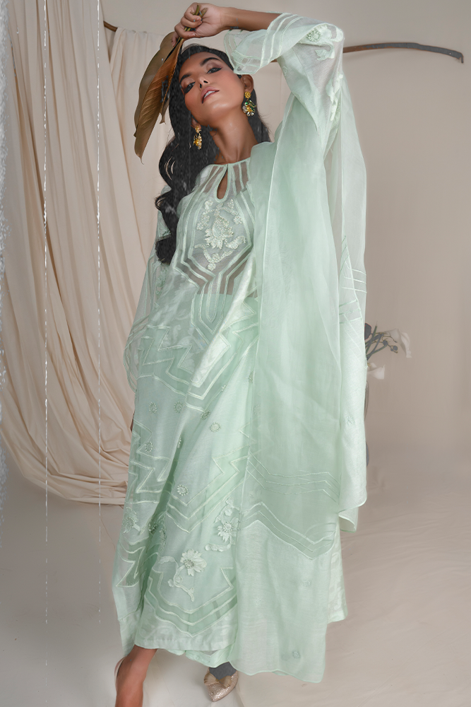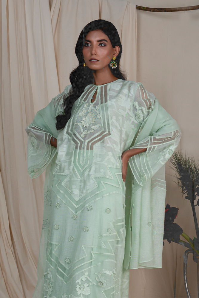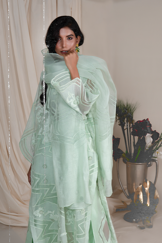 Description: An exquisite ensemble made on a subtle self embossed woven fabric. With an inlay of silk organza forming a striking and encapsulating pattern with self-colored detailing.