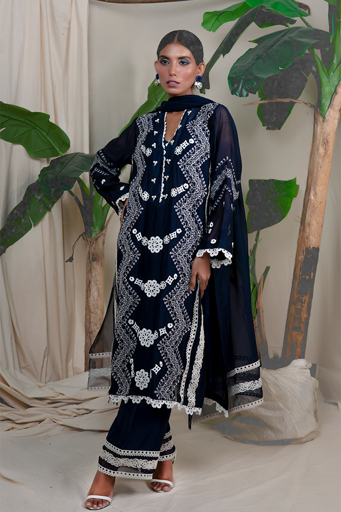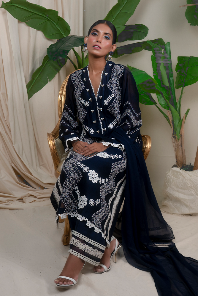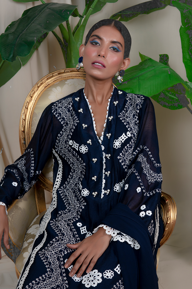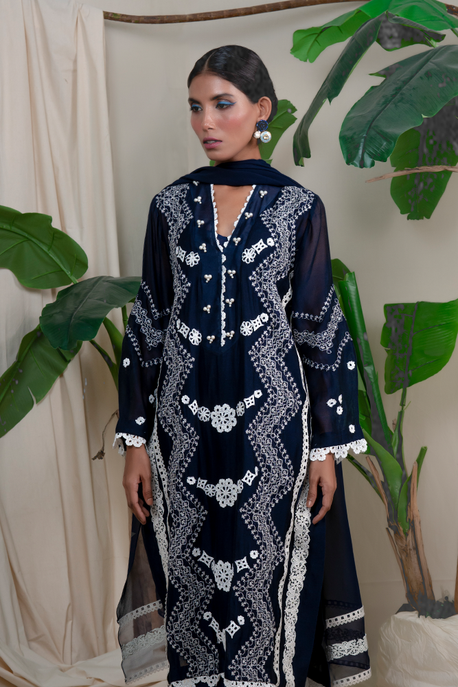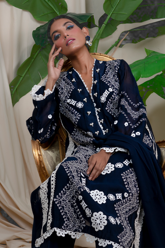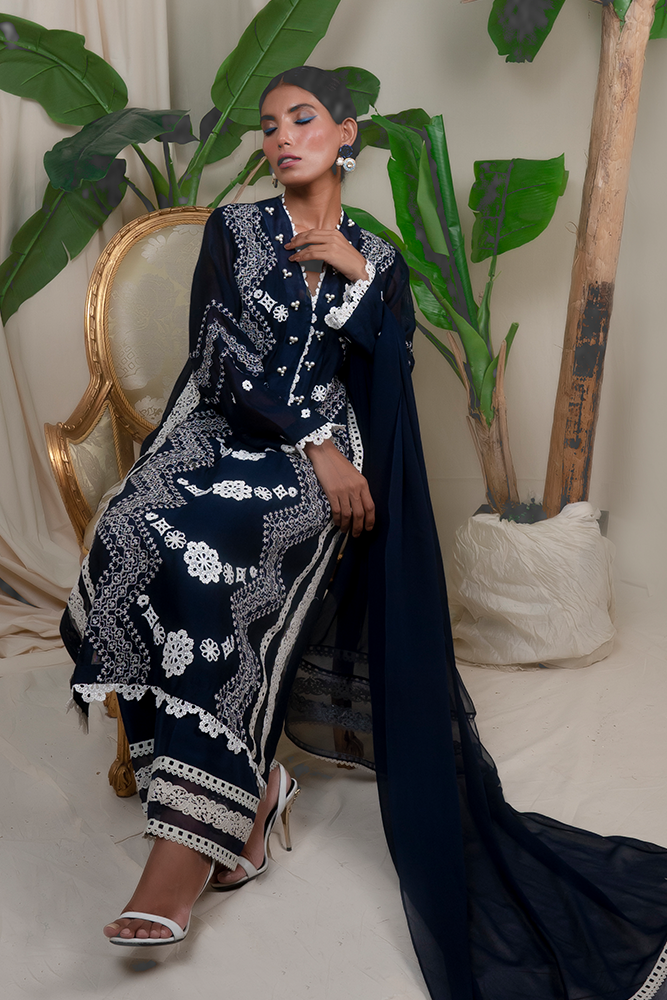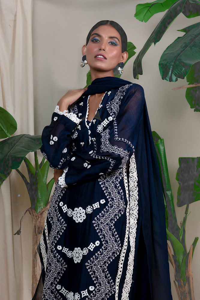 Description: Wondrous ethos of ravishing navy blue emits mystique romance, head-turning embroidered details on luxe cotton net, leaving an awe-struck impression in an understated manner.