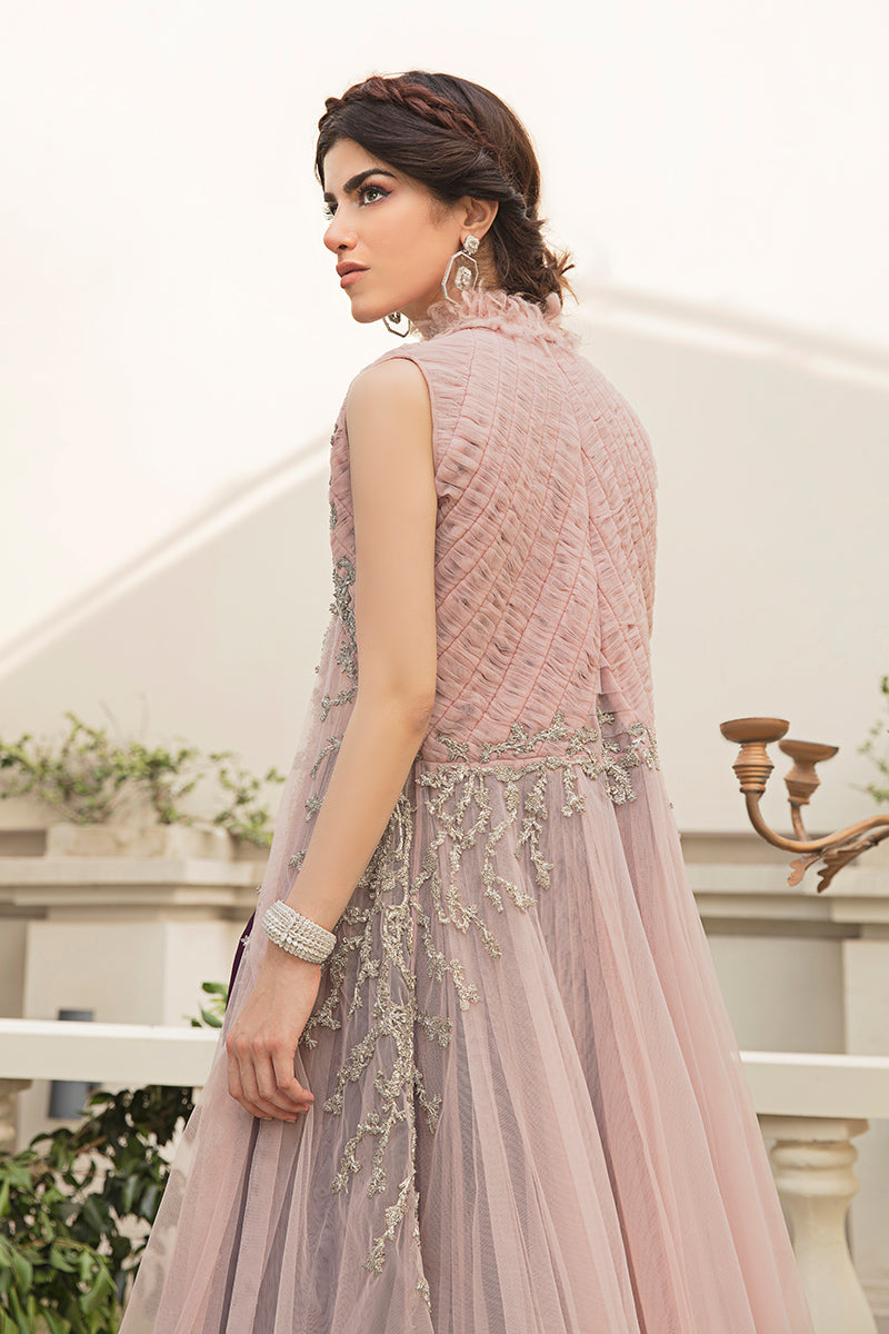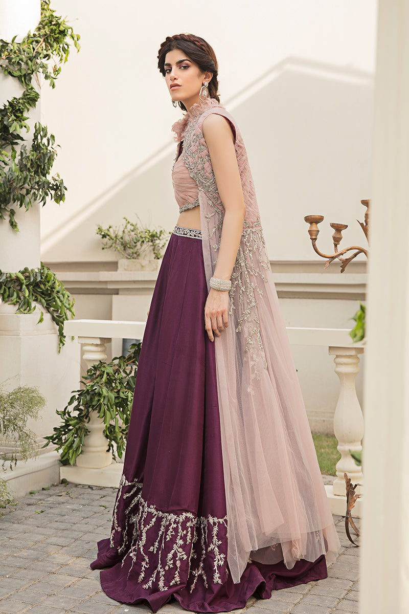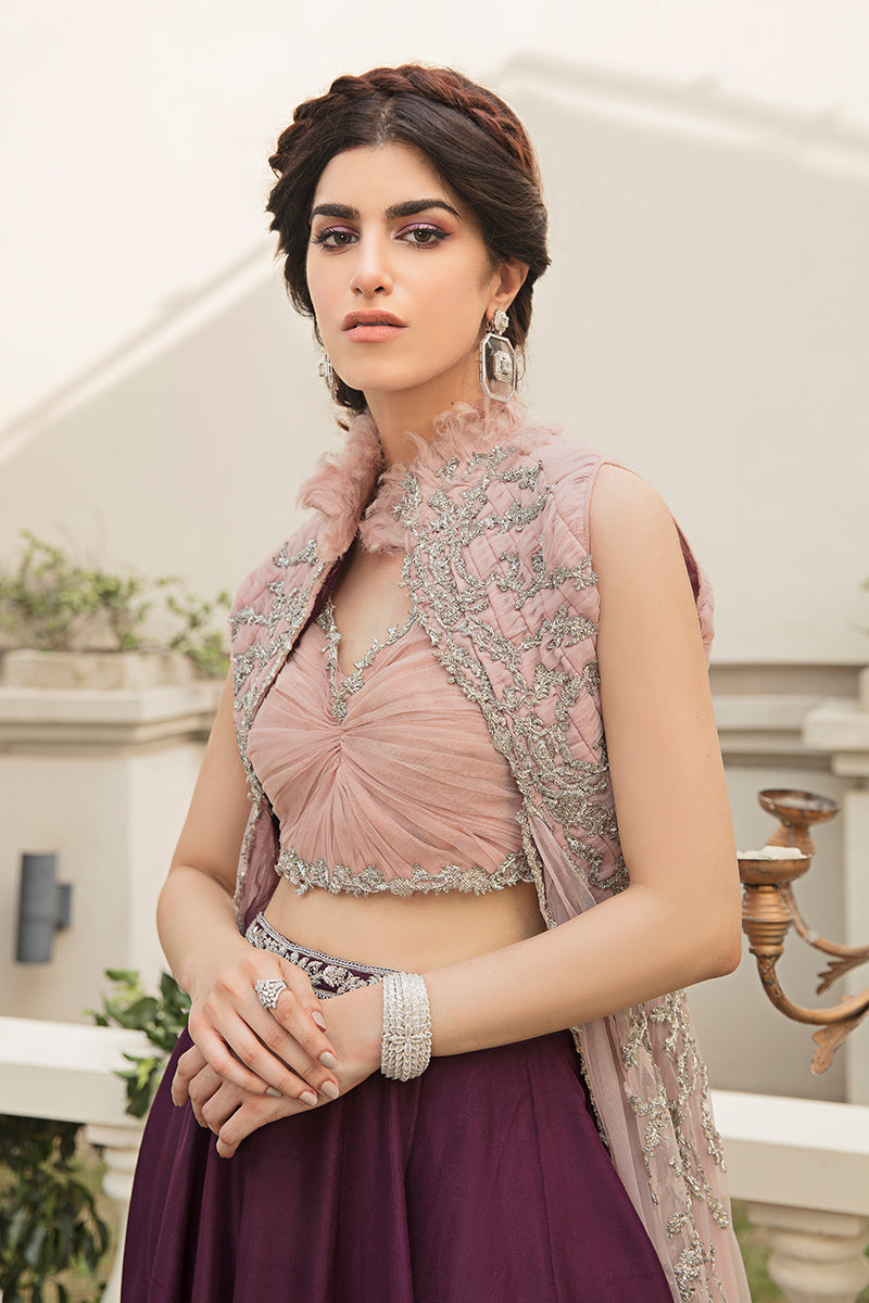 Description: Every aesthetic detail of the ‘Jasmine’ infuses exquisite craftsmanship with modern glamour. Here is the interaction between pink tulle pleated jacket and blouse with delicate hand worked embroideries of kora dabka, naqshi, and sequins that stand testament to design houses mastery over materials and timeless craftsmanship. It is paired with this delicately worked purple lehnga merging traditional embroideries with a modern sensibility.