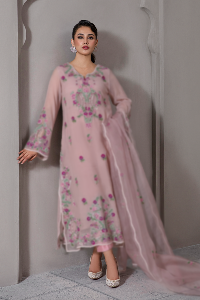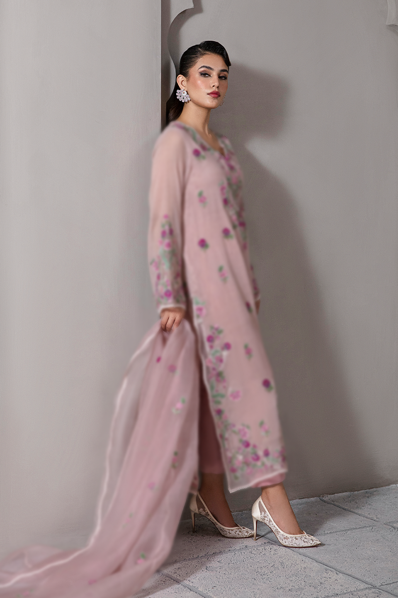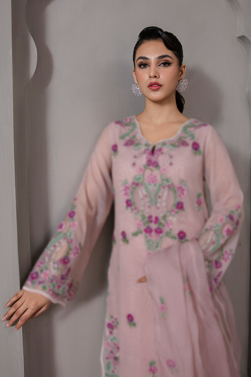 Description: Laila's enchanting color combinations and detailed threadwork embrace the true essence of celebration. The delicate interplay of light and dark pinks on the overall shirt creates a captivating visual symphony, evoking a sense of joy. Every thread of the beautiful floral pattern is meticulously embroidered, each stitch a testament to the skilled hands that brought this masterpiece to life. Paired with the elegance of raw silk pants and the ethereal grace of the embroidered organza dupatta with its flower chan, adds beauty, artistry, and the spirit of togetherness.