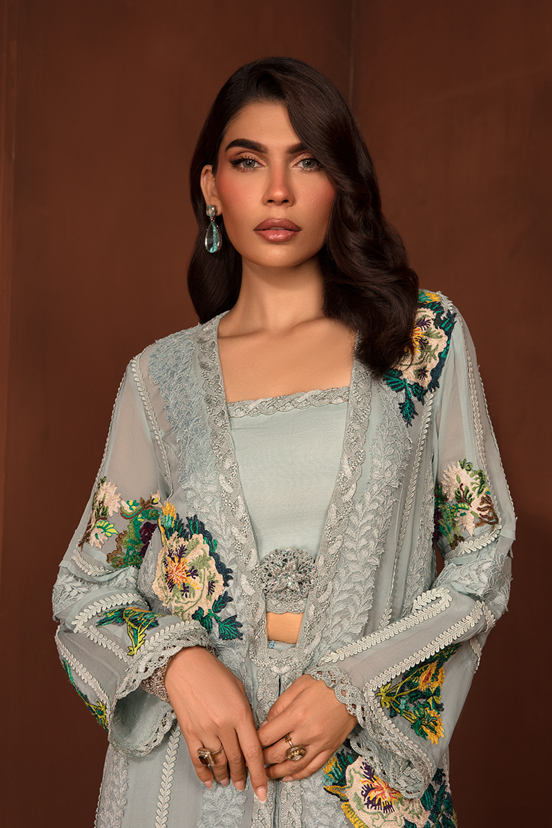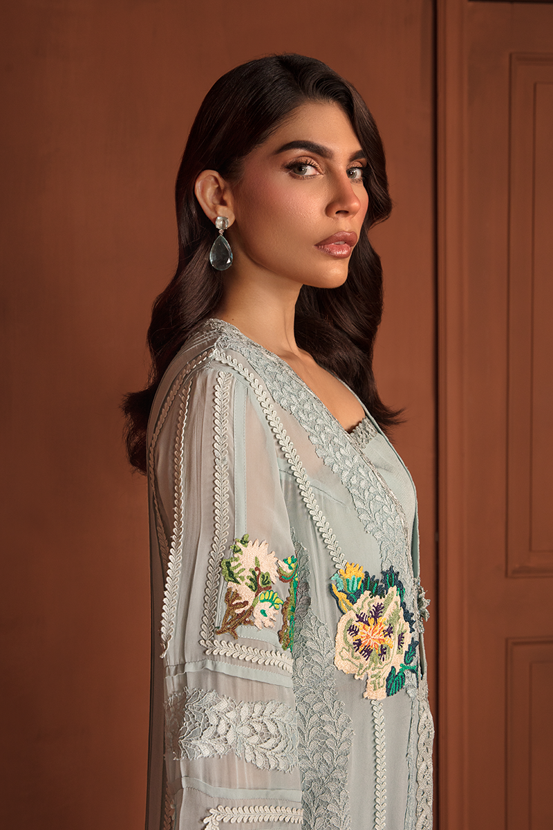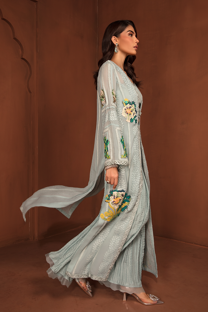 Description: Experience the magic of floral dreams with "LANA" on a gorgeous Blue base. The chiffon shirt is adorned with exquisite net lace detailing and embroidered multi-colored flowers, creating a vision of ethereal beauty. Paired with raw silk trousers and a chiffon dupatta. Chanting an orchestra of floral melodies, Lana is artisanal and trendy.